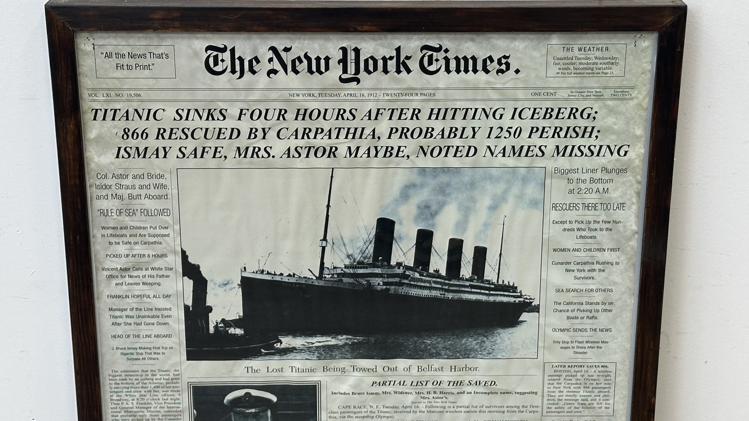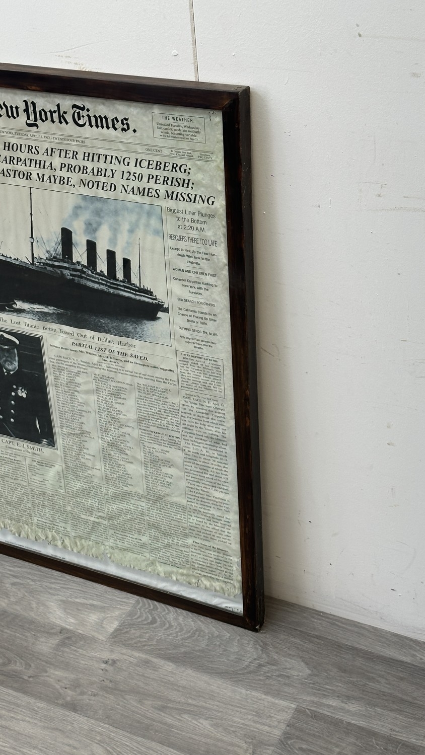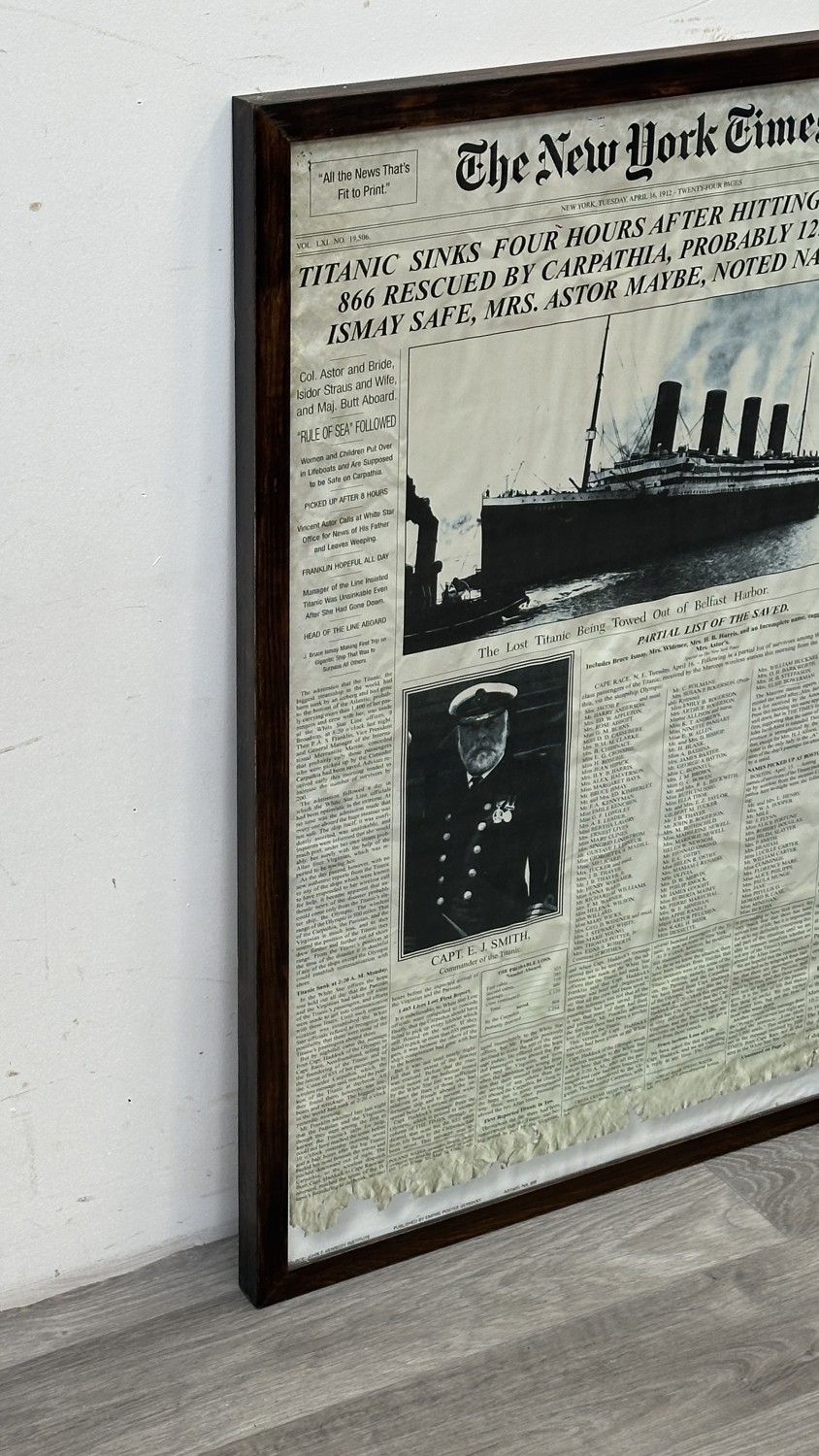 A framed reproduction The New York Times 'Titanic' Tuesday, April 16th, 1912 newspaper print, published by Empire Poster Germany - approx. 87cm high x 61cm wide