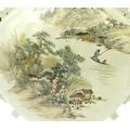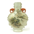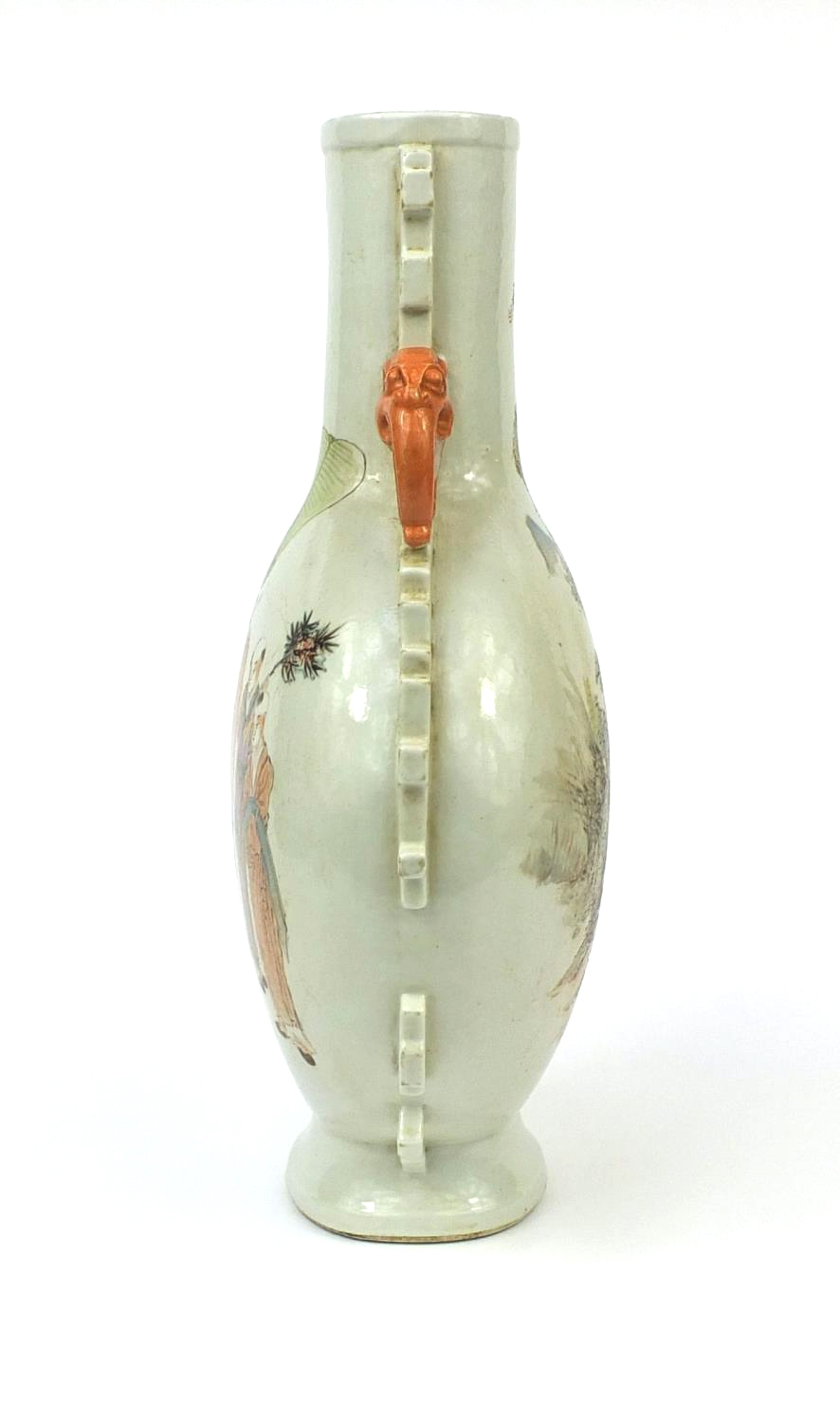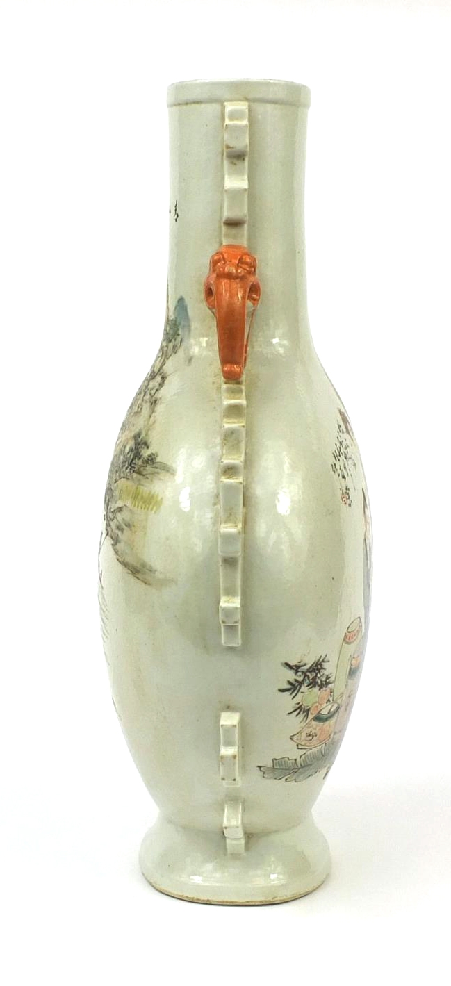 Large Chinese porcelain moon flask with elephant head handles, hand painted in famille rose palette with a river landscape, figures and script, 44cm high
