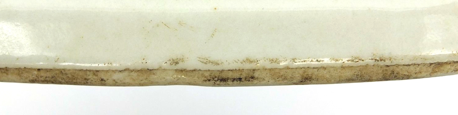 Overall in generally good condition, there is a 2cm hairline crack which runs around the relief decoration just below one handle, otherwise there are no other chips, cracks or restoration. There is general scratching to the glaze all over.