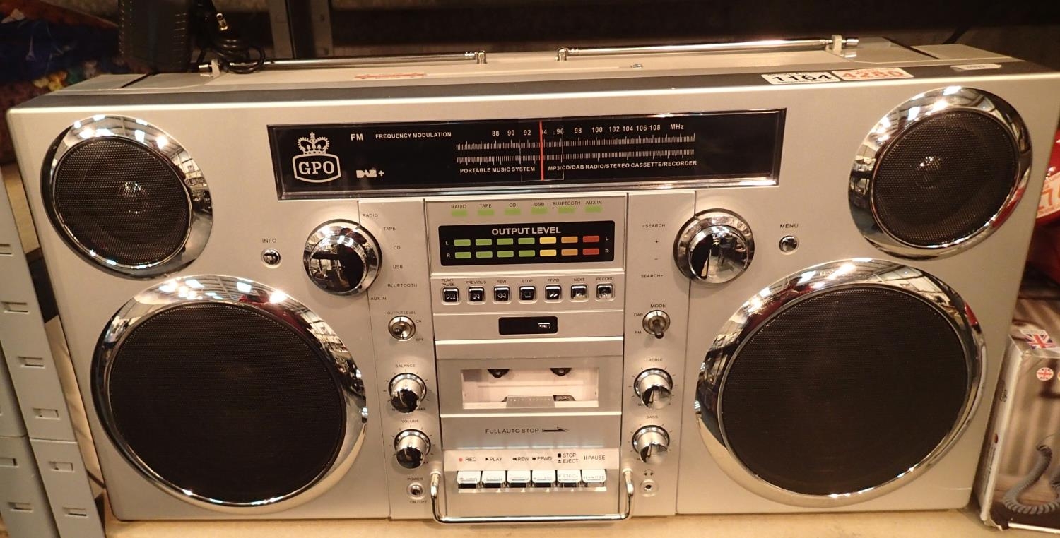 Silver, GPO Brooklyn large 1980s-Style Boombox - CD, cassette, DAB+ & FM Radio, USB, Bluetooth receiver; 30 x 19 x 60 cm; working at time of