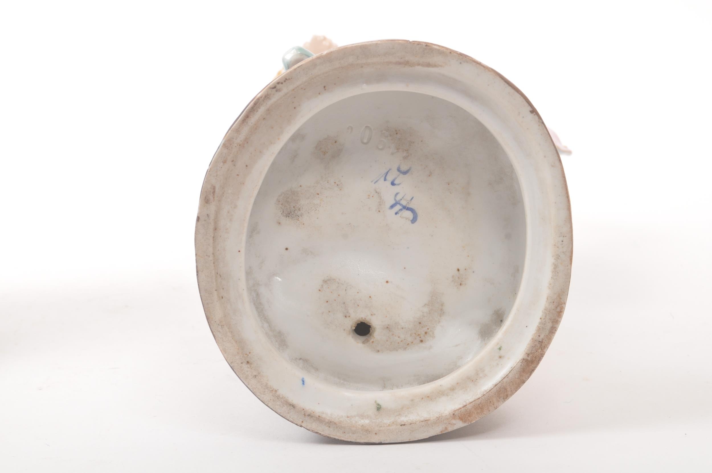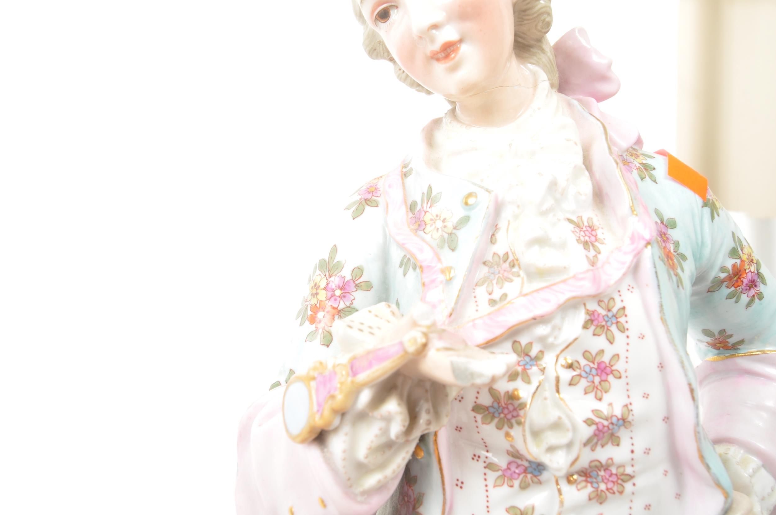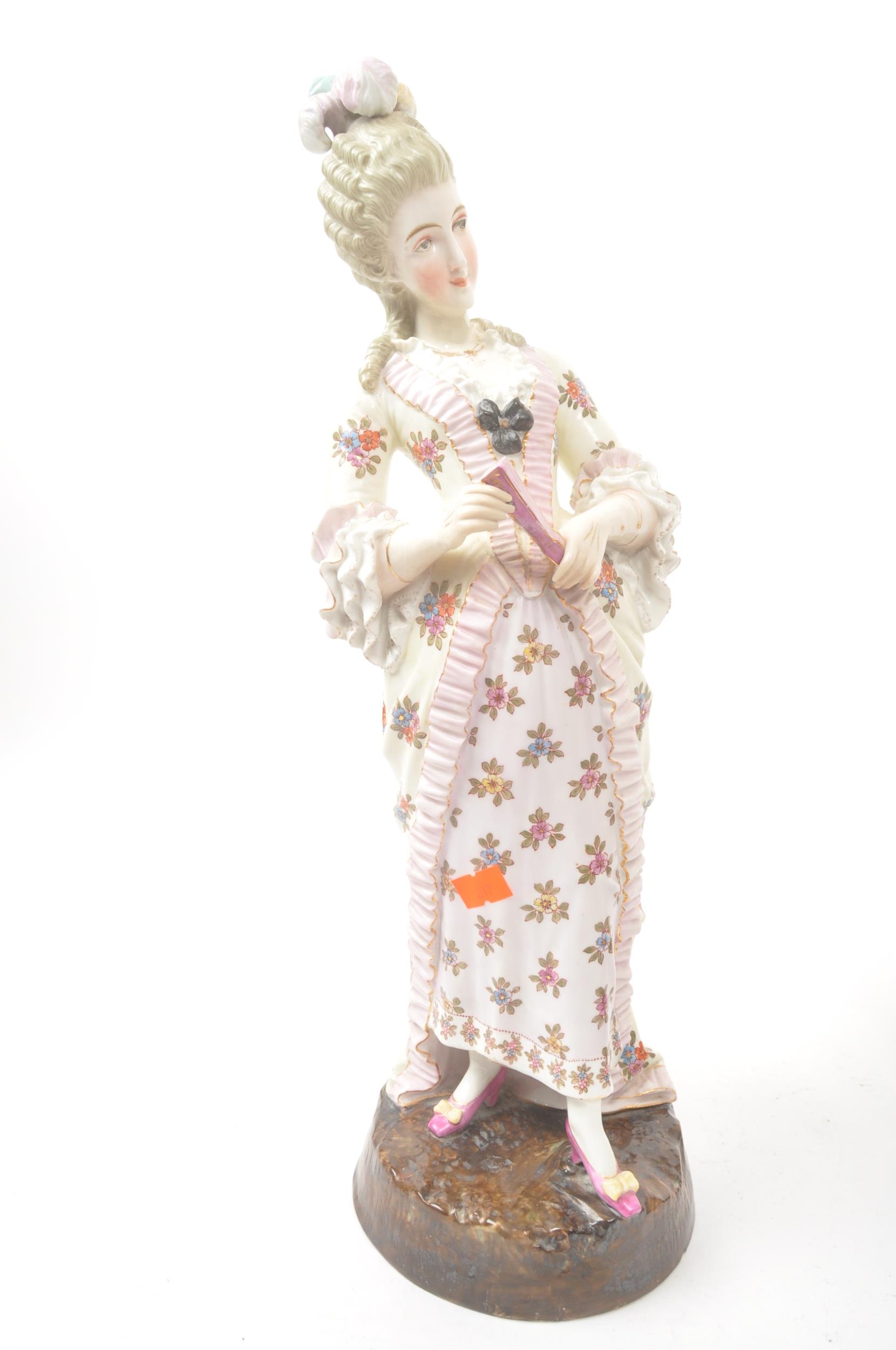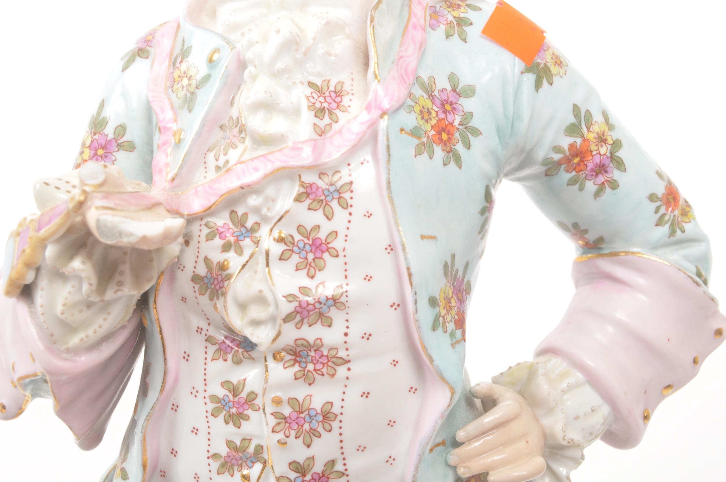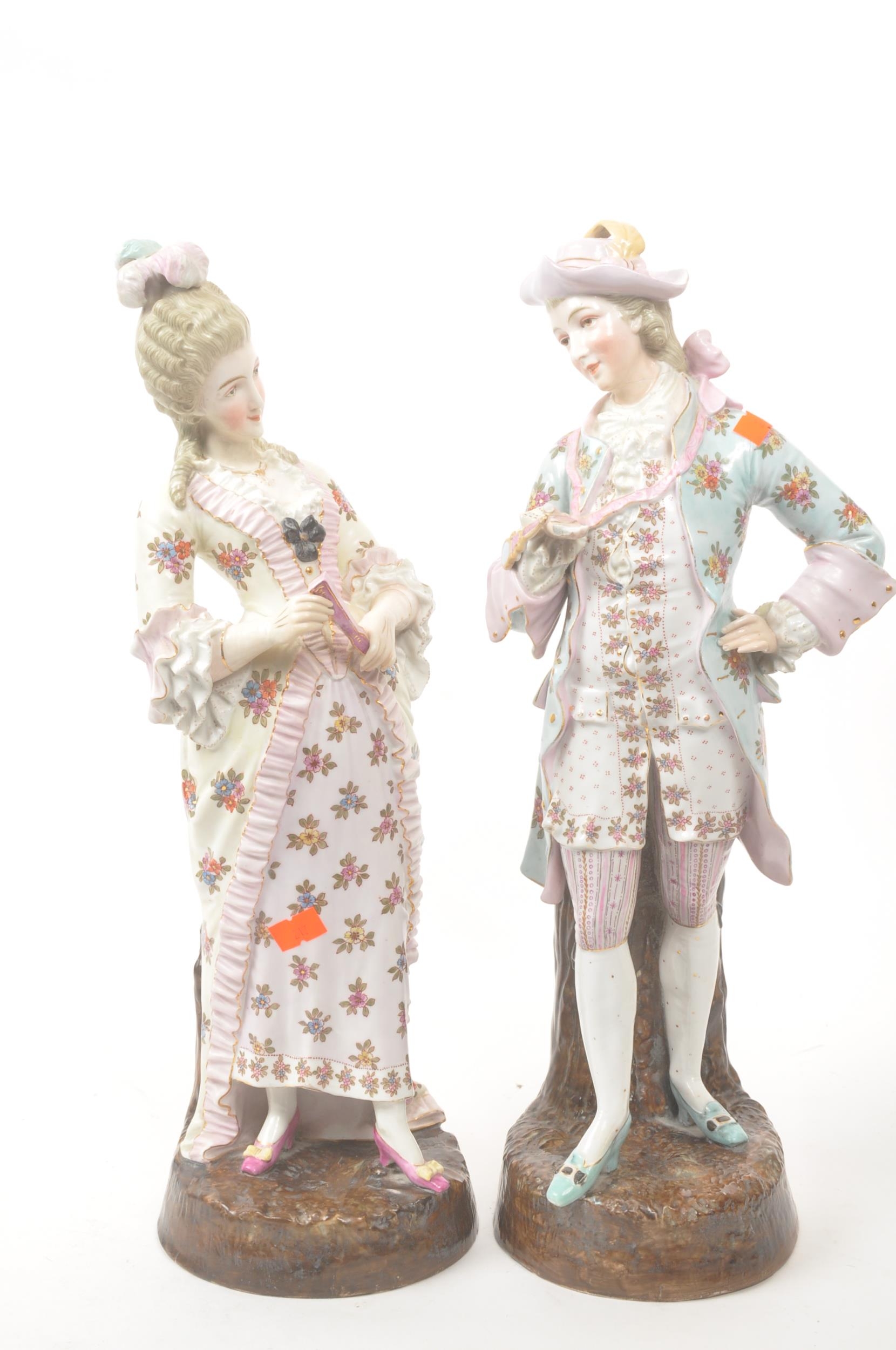 A pair of 20th century Meissen manner German Continental porcelain figures. The figures, one of a lady the other a gentleman, stood on naturalistic bases each dressed in traditional garments adorned with floral motif decoration. Tallest measures approx. 43cm tall.