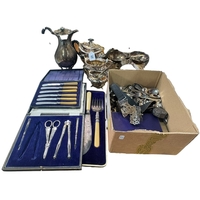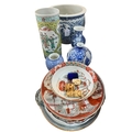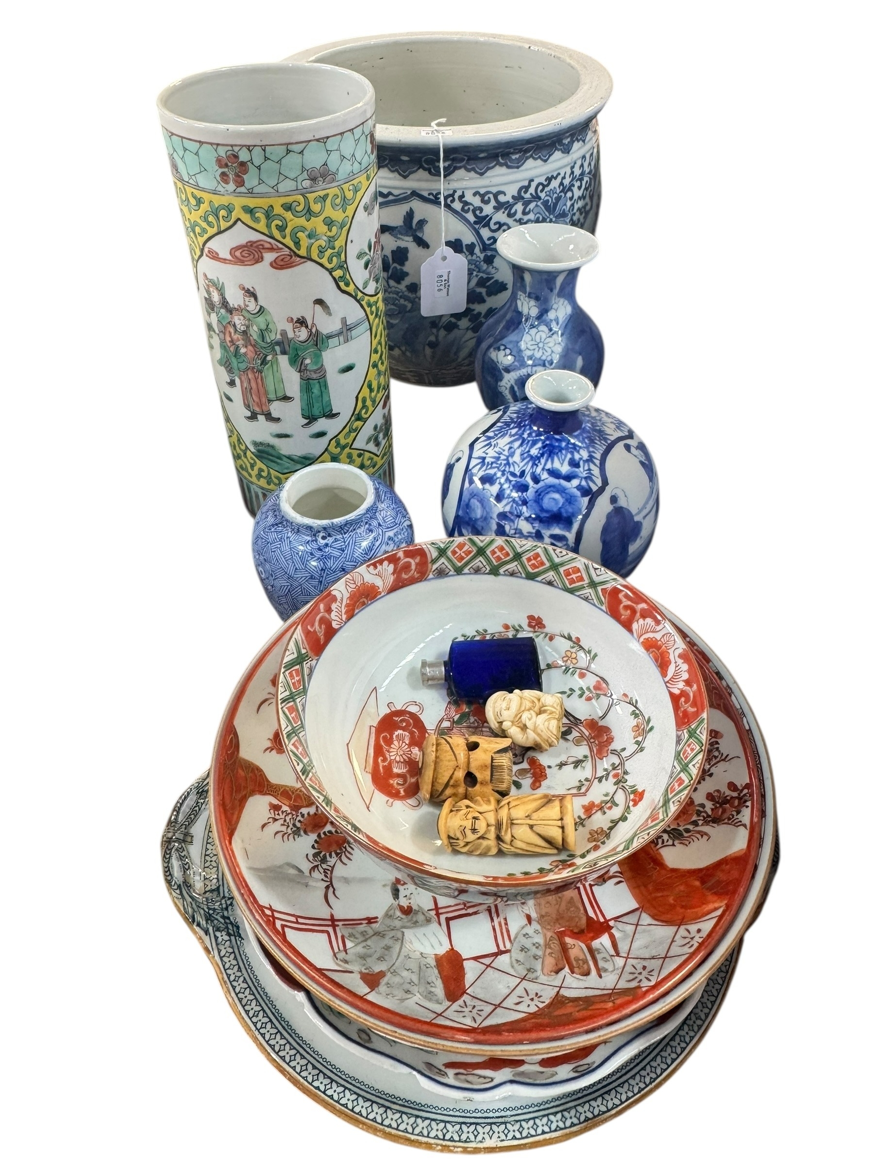 Oriental blue and white planter and three vases, Chinese cylindrical vase, Imari and other plates, three Netsukes, etc.