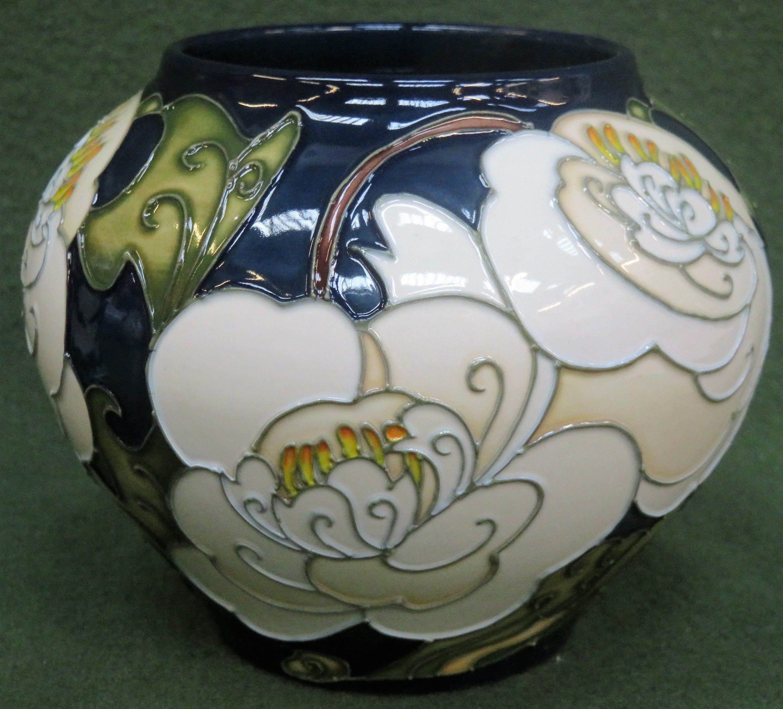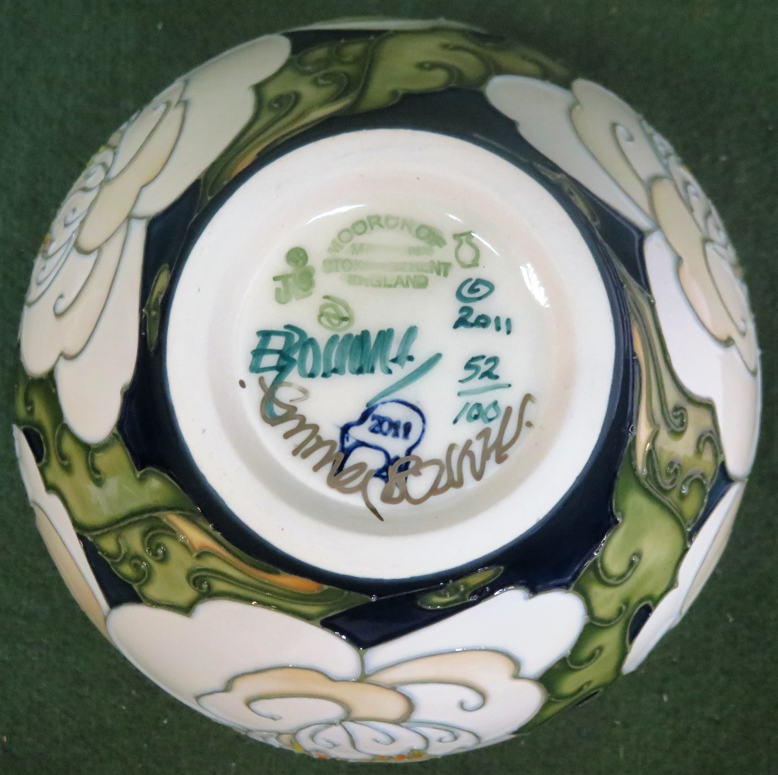 Moorcroft limited edition tube lined and glazed ceramic 'Camellia' pattern vase, signed to base by Emma Bossons, No. 52/100. Approx. 11cms H
