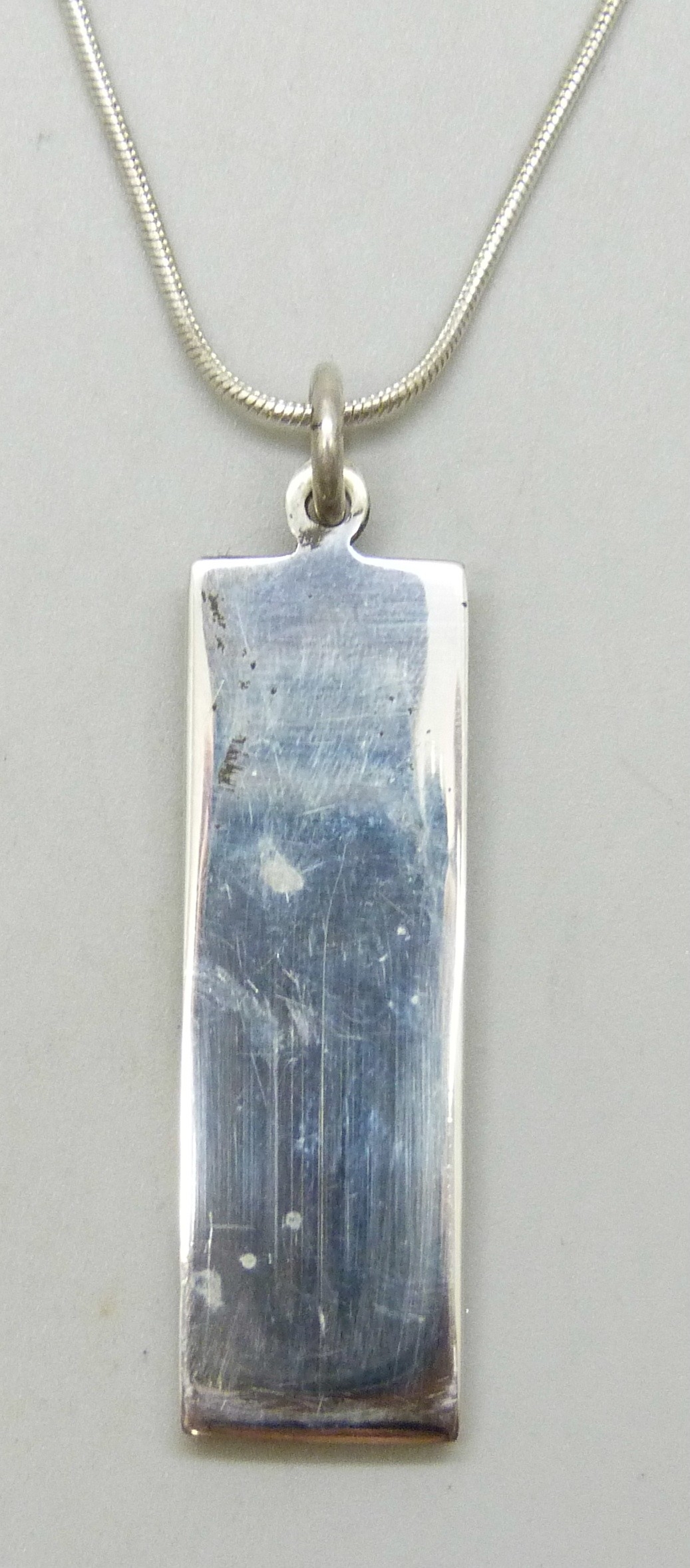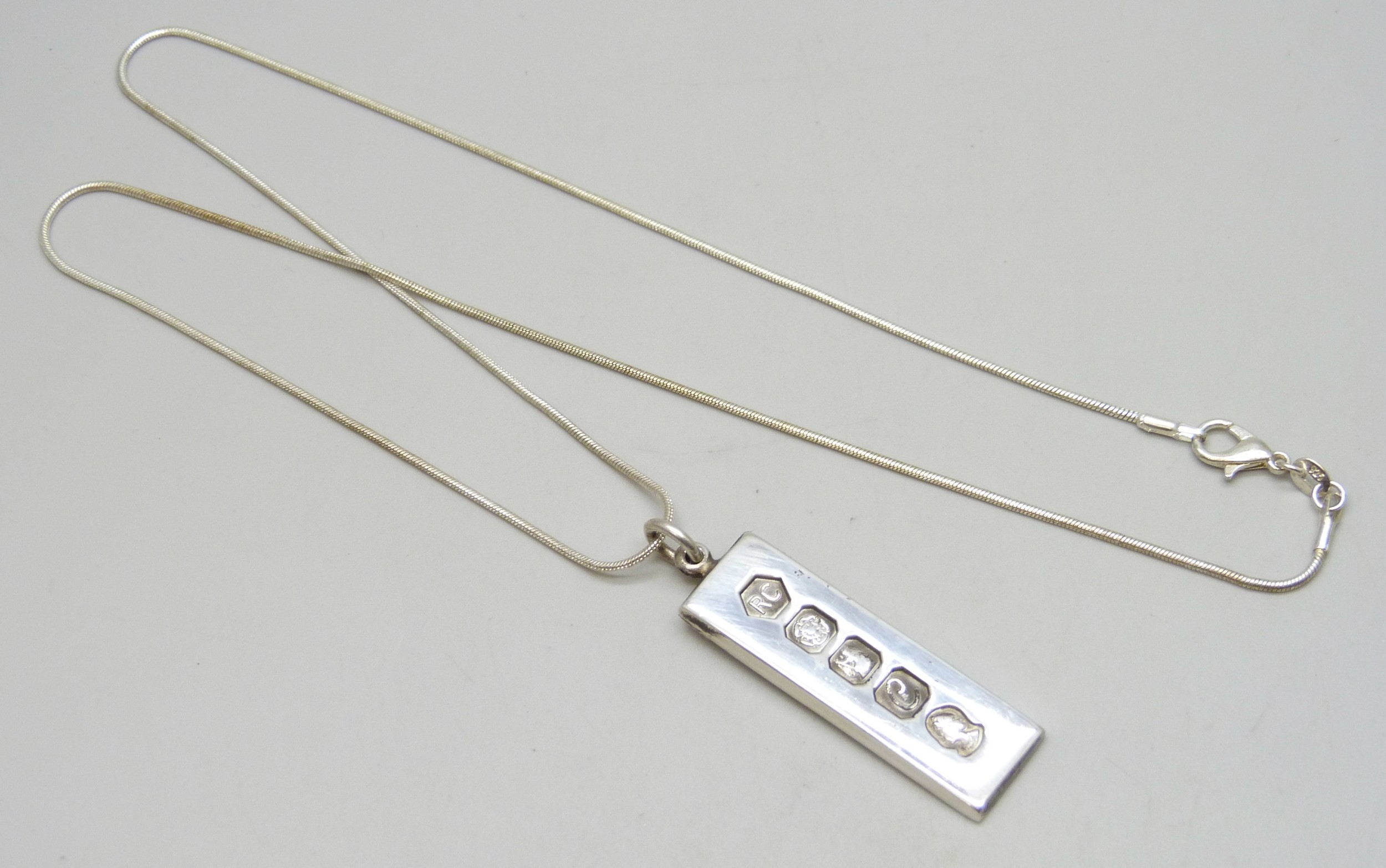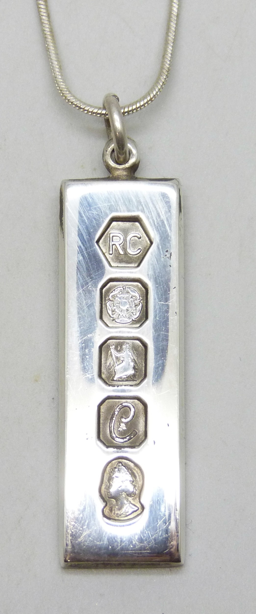 A silver ingot pendant, 16g, 5cm including bail, on a plated chain