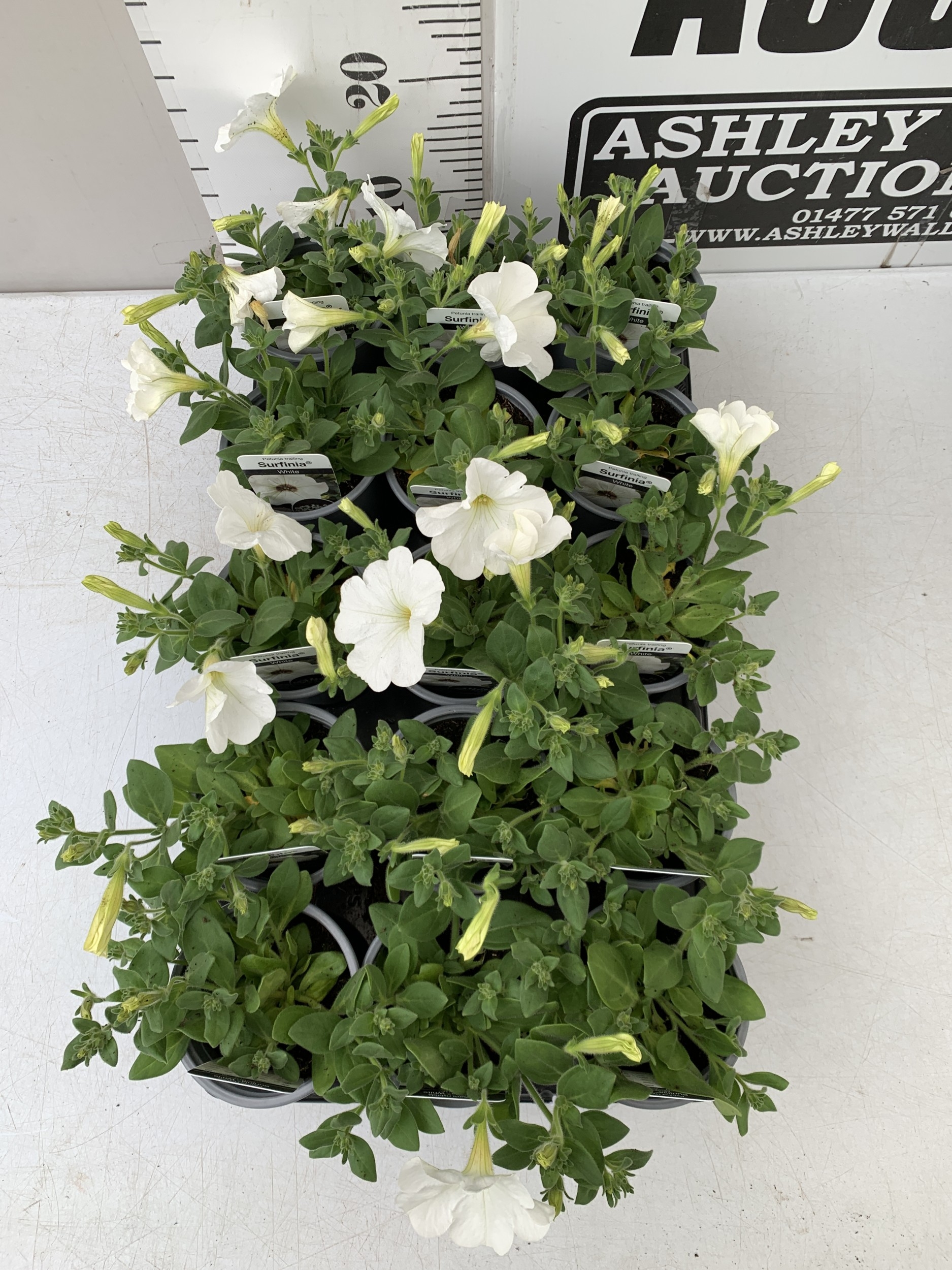 FIFTEEN PETUNIA TRAILING SURFINIA WHITE IN P8CM POTS ON A TRAY. TO BE SOLD FOR THE FIFTEEN