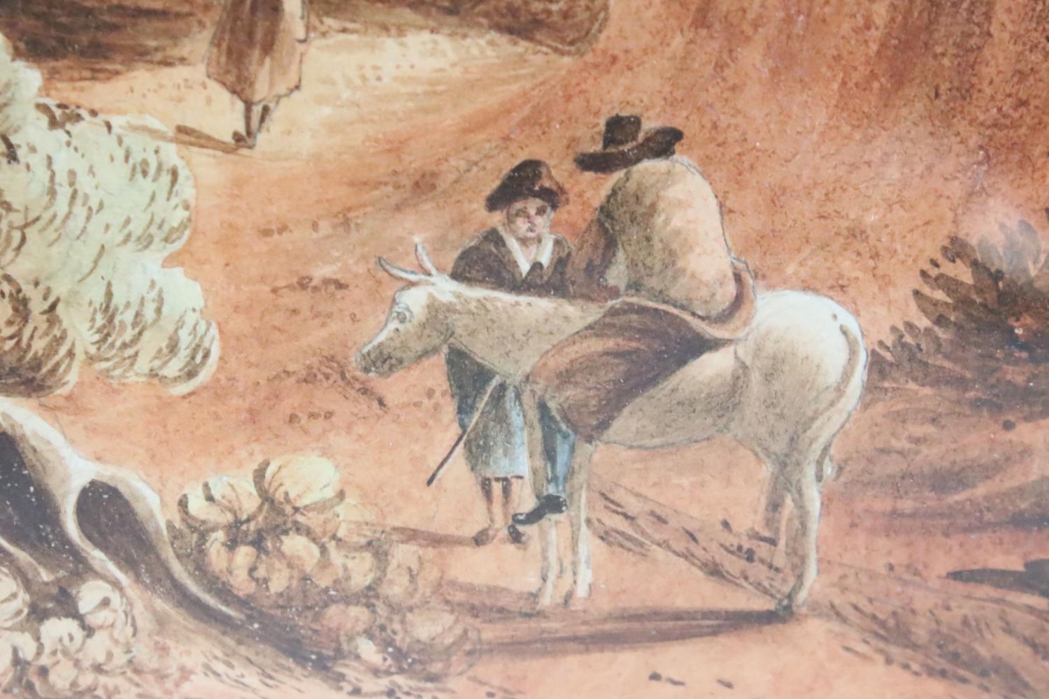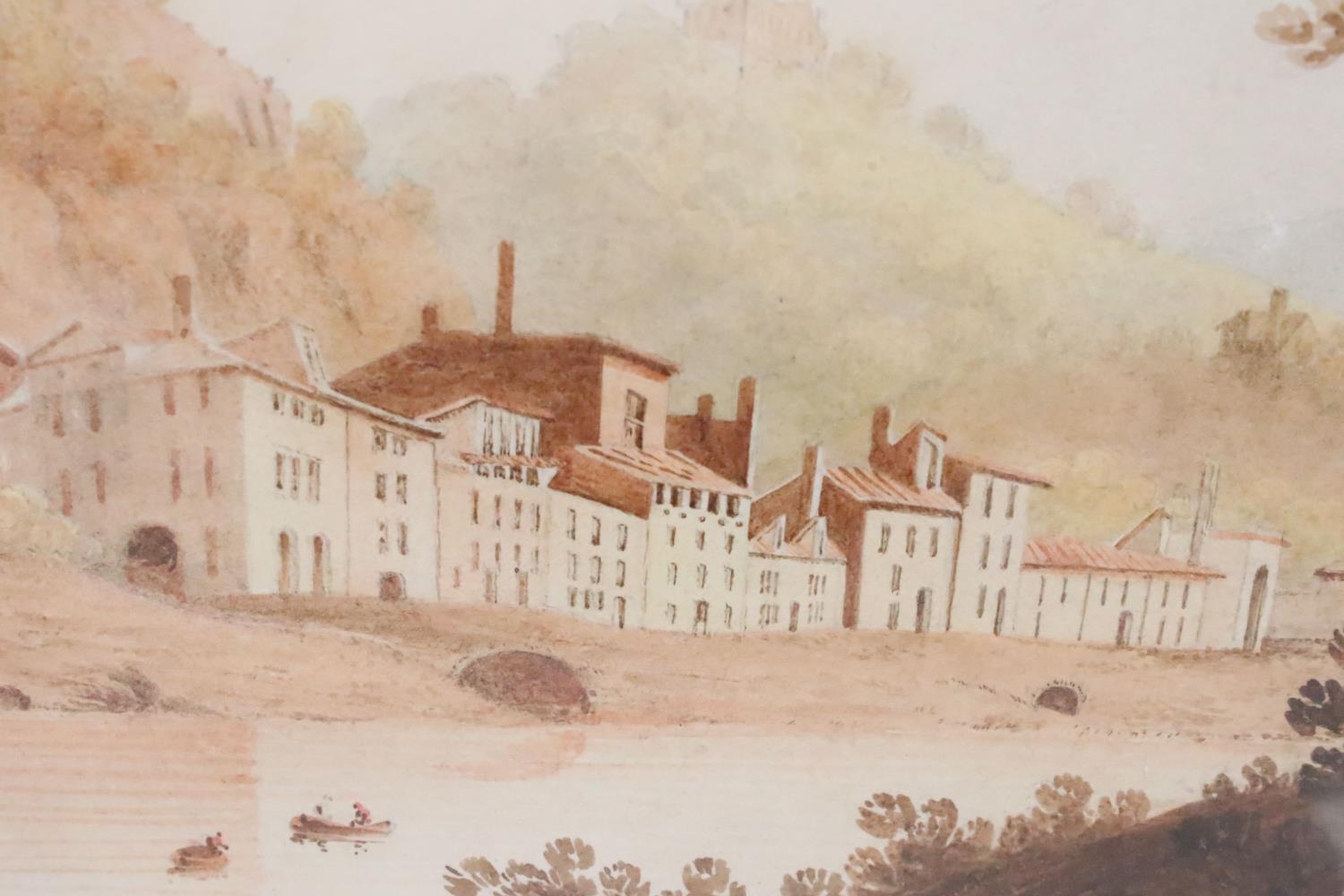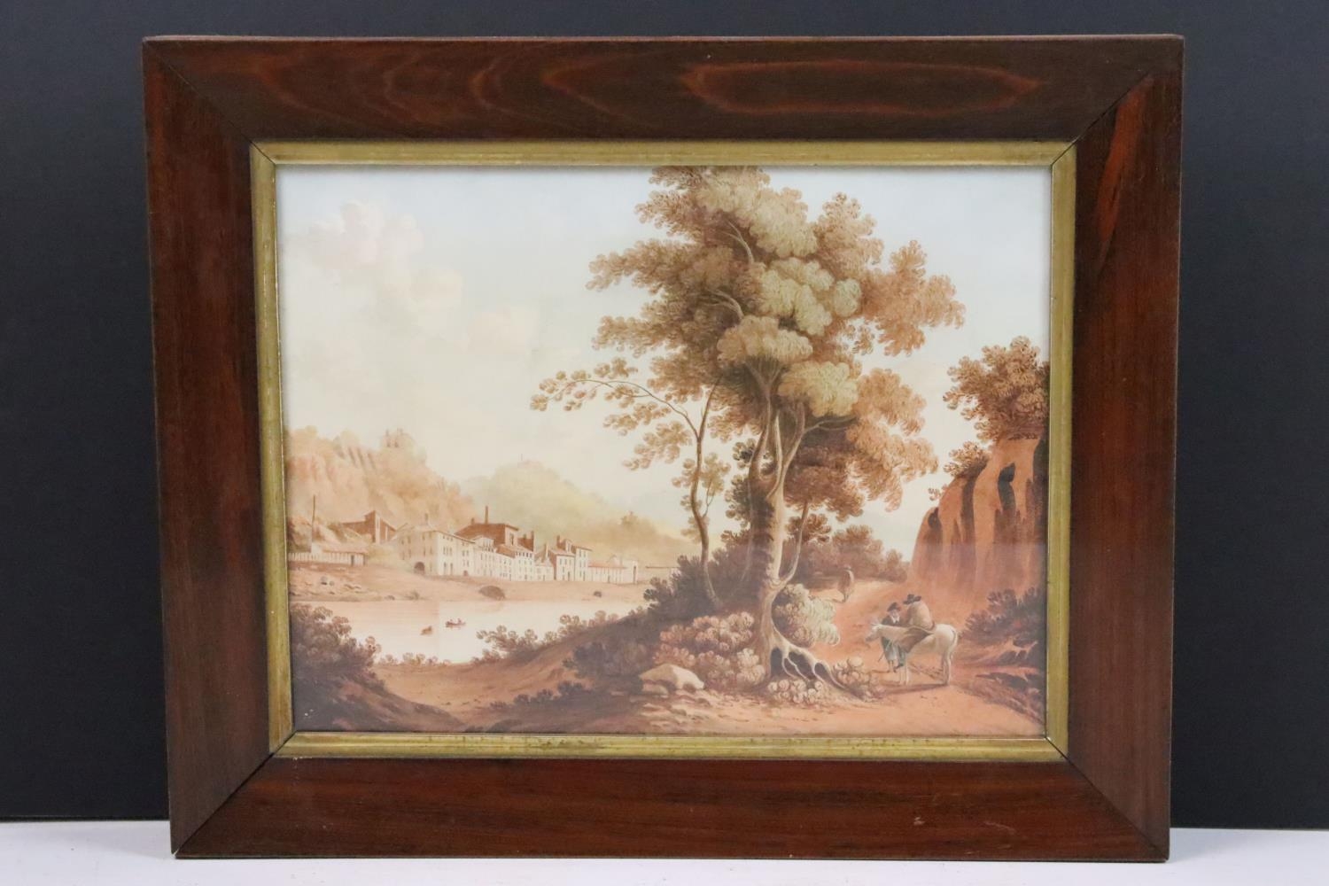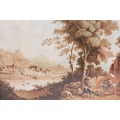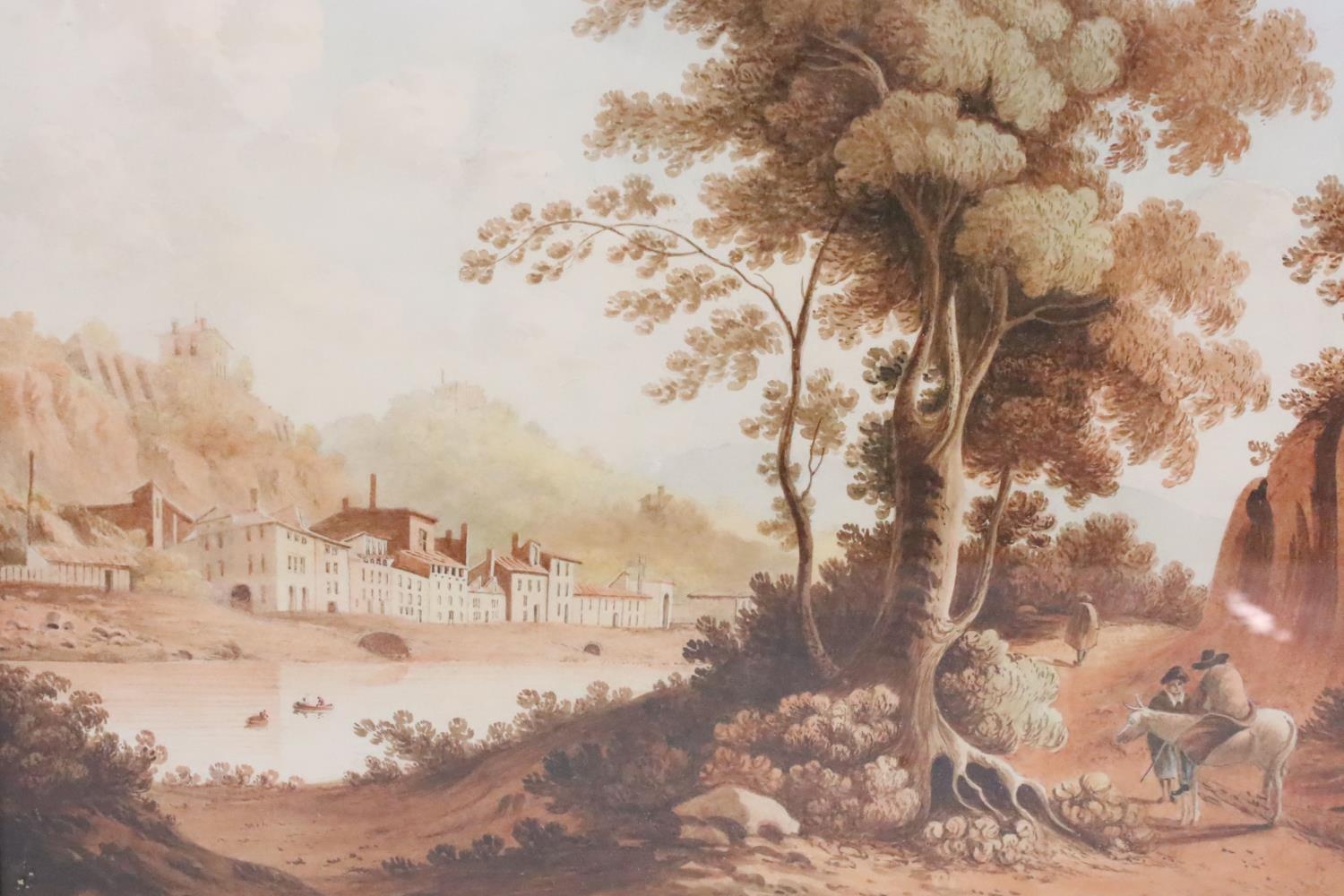 Continental School, figures on a path in the foreground, with a riverside village in the background, watercolour with sepia tones, 32 x 42cm, framed and glazed