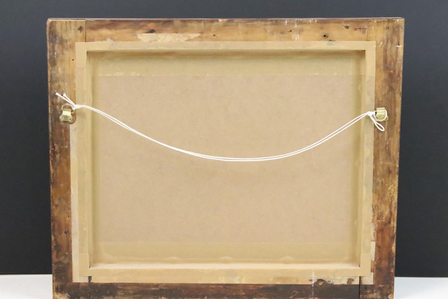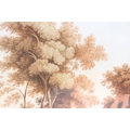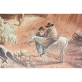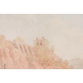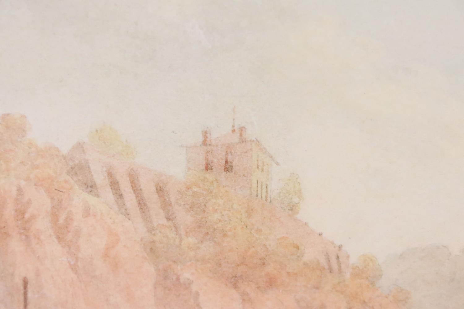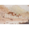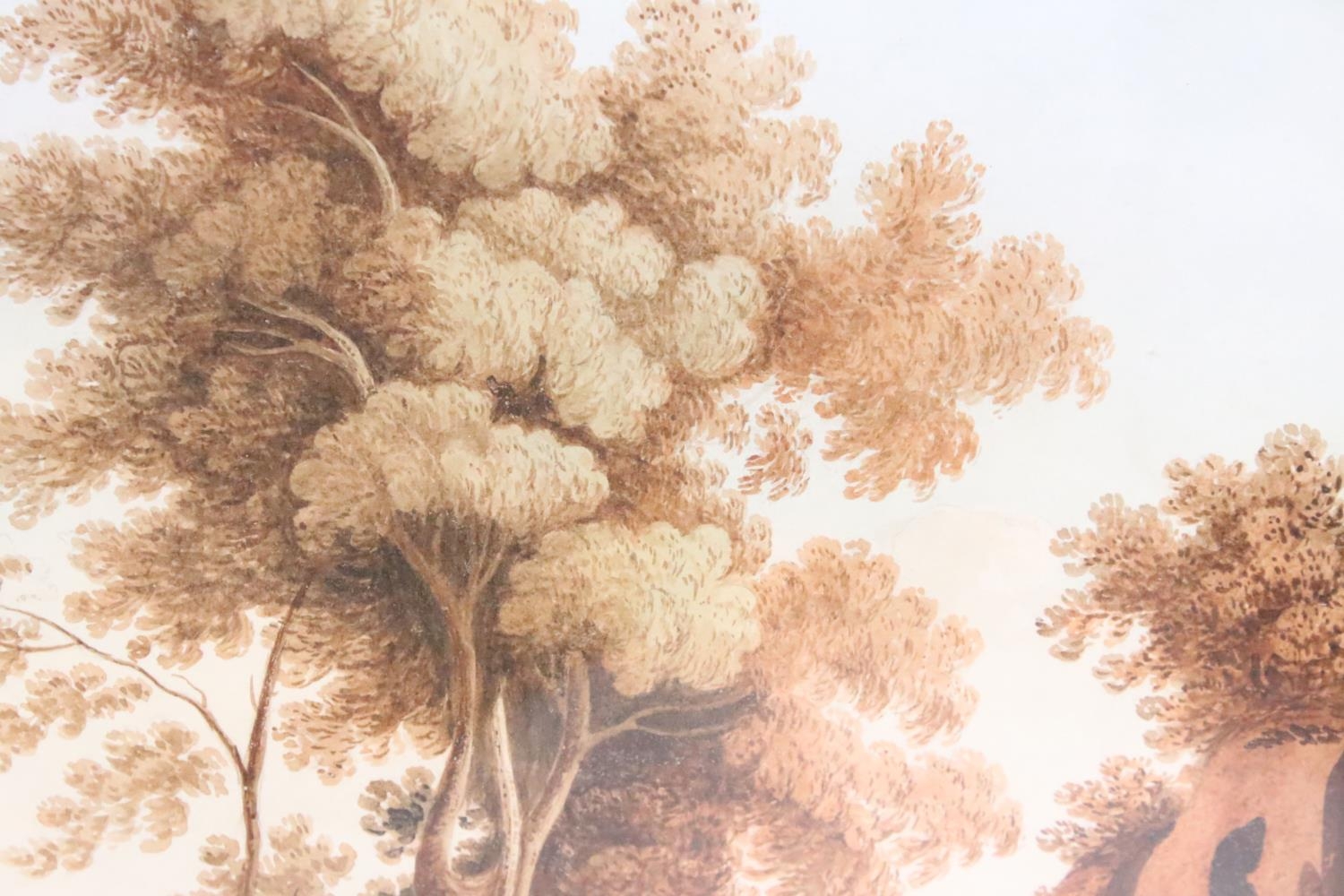 Continental School, figures on a path in the foreground, with a riverside village in the background, watercolour with sepia tones, 32 x 42cm, framed and glazed