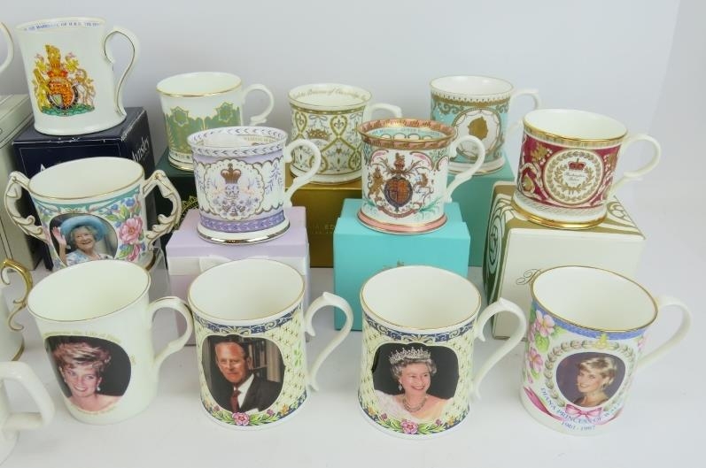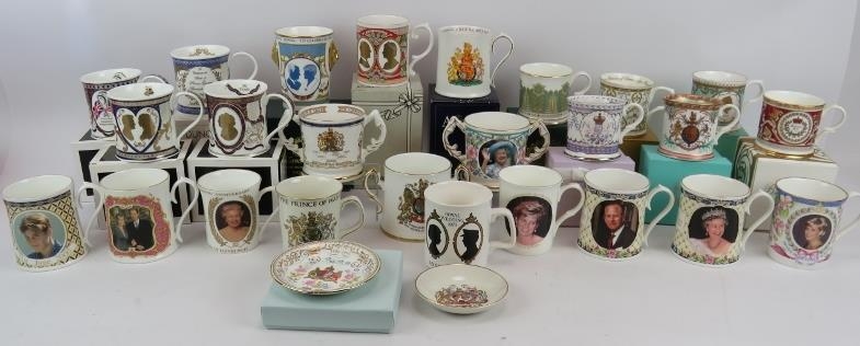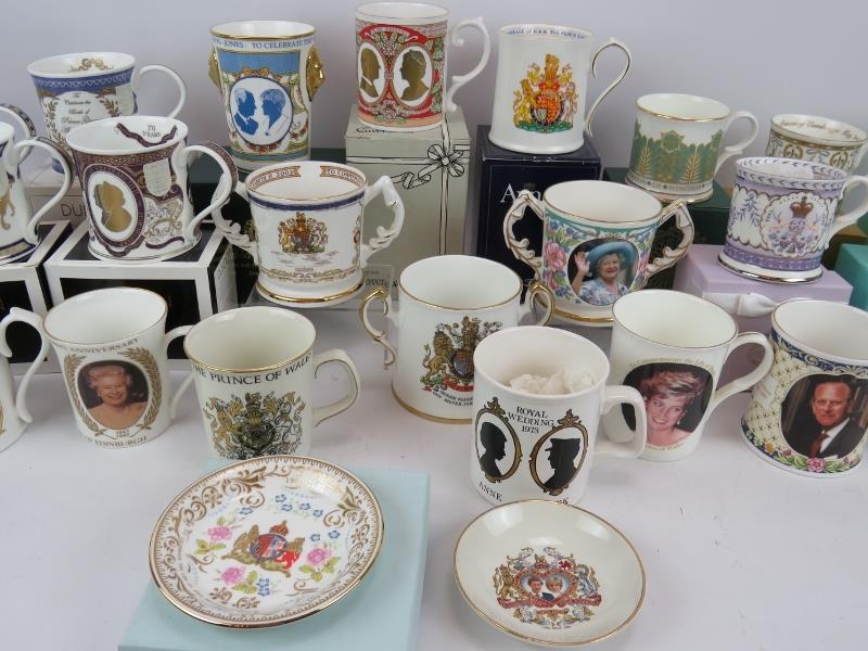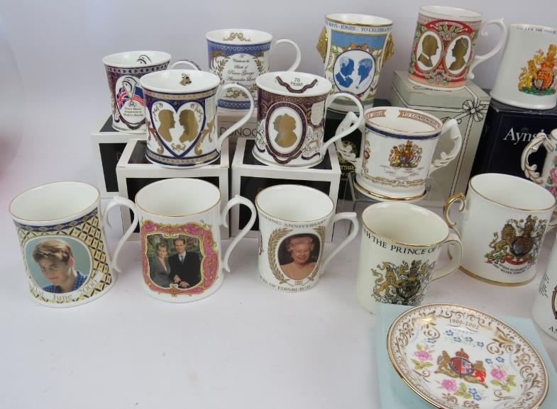 27 Royal commemorative mugs, cups and dishes by Dunoon, Aynsley, Caverswall and others. Many boxed. (27).
