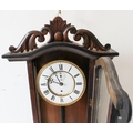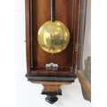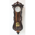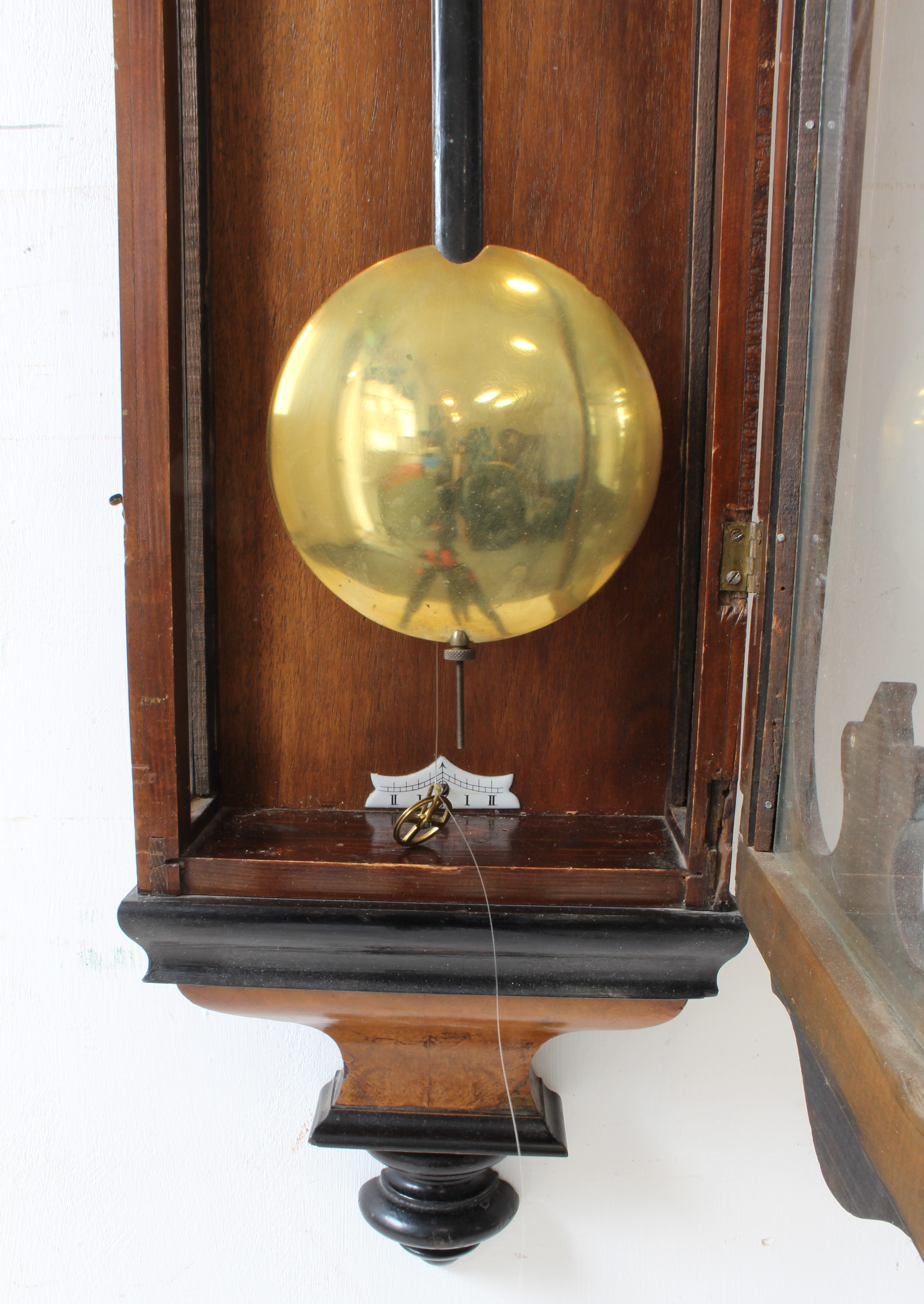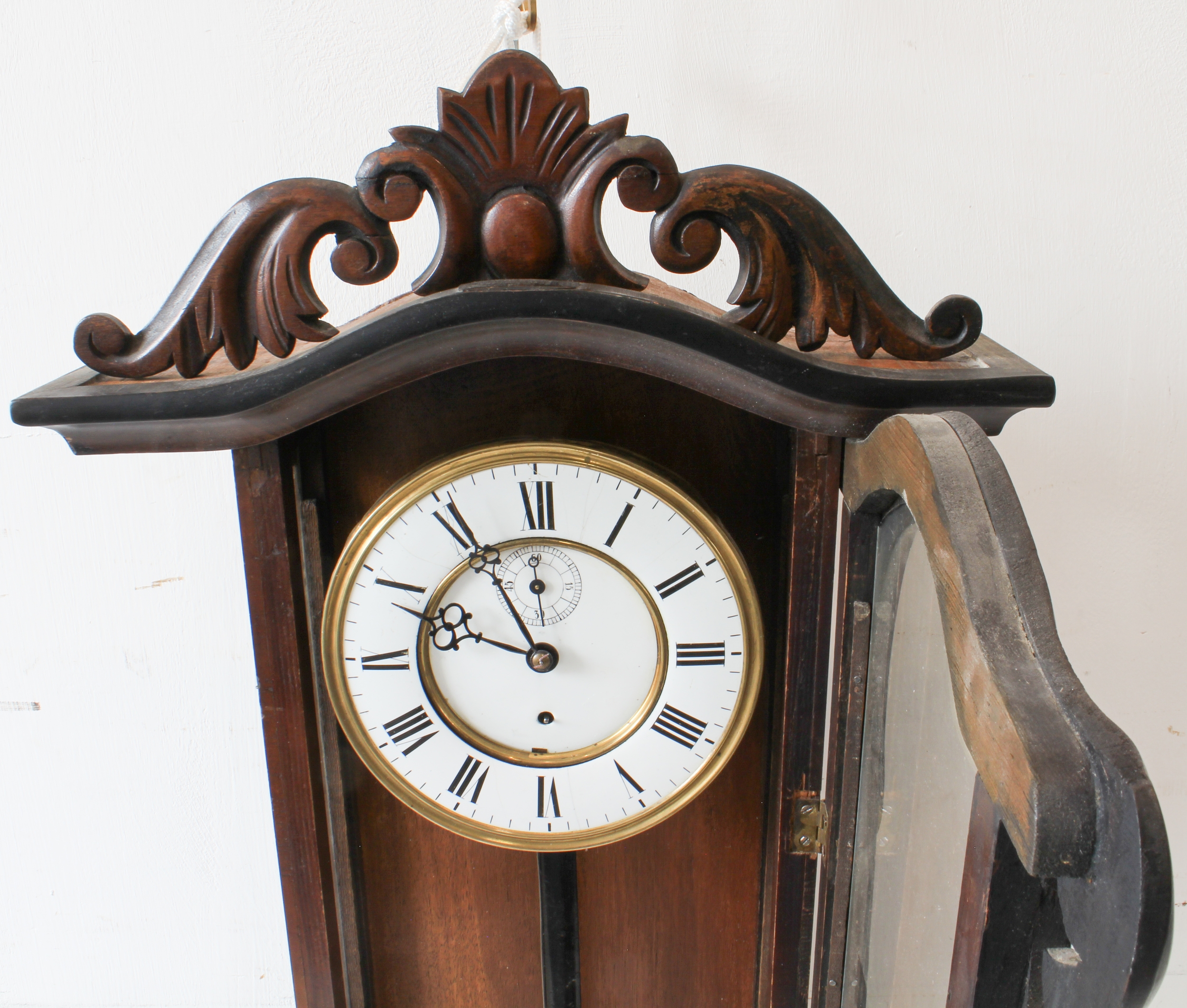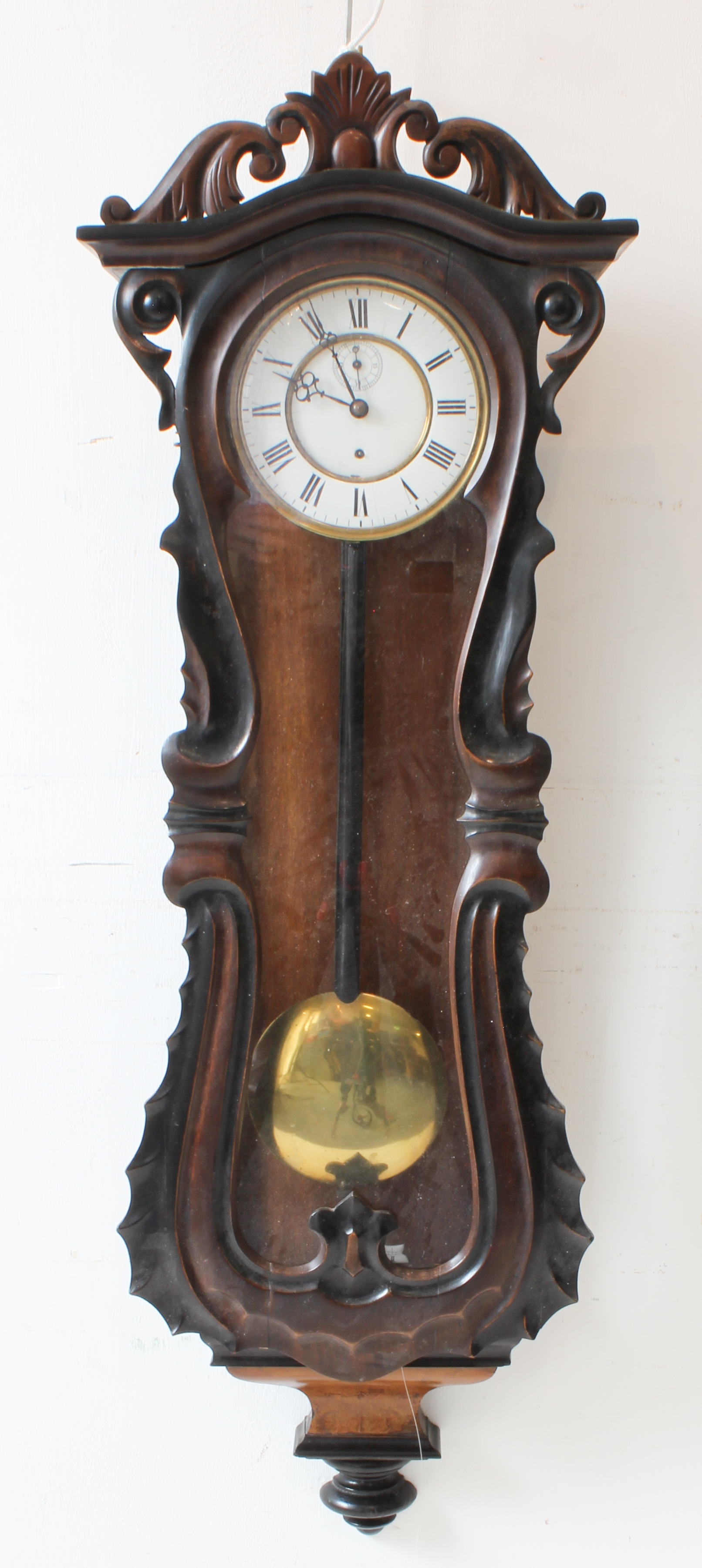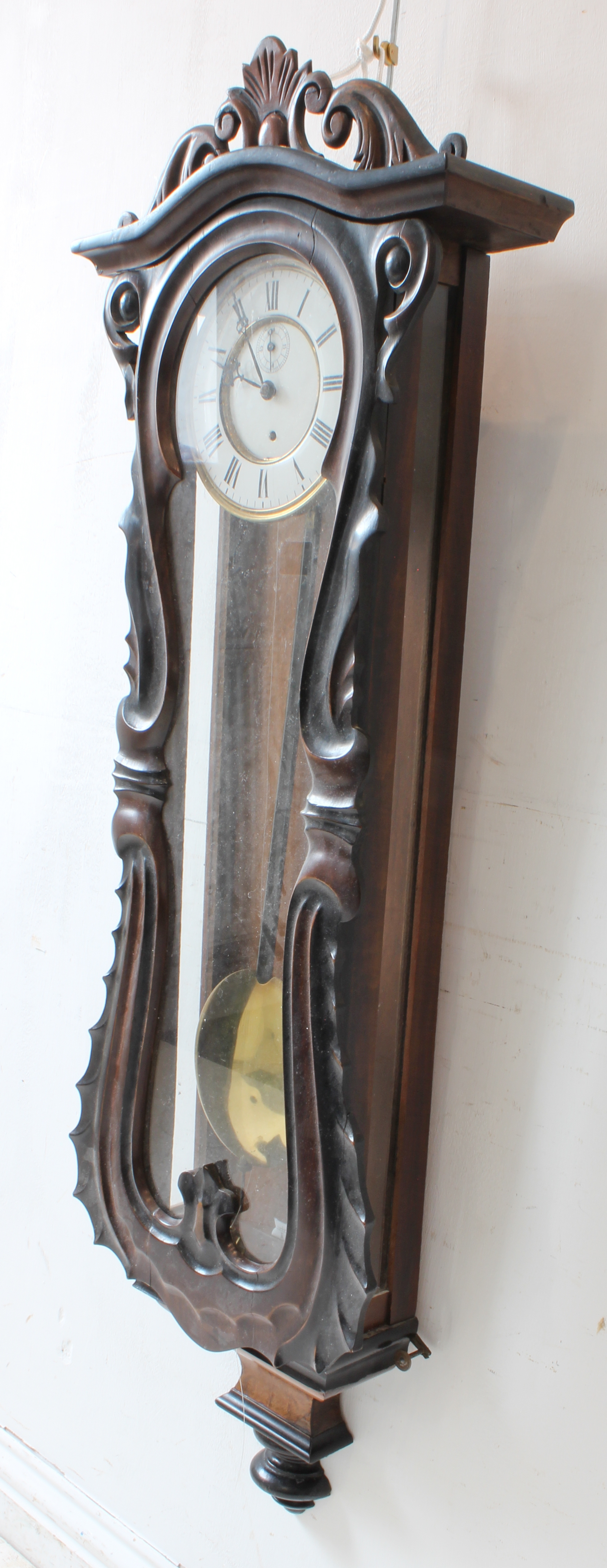A large 19th century walnut-cased continental Vienna regulator-style wall-hanging clock: the foliate carved and pierced pediment above a 7-inch white dial with Roman numerals and subsidiary seconds hand below the 12 o'clock position; single weight; original pendulum and key. (Total height including pediment 114 cm x 38 cm to widest point)