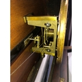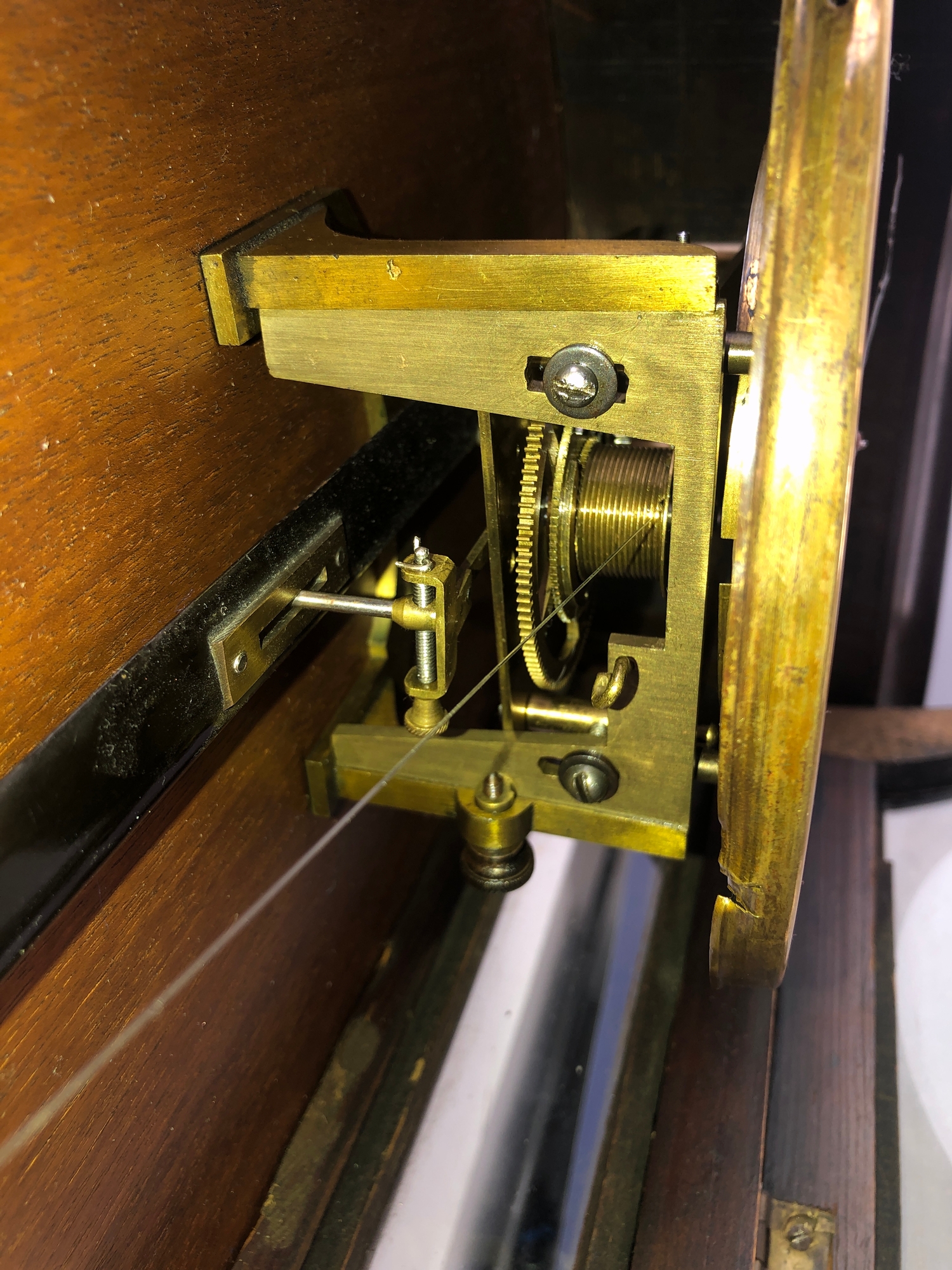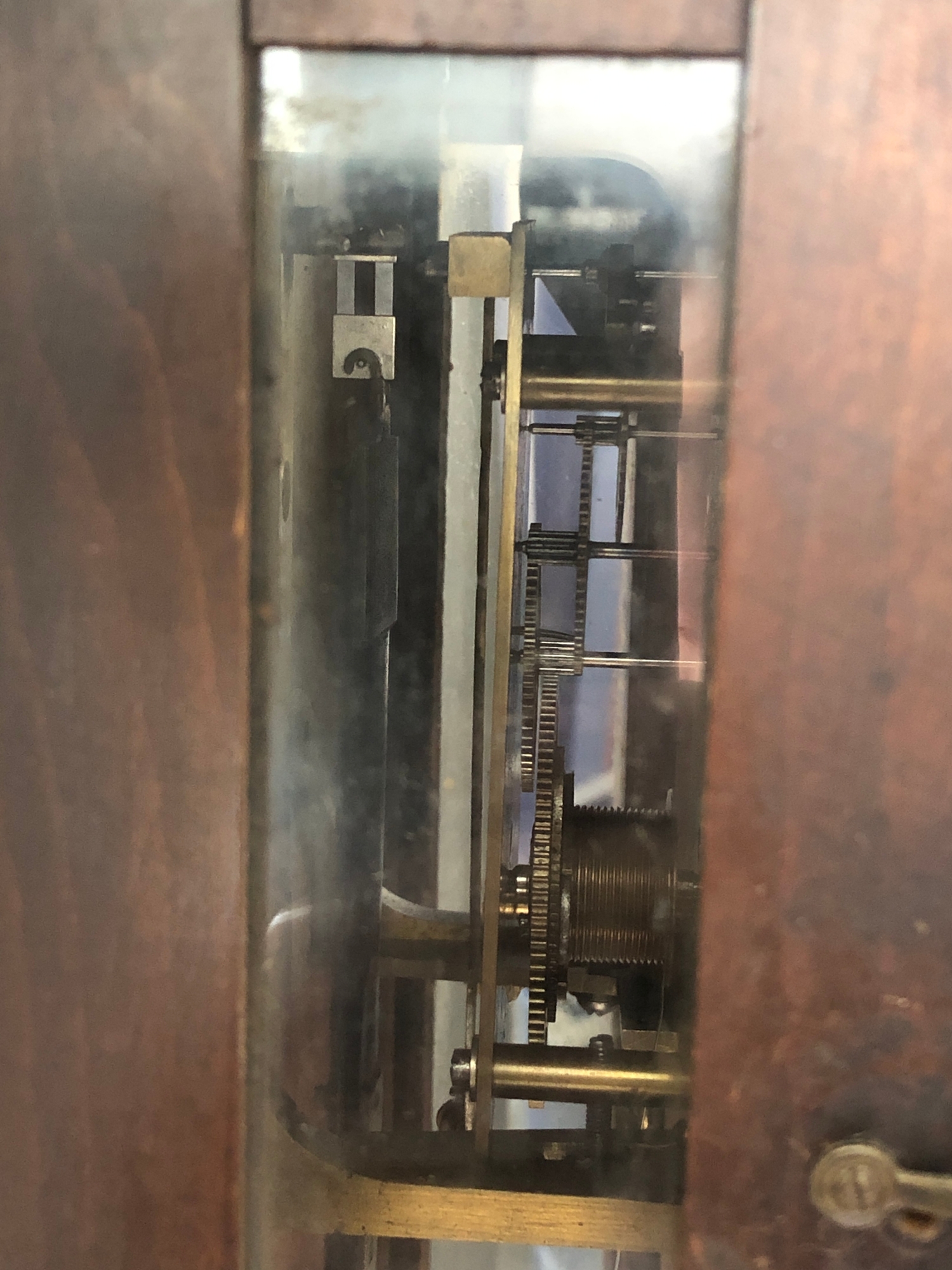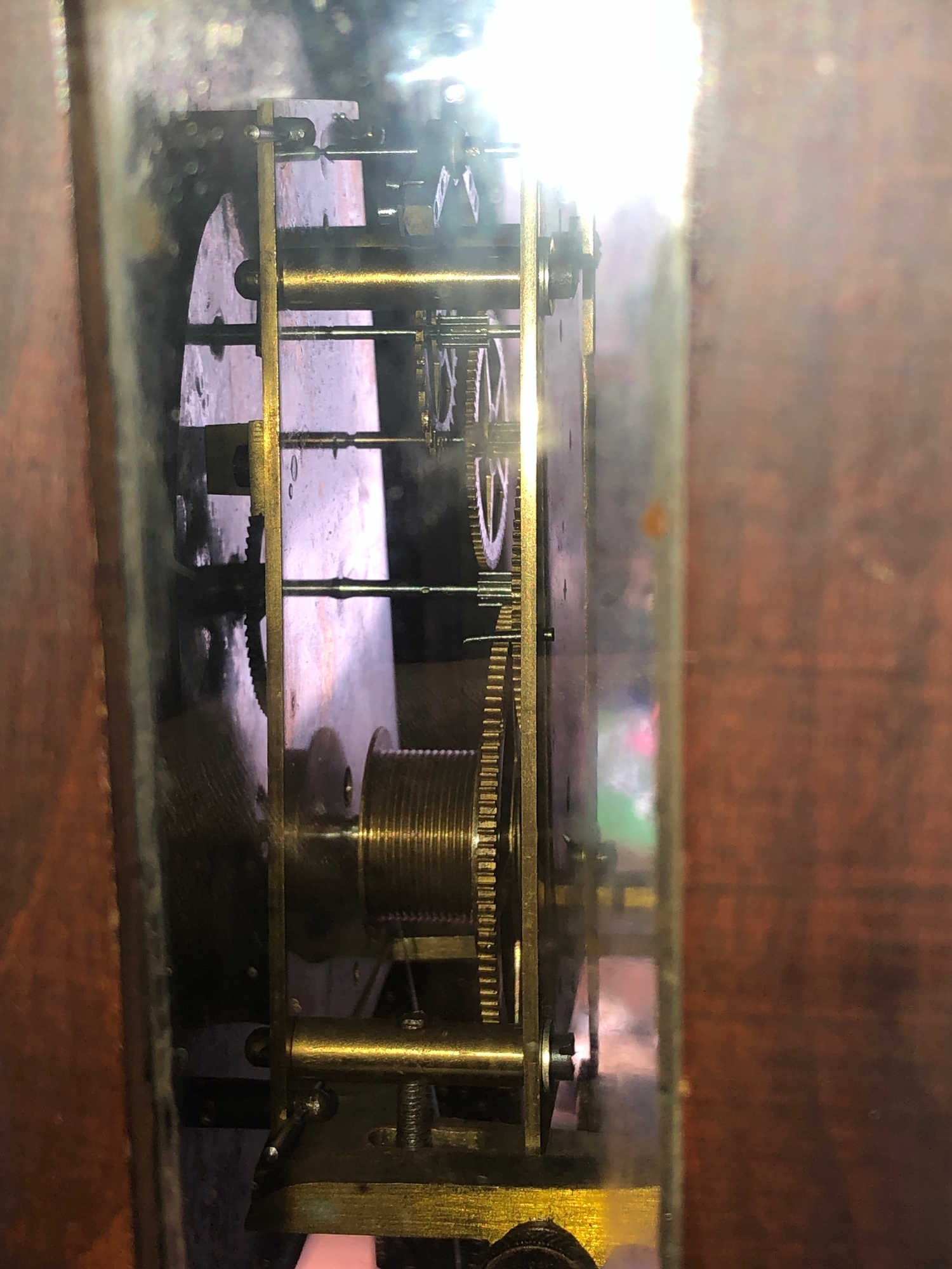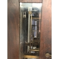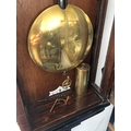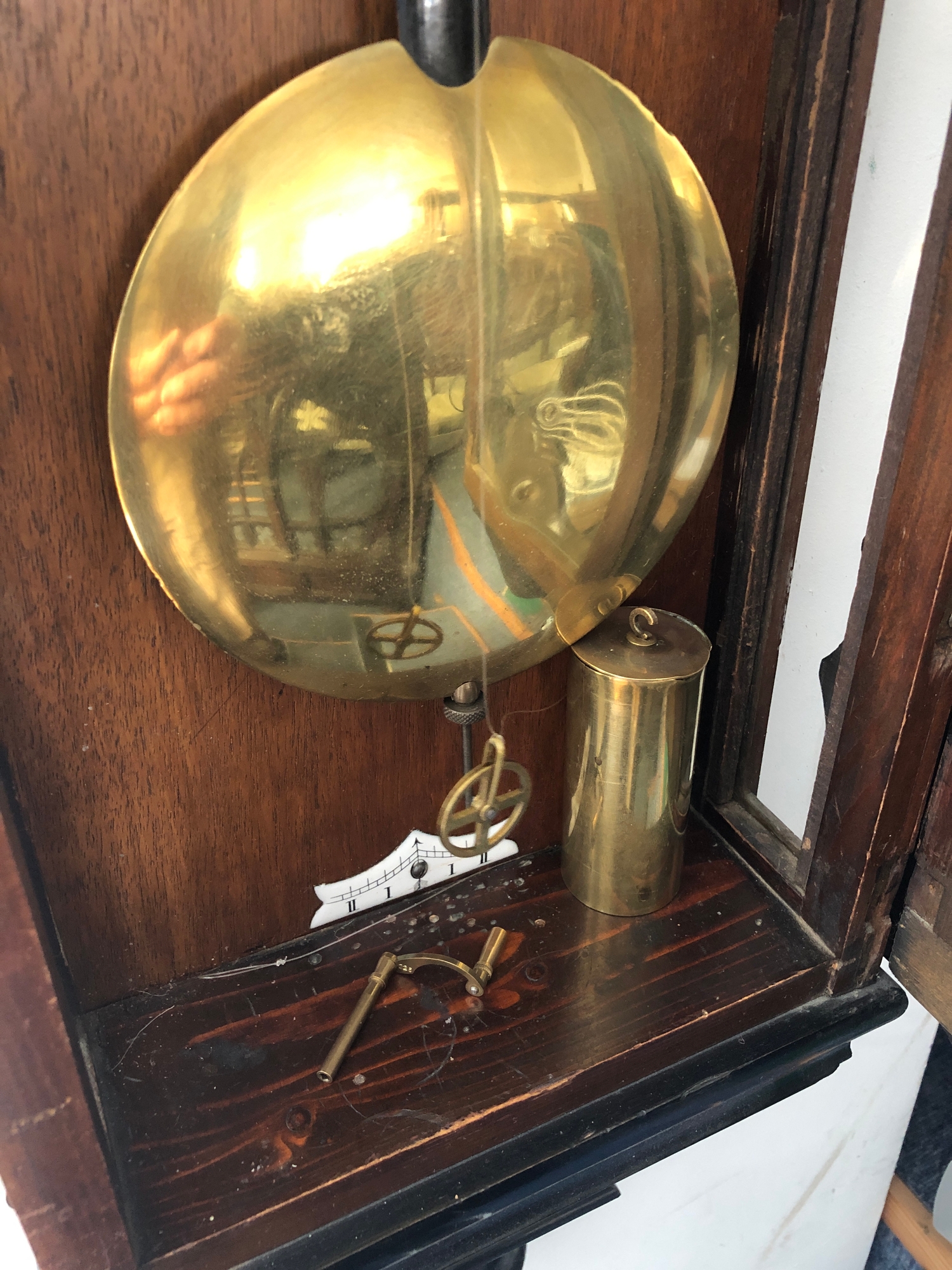 * Condition: The cord is currently not correctly attached - this will need to be attached correctly before the weight can be hung and the clock set up. Clock appears to wind OK. Old shrinkage cracks to top and bottom of the door, and a few old glued repairs to the cresting at top of case. The dial has 6 or 7 hairlines in various places and there are a few small dings to the brass face on the pendulum.