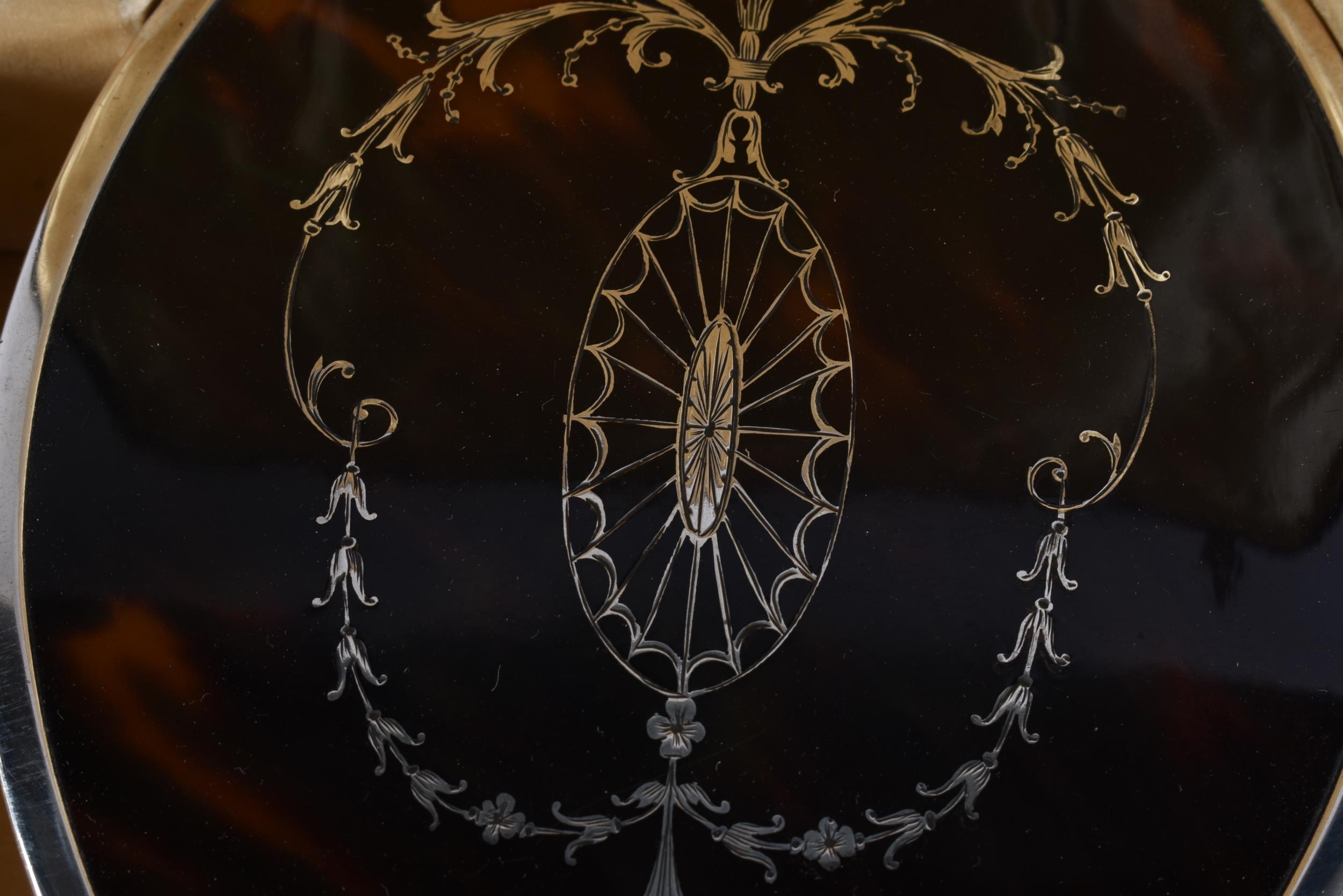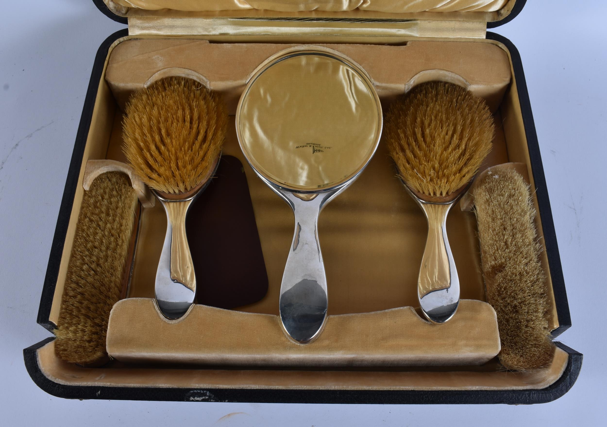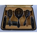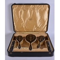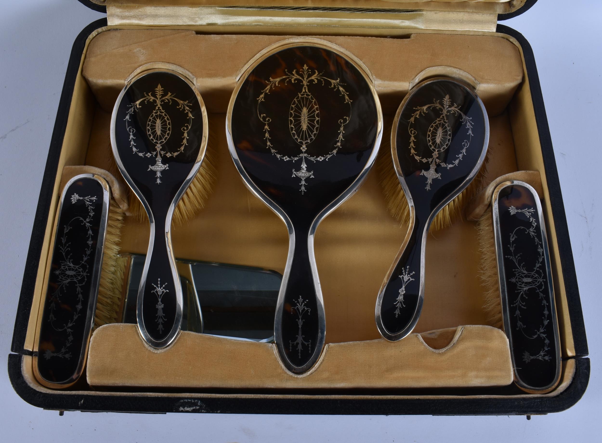 AN ANTIQUE SILVER AND TORTOISESHELL DRESSING TABLE SET. 750 grams overall. Box 42 cm x 32 cm.