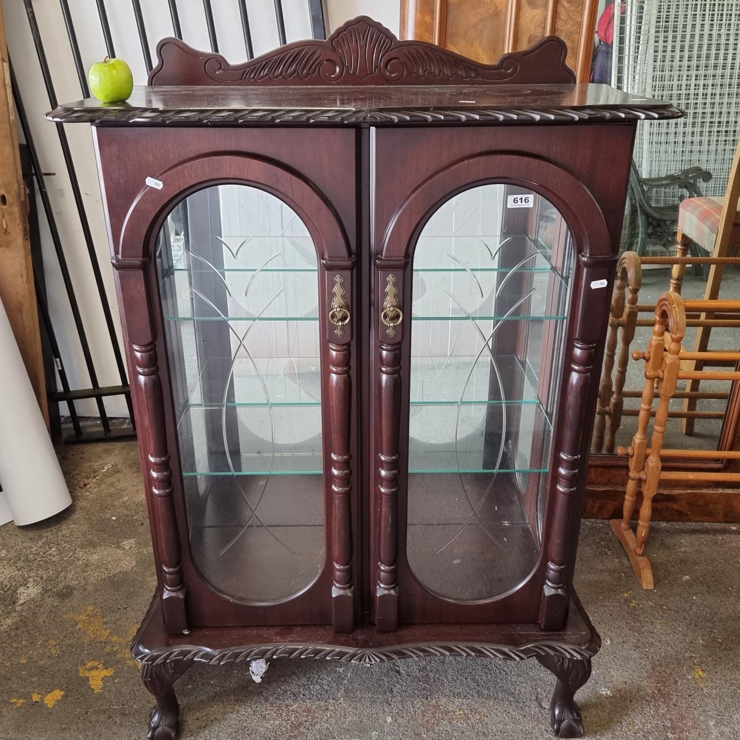A Profusely Carved Charming 2 Wooden Door Display Cabinet with Glass Shelves, a Gallery Back, an Interior Light and Claw & Ball Feet.