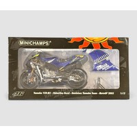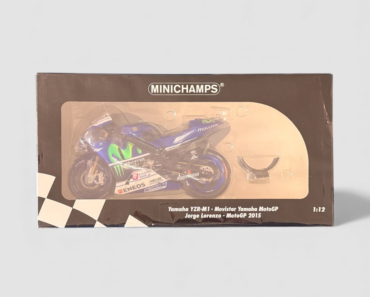 Minichamps 1/12th scale Yamaha YZR-M1 2015 Movistar J Lorenzo No. 122 153099, generally excellent in excellent window box including inner plastic clamshell. Contents unchecked for completeness or correctness and viewing recommended.