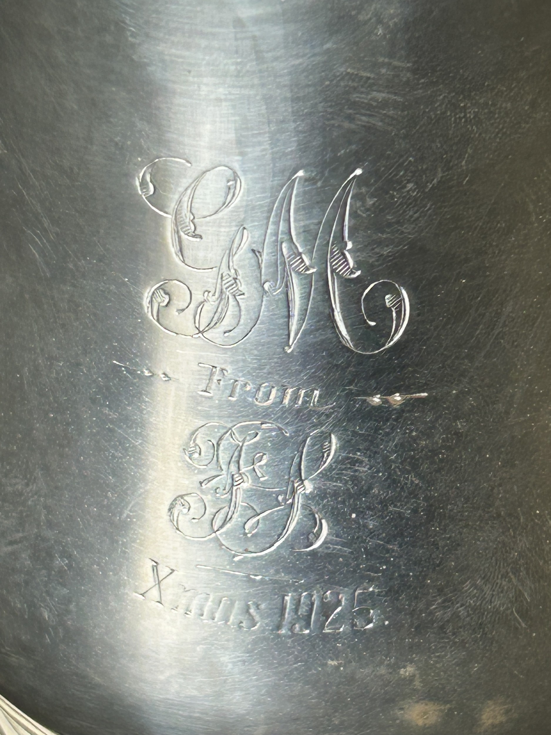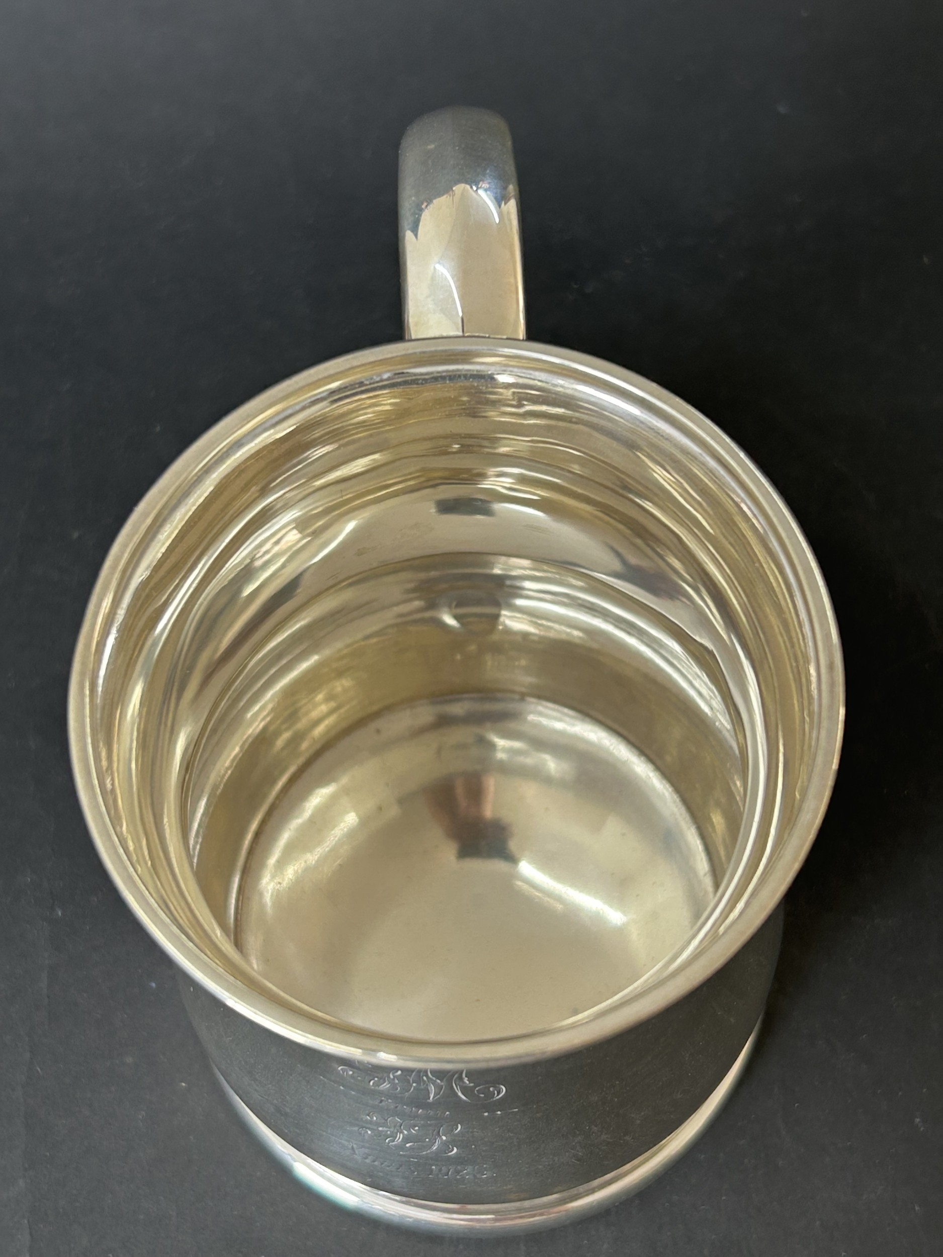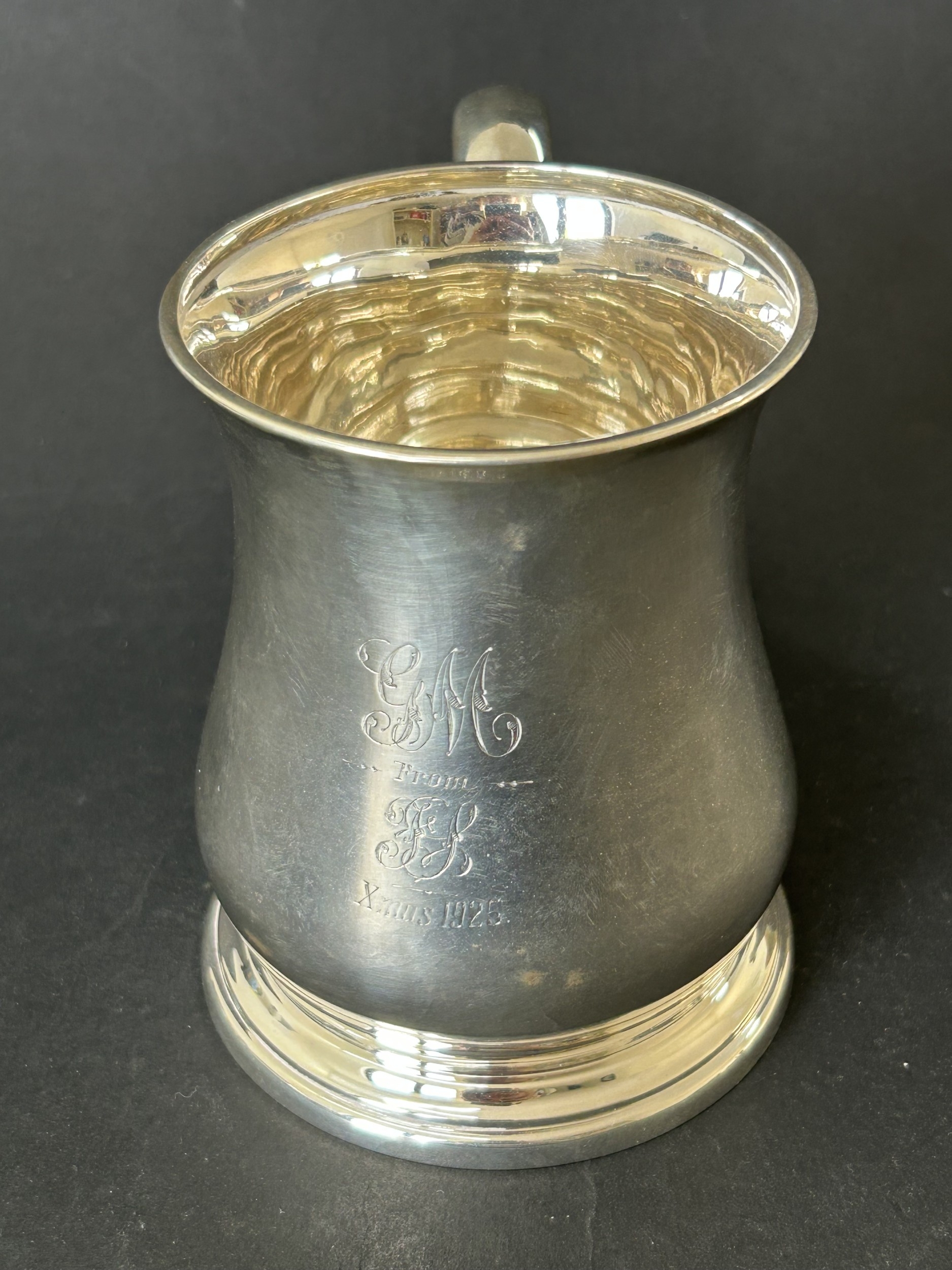 A hallmarked silver tankard, engraved to front 'GM From EB Xmas 1925', 4 3/4" tall, weight approx. 290g