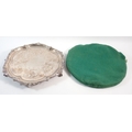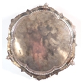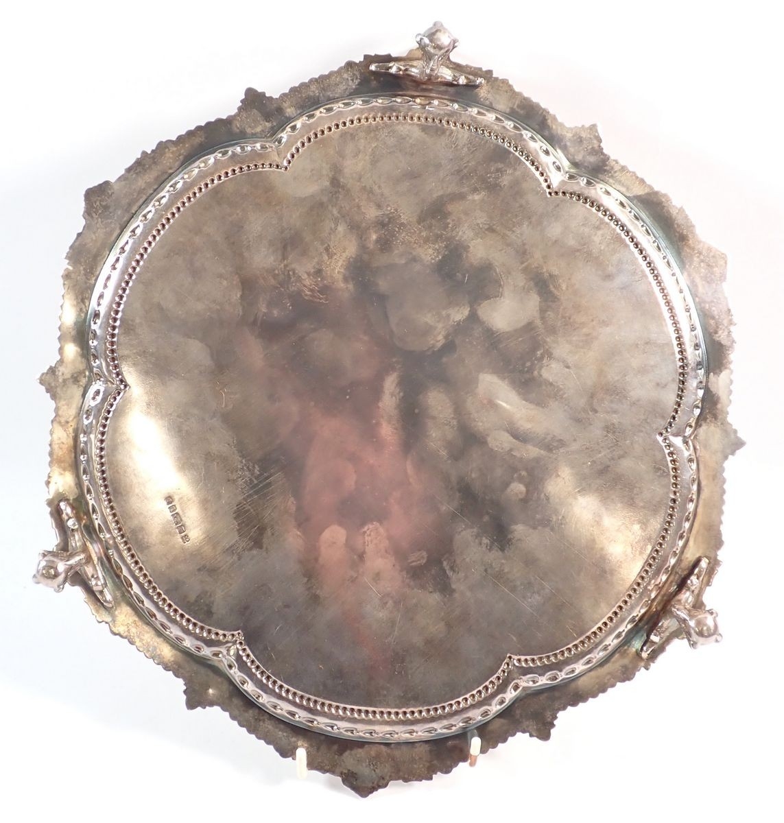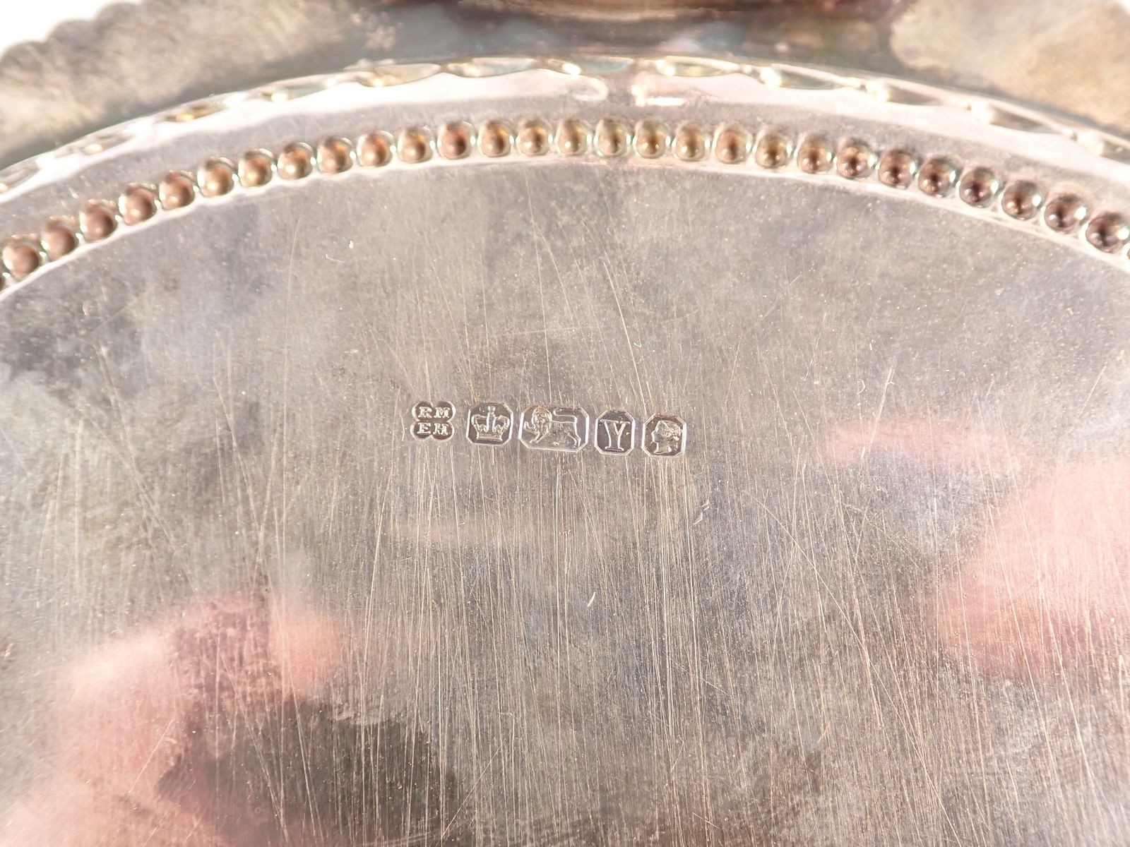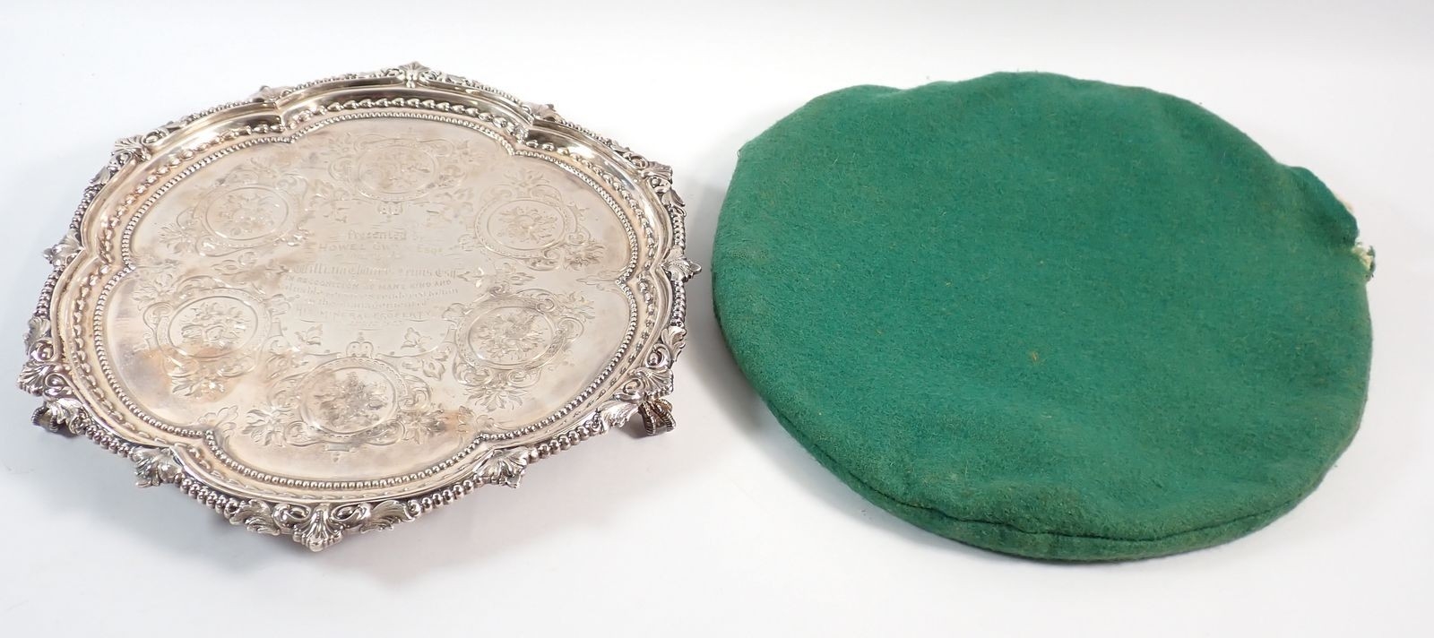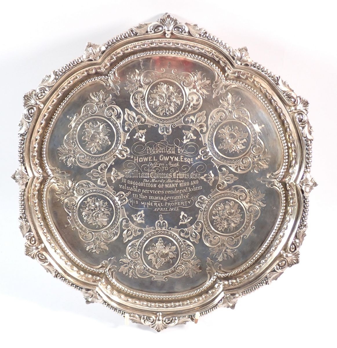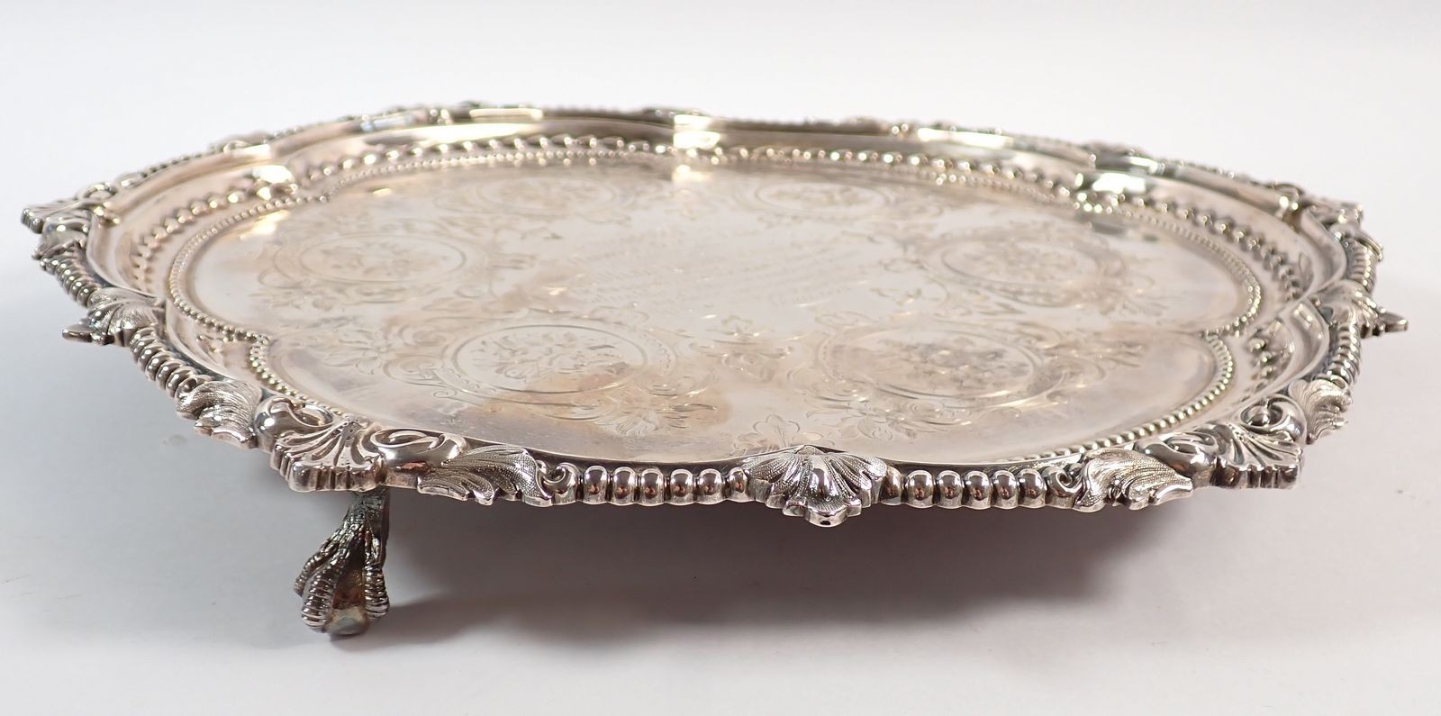 A Victorian silver salver with engraved scrolling roundel decoration and foliate beaded border, central presentation inscription dated 1873, Sheffield 1866 by Martin Hall & Co. 32cm wide, 848g