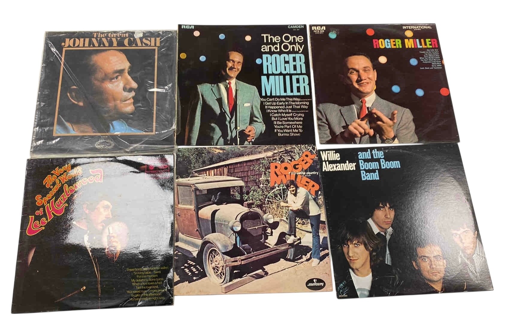 A group of vinyl LP records, including Johnny Cash The Great Johnny Cash, Roger Miller The One and Only, another Roger Miller RCA International album, Leo Kottke The Very Special World of, and Willie Alexander and the Boom Boom Band.