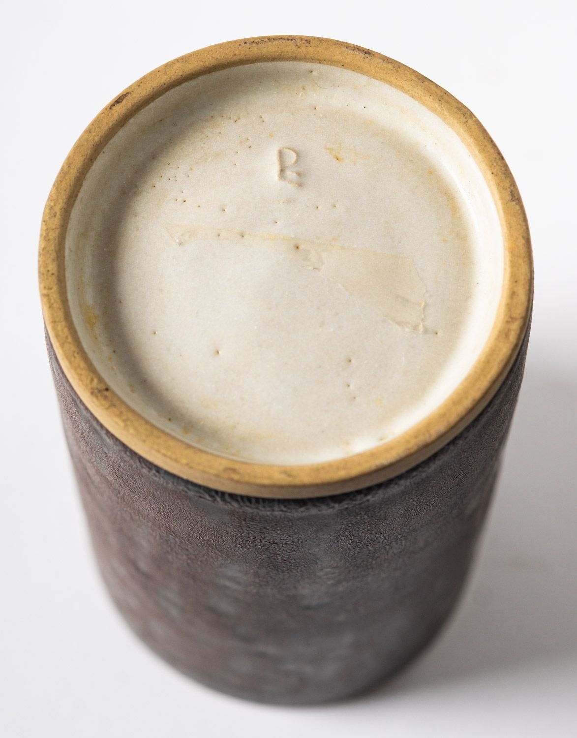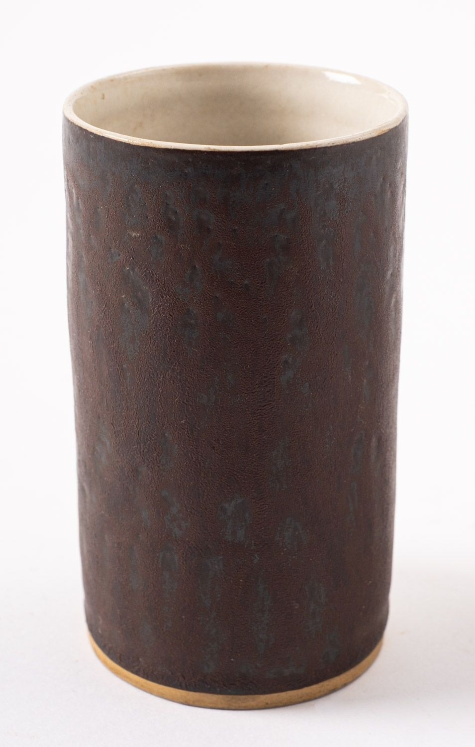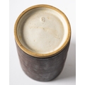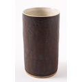 *Dame Lucie Rie DBE [1902-1995] a stoneware cylinder vase or beaker, with manganese glazed exterior and off white interior, impressed personal seal, 11.5cm high.