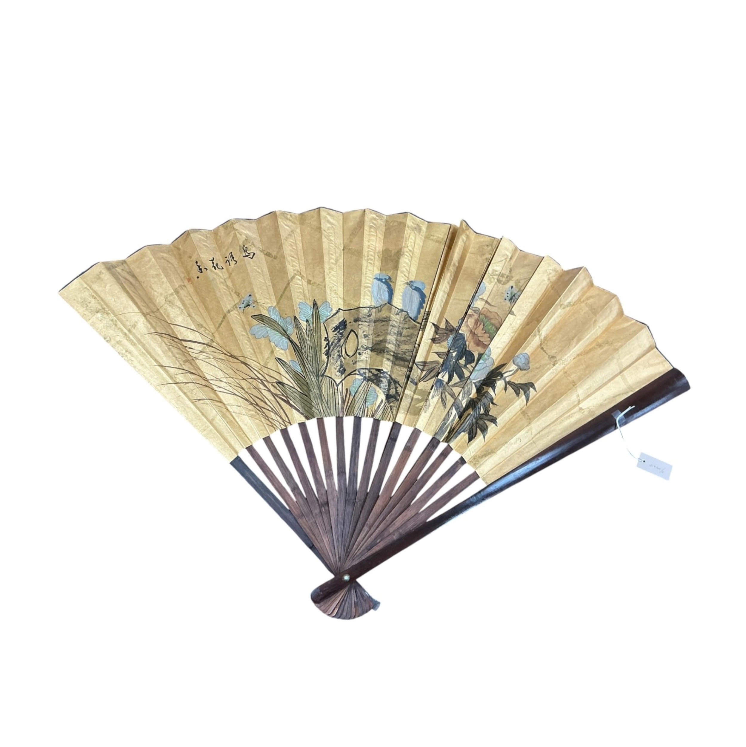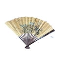 A large Chinese gilt fan, hand painted with birds, 89cm in length