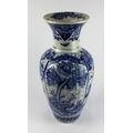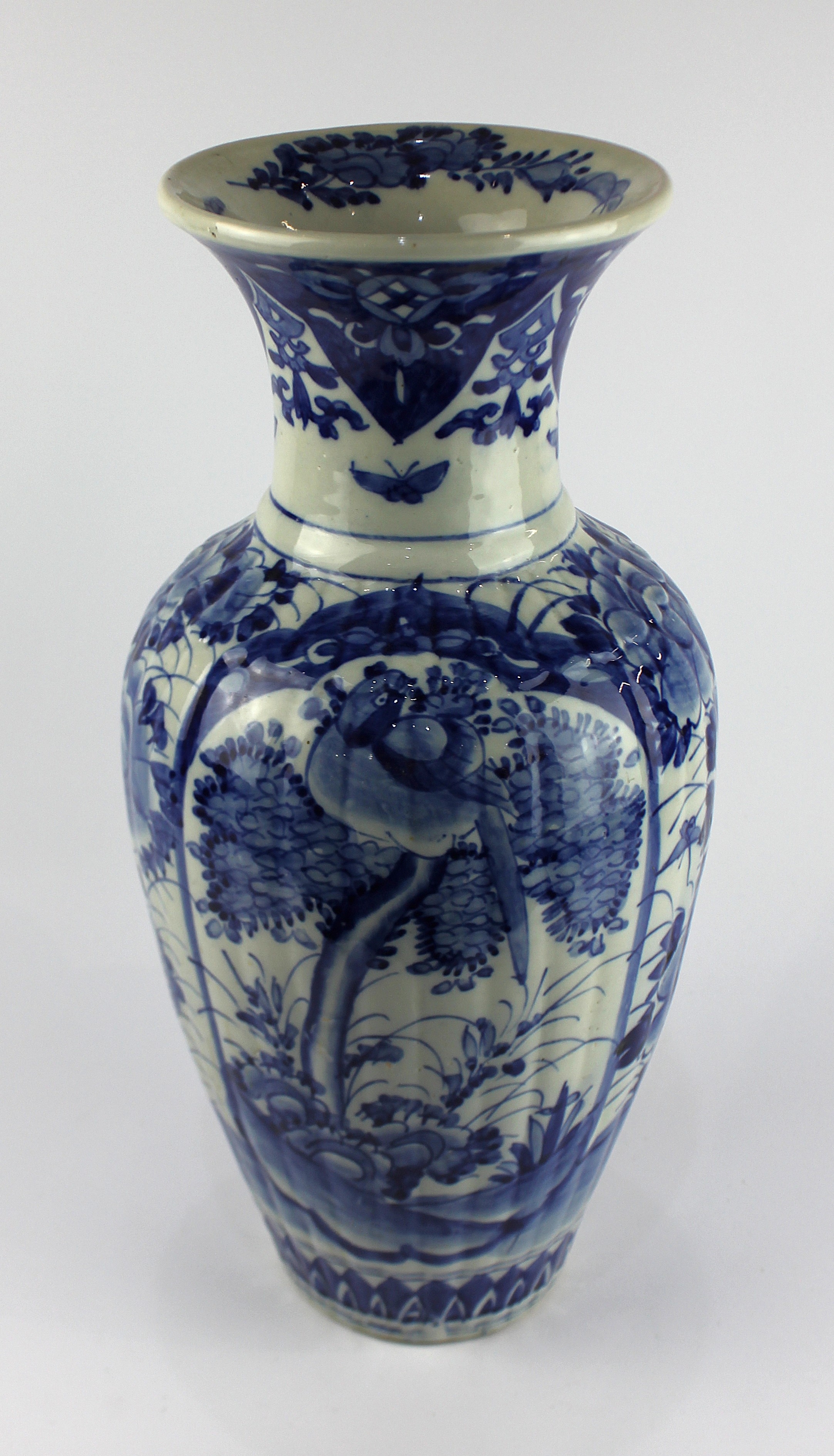 A Chinese blue and white vase, of baluster form, with ribbed body decorated with panels of flowers and birds within a garden, height 44.5cm (AF)