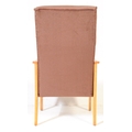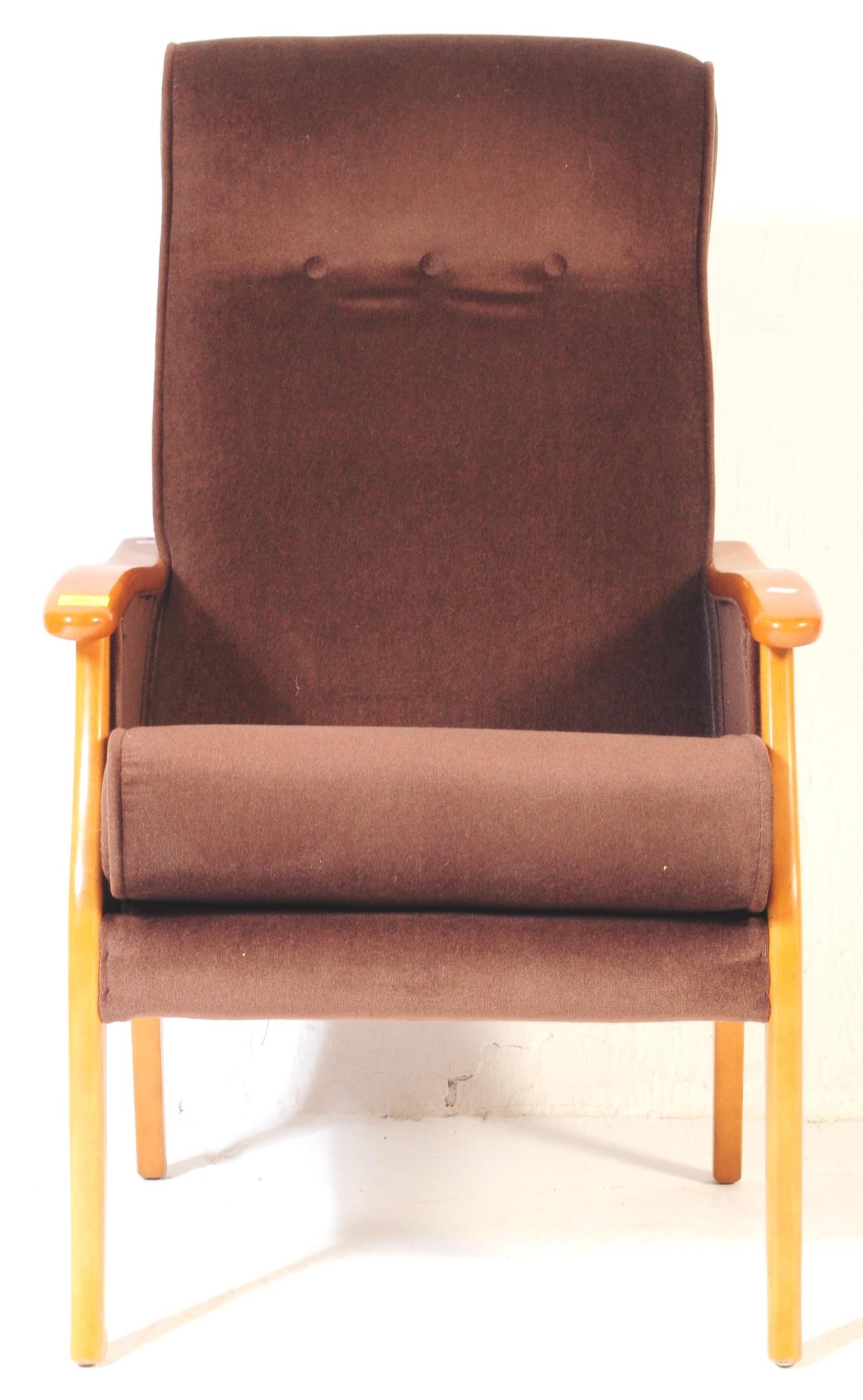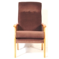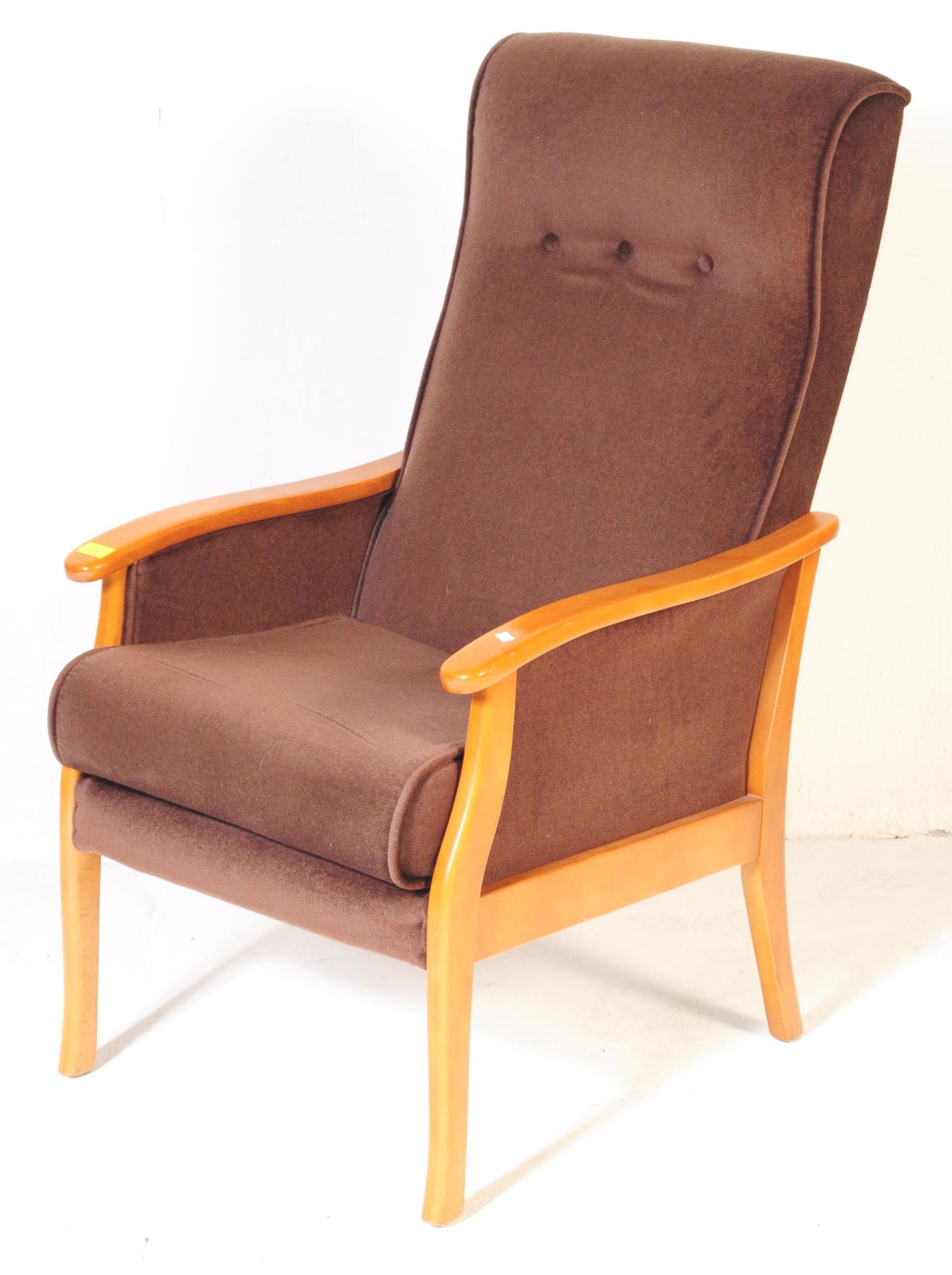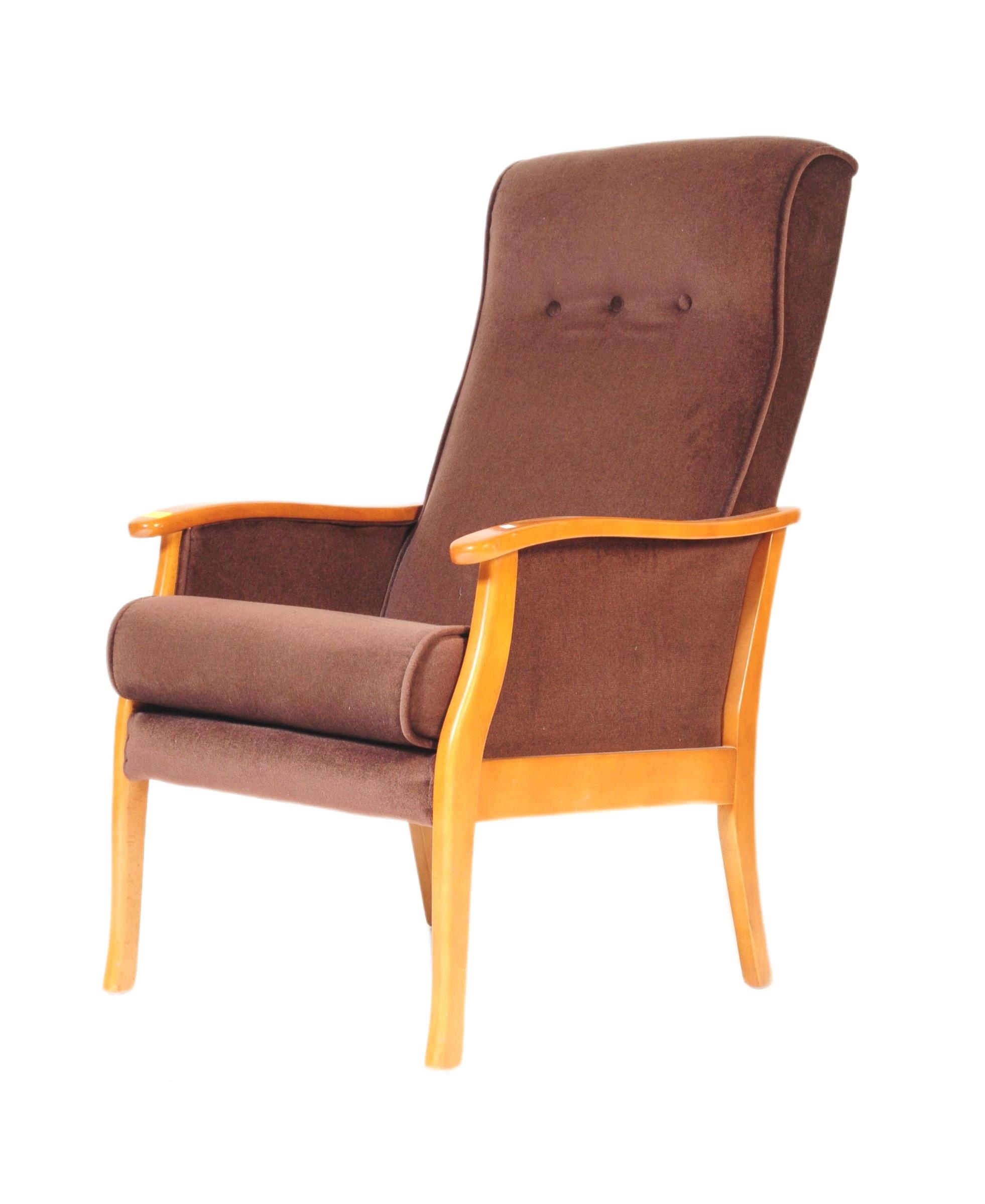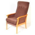 A contemporary lounge easy armchair. Having brown fabric cushioned back rest and drop in seat with straight arm rests raised on curved upright legs. Measures approx 107 x 60 x 78cm.