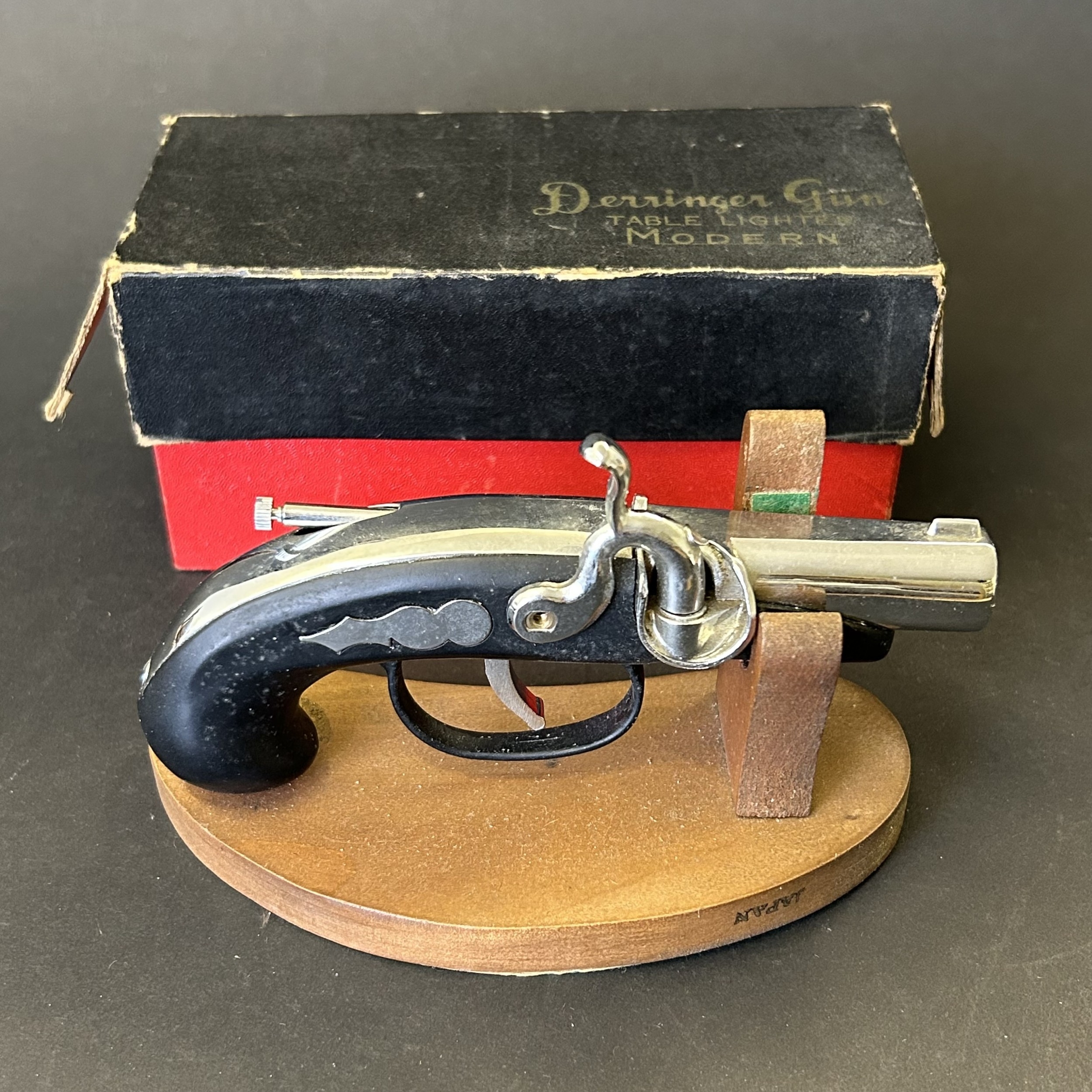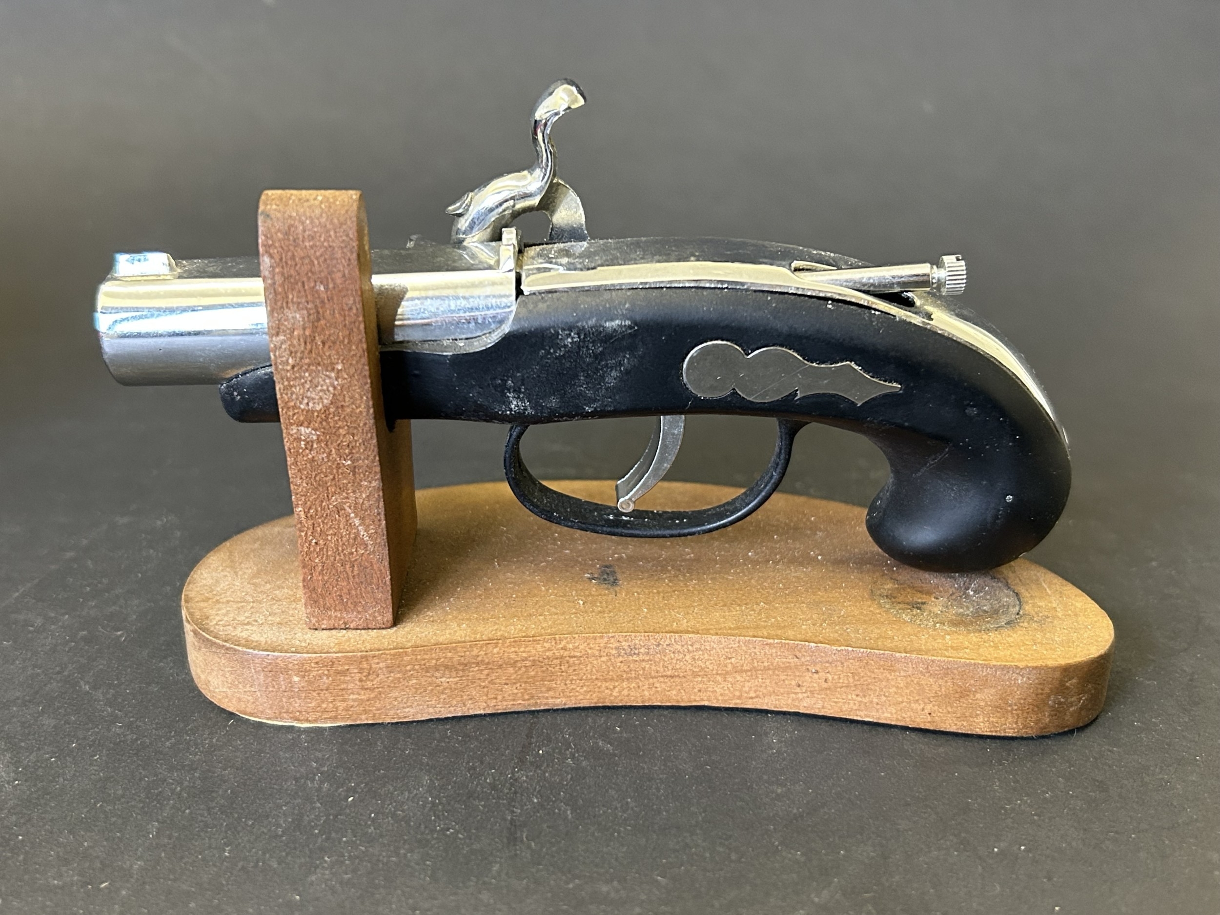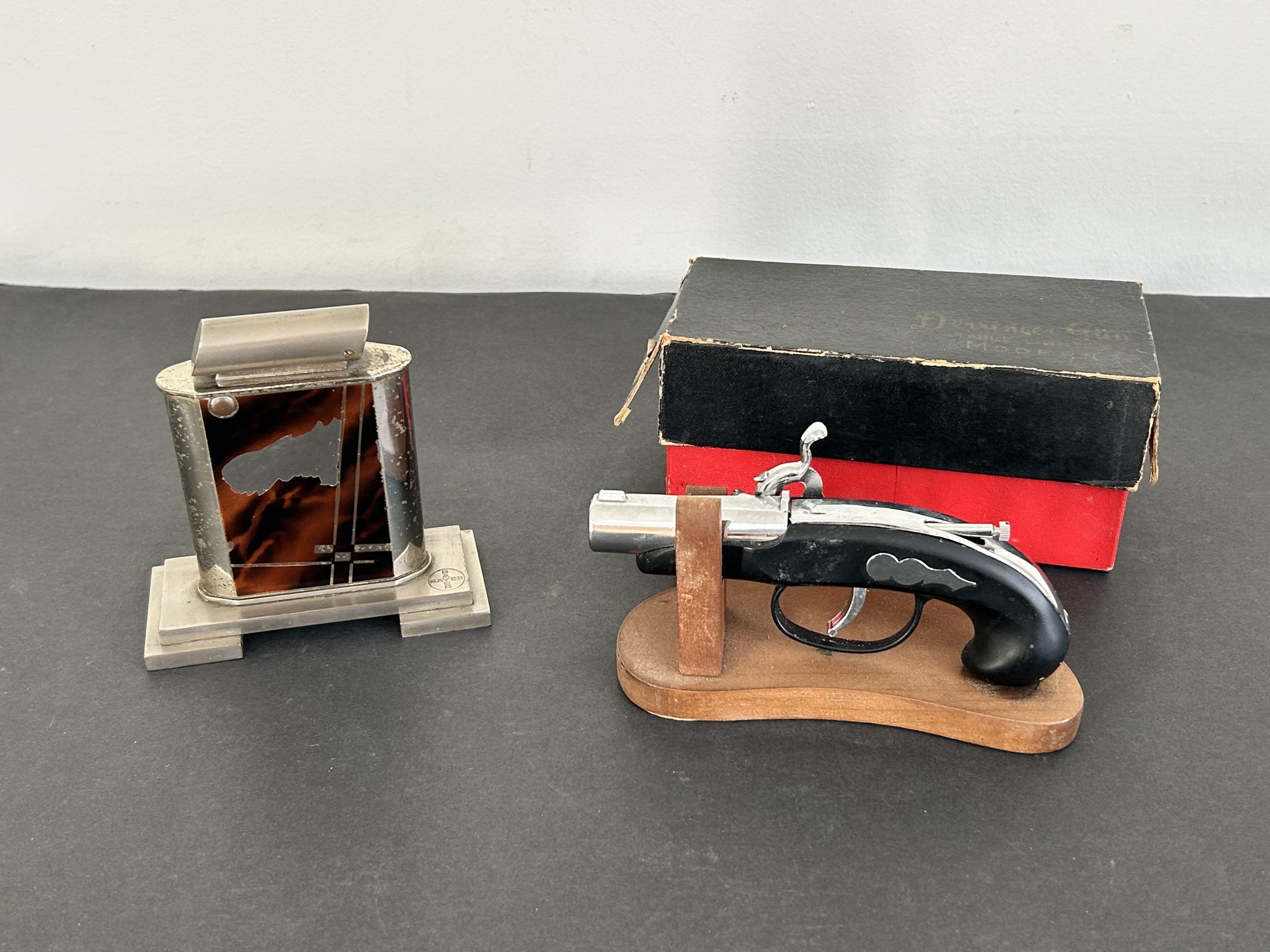 An Art Deco period Bayer large and heavy table lighter with faux tortoiseshell decoration and press button action on side, approx. 4 1/4" high (all appears complete, loss of faux tortoiseshell to the front, signs of age and use, some mottling on metal) together with a boxed vintage Japanese made Derringer gun style table lighter on wooden stand, approx. 5 3/4" long (box with damage)