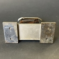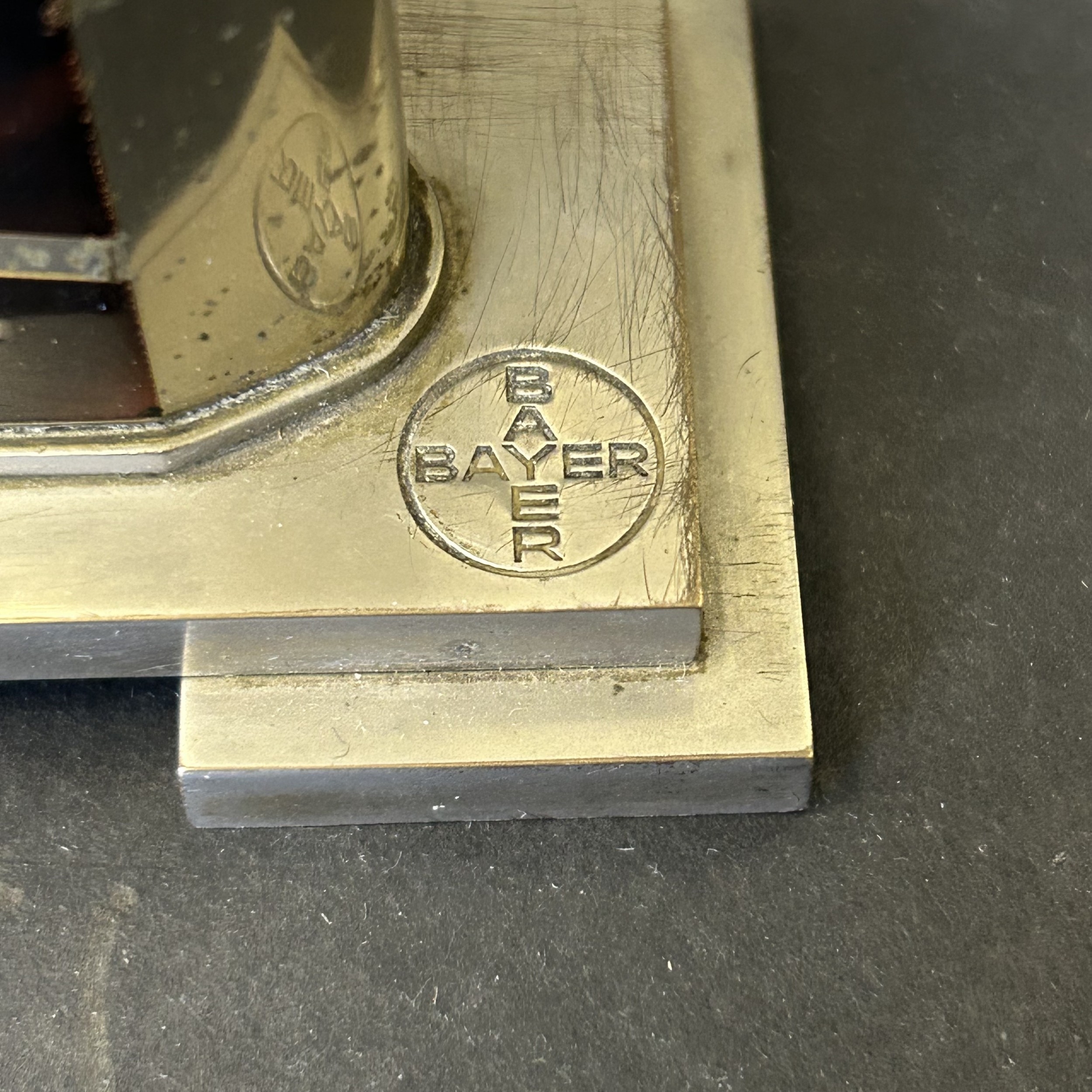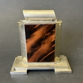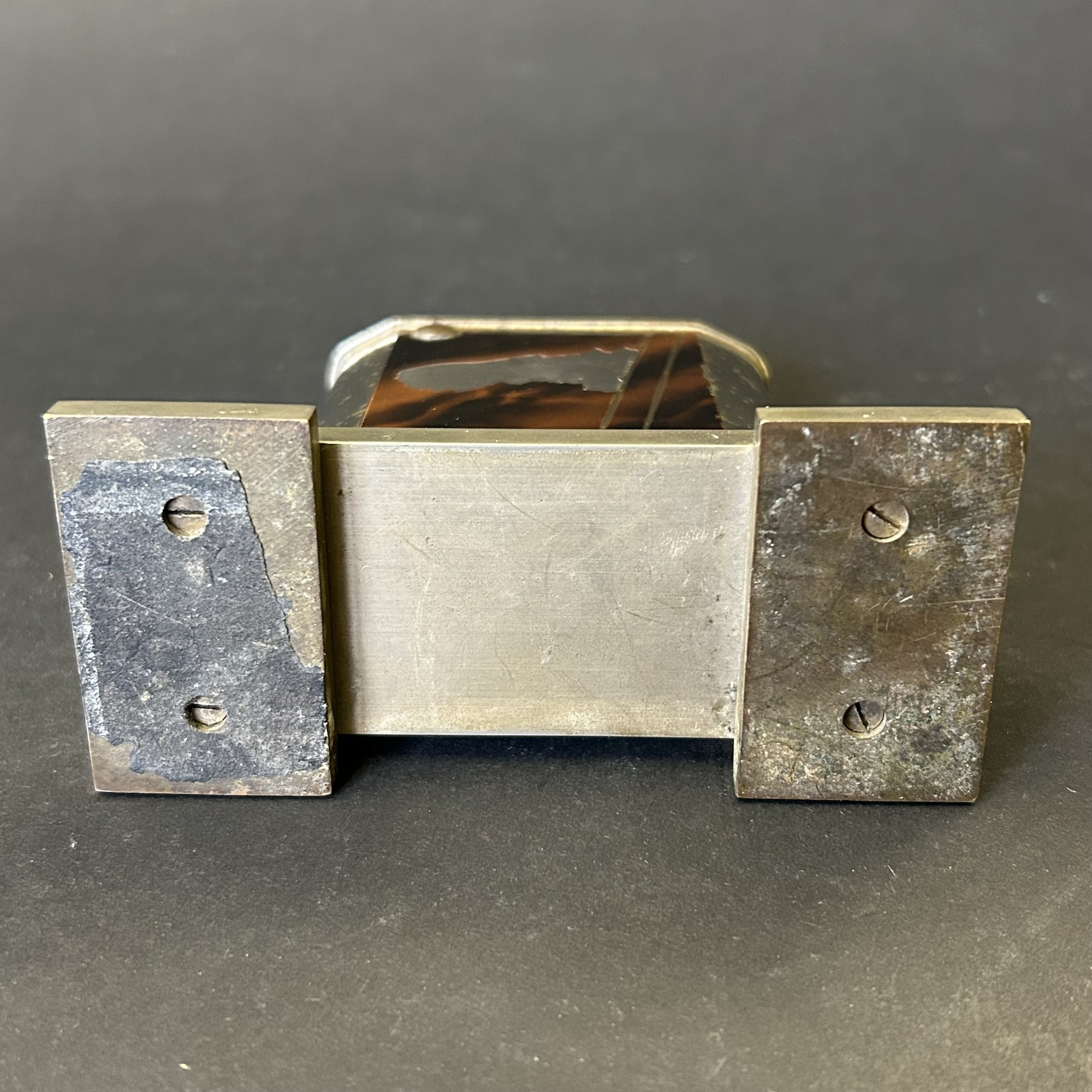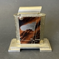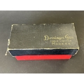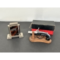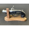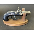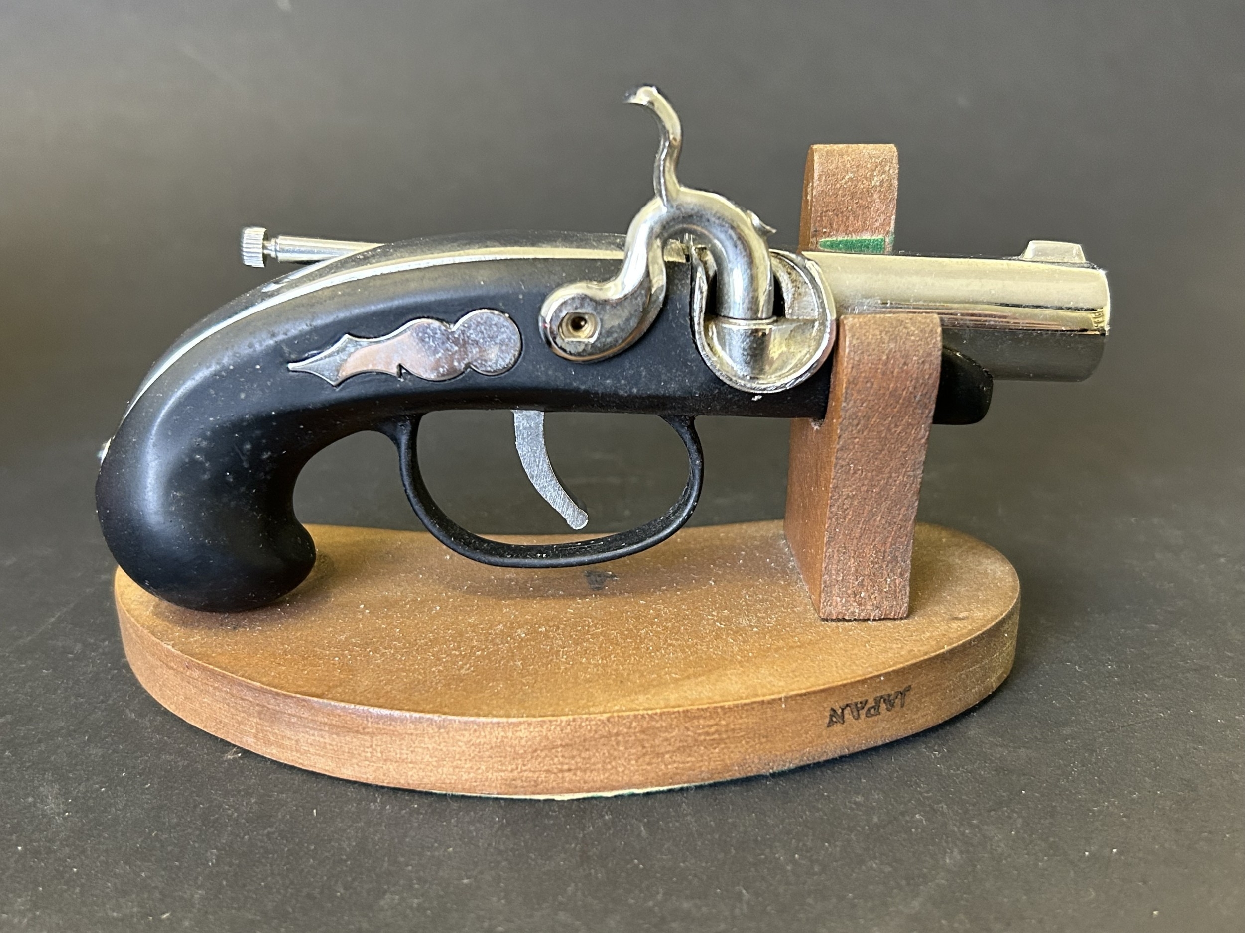 An Art Deco period Bayer large and heavy table lighter with faux tortoiseshell decoration and press button action on side, approx. 4 1/4" high (all appears complete, loss of faux tortoiseshell to the front, signs of age and use, some mottling on metal) together with a boxed vintage Japanese made Derringer gun style table lighter on wooden stand, approx. 5 3/4" long (box with damage)