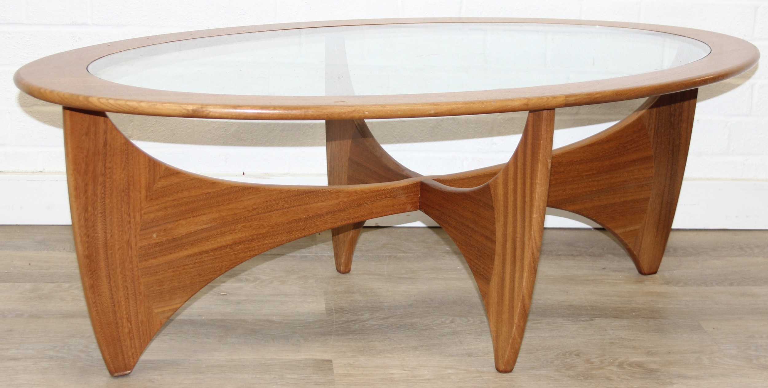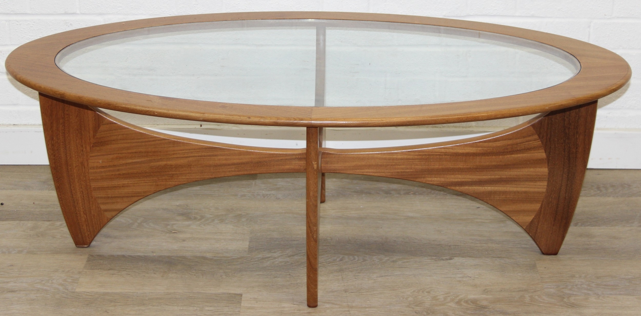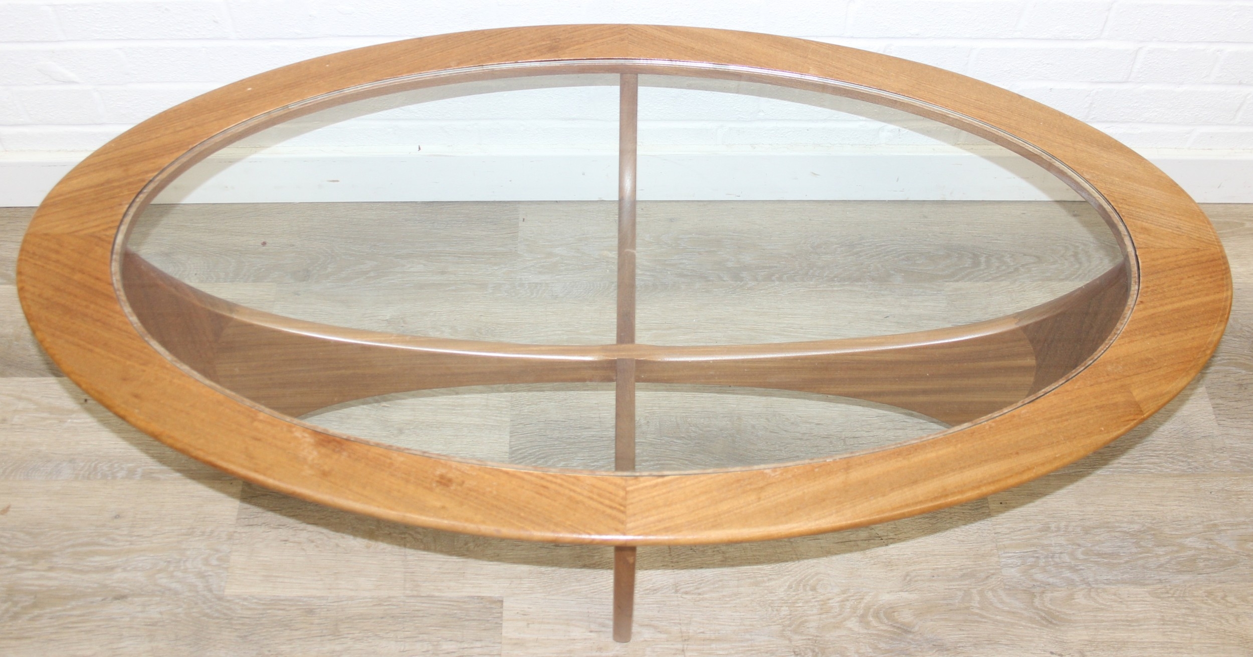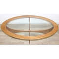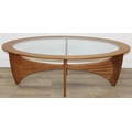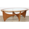 A retro G-Plan oval topped coffee table with glass inset top, 123cm x 66cm x 42cm