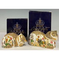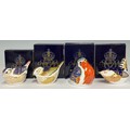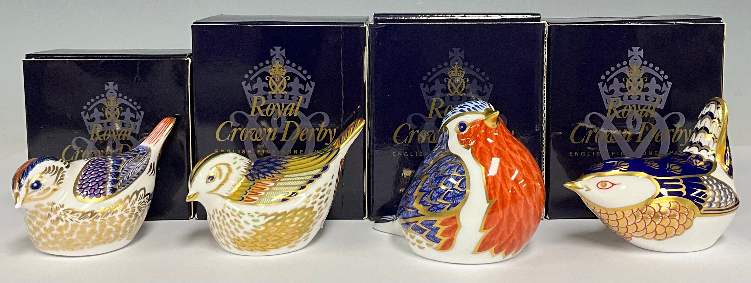 A Royal Crown Derby paperweight, Firecrest, Collector's Guild exclusive, gold stopper, 5.5cm high, printed mark, boxed; others, Goldcrest, gold stopper, boxed; Robin, gold stopper, boxed; Wren, gold stopper, boxed (4)