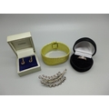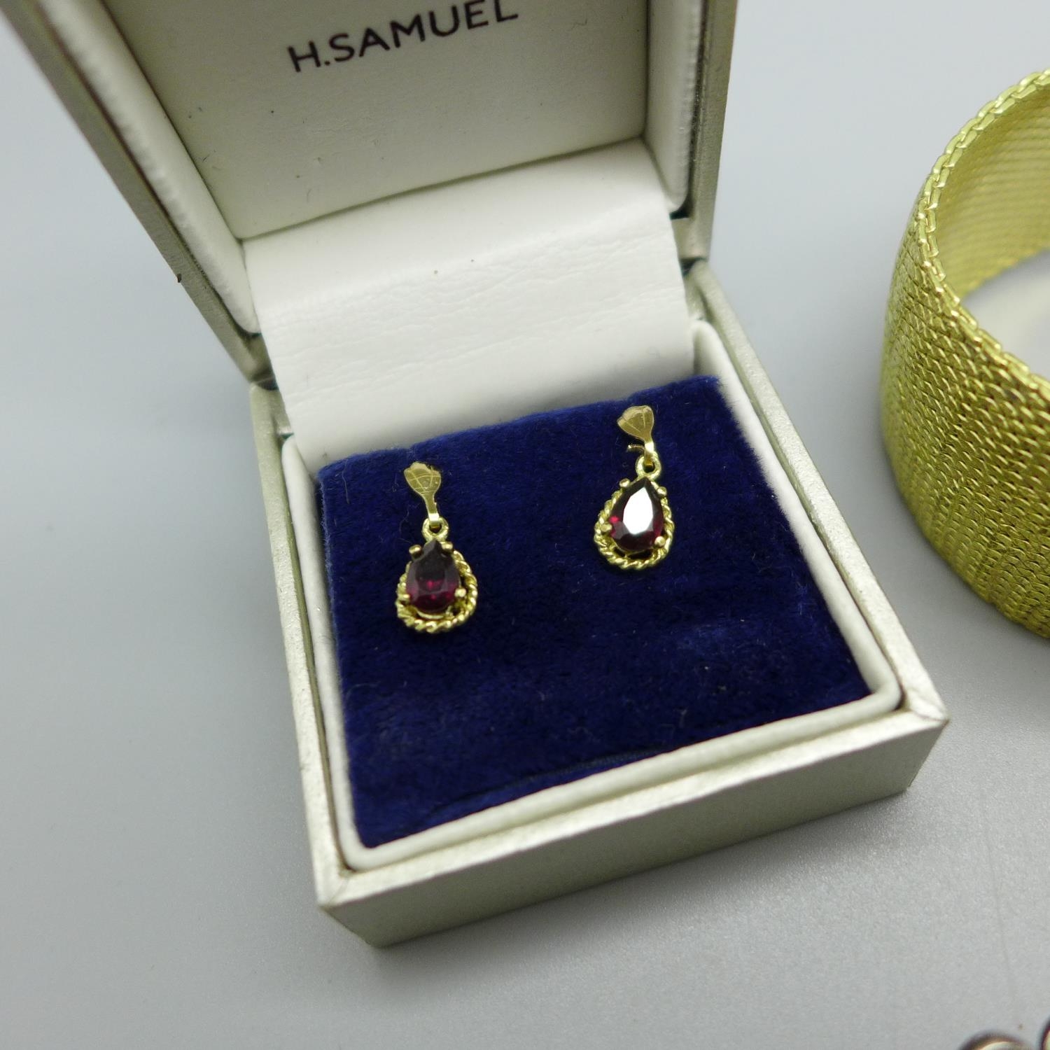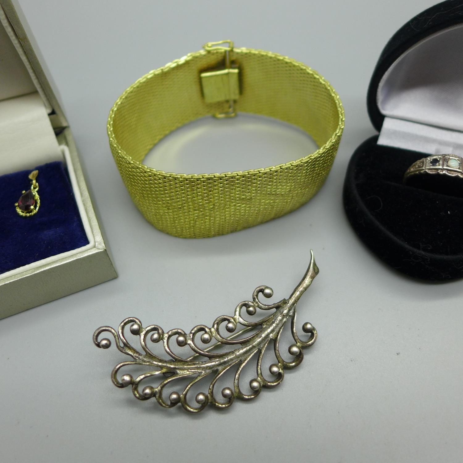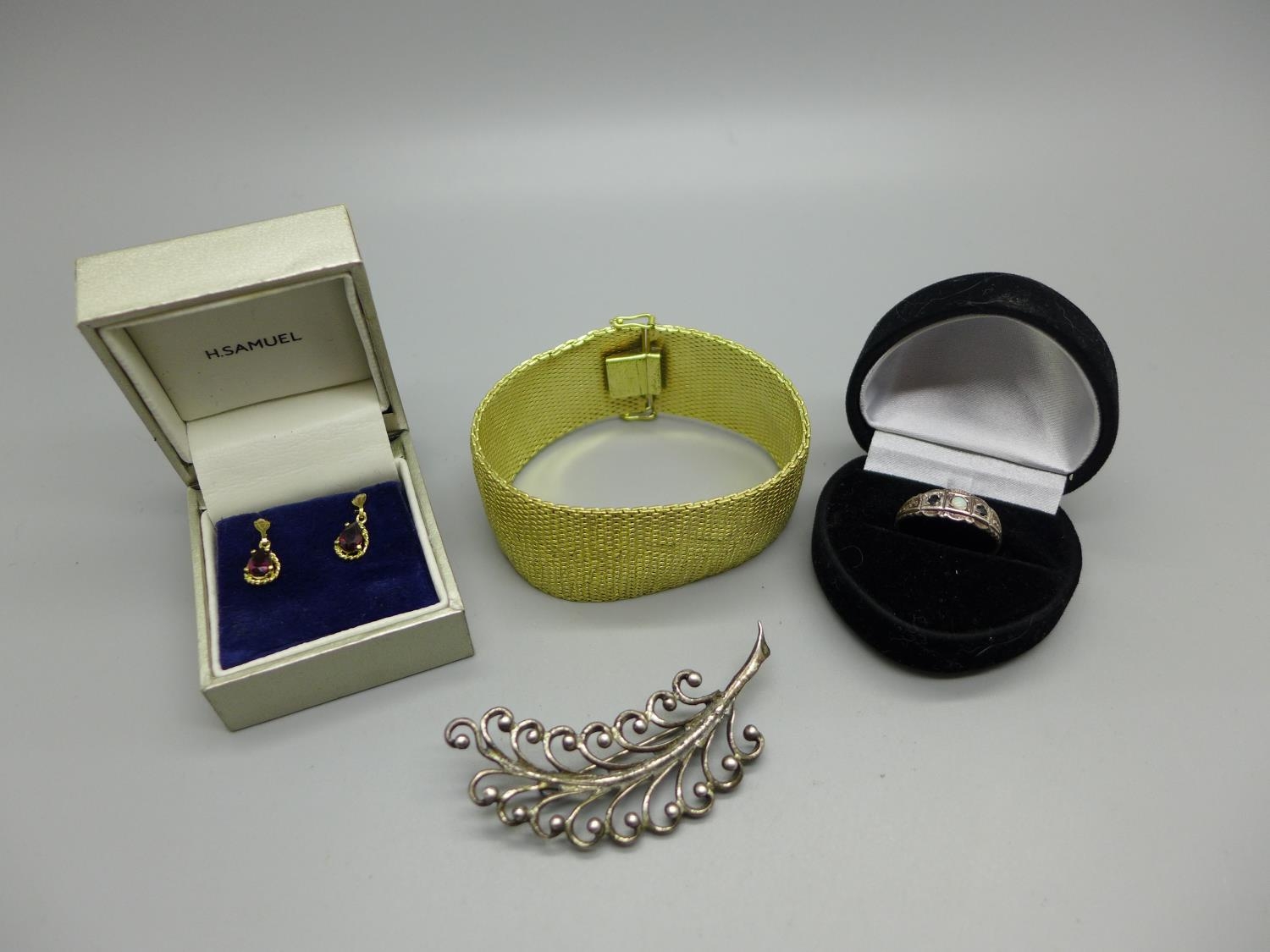 A pair of 9ct gold and garnet earrings, a silver, opal and sapphire ring, a Danecraft silver brooch and a rolled gold bracelet