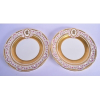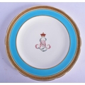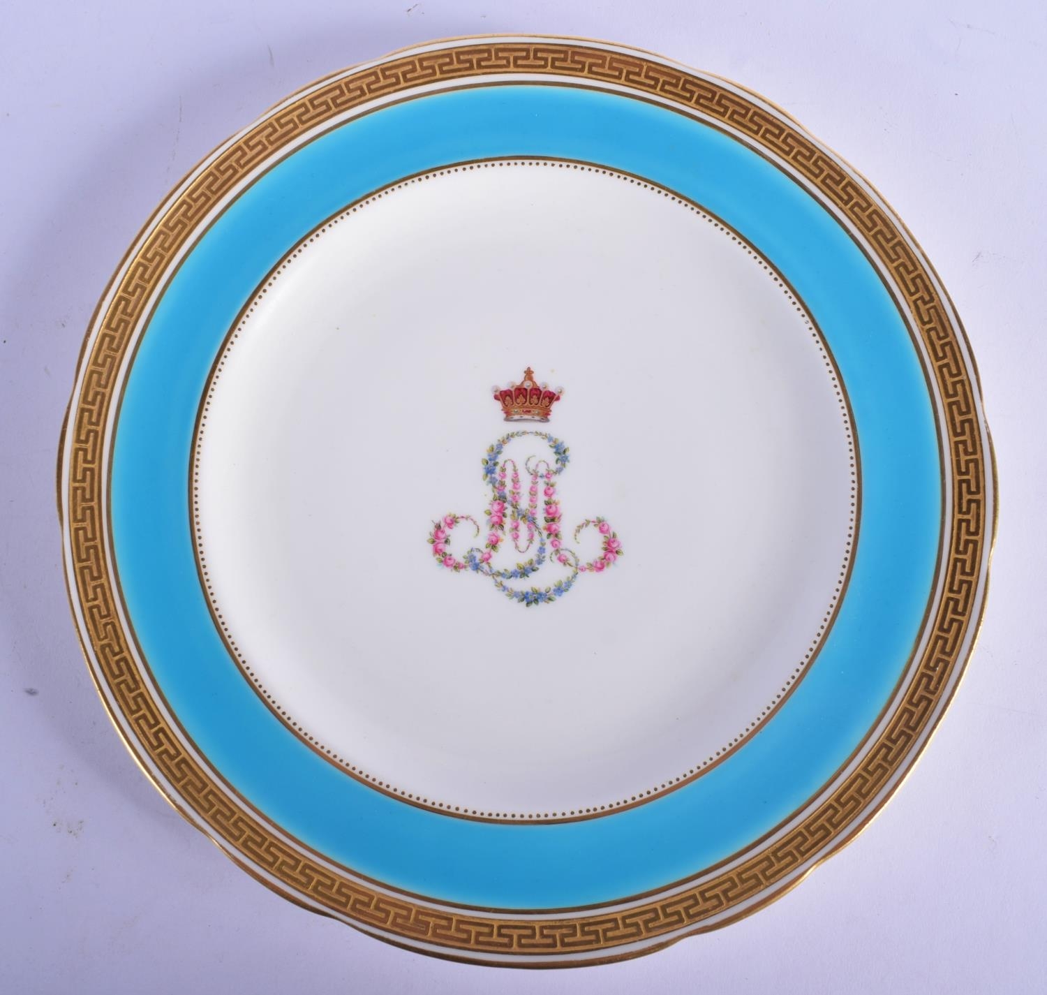 Minton plate with Earls Coronet and initials S. M. under a turquoise and acid etched Greek key border, retailed by Thomes Goode and Co. 24.5cm Diameter