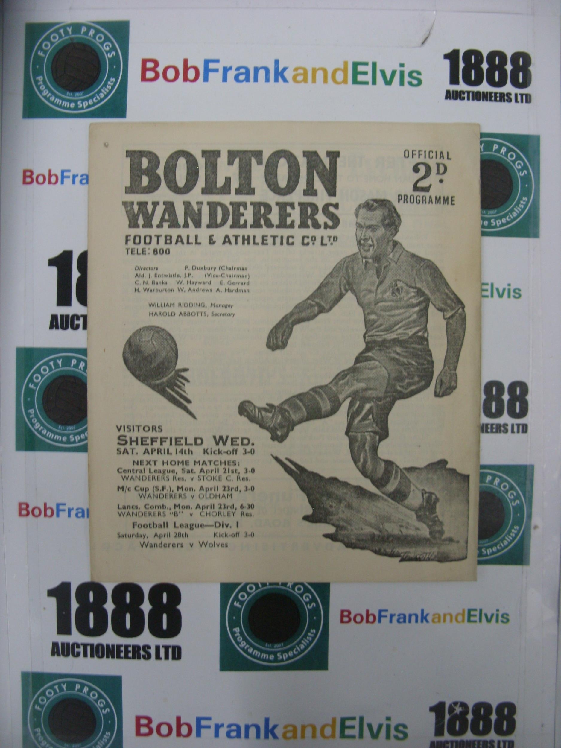 BOLTON WANDERERS, 1950/1951, a football programme from the game versus Sheffield Wednesday, played on 14/04/1951 (pin hole in corner).