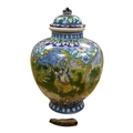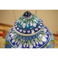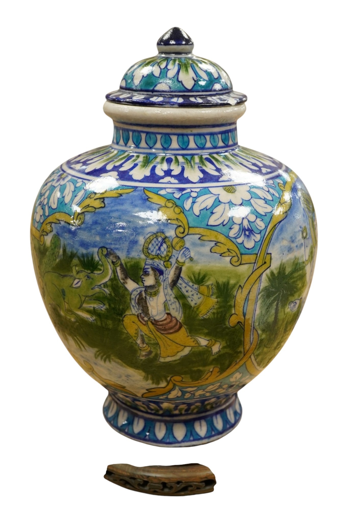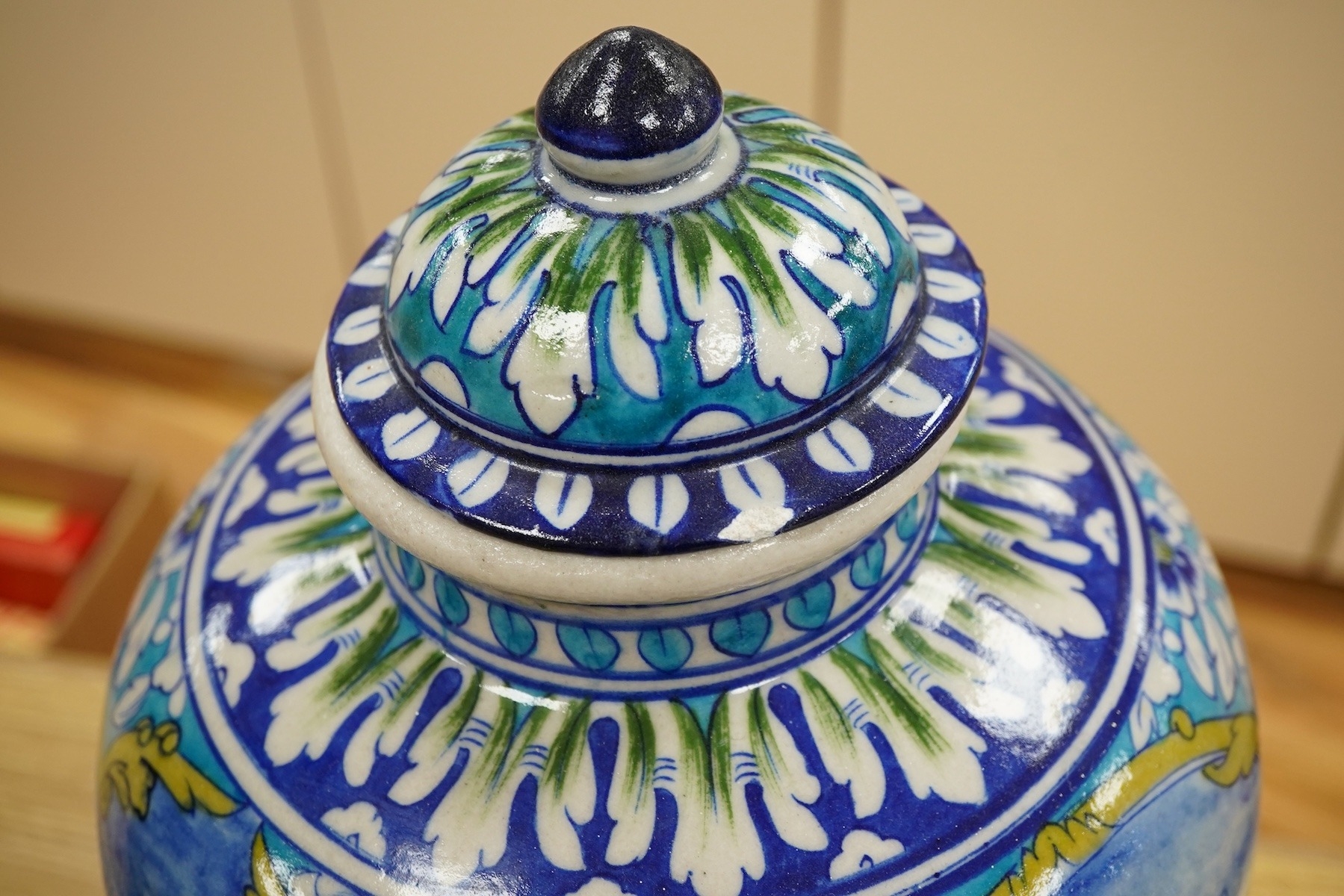 A Persian glazed pottery baluster jar and cover on associated hardwood stand, 41cm high