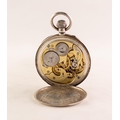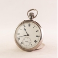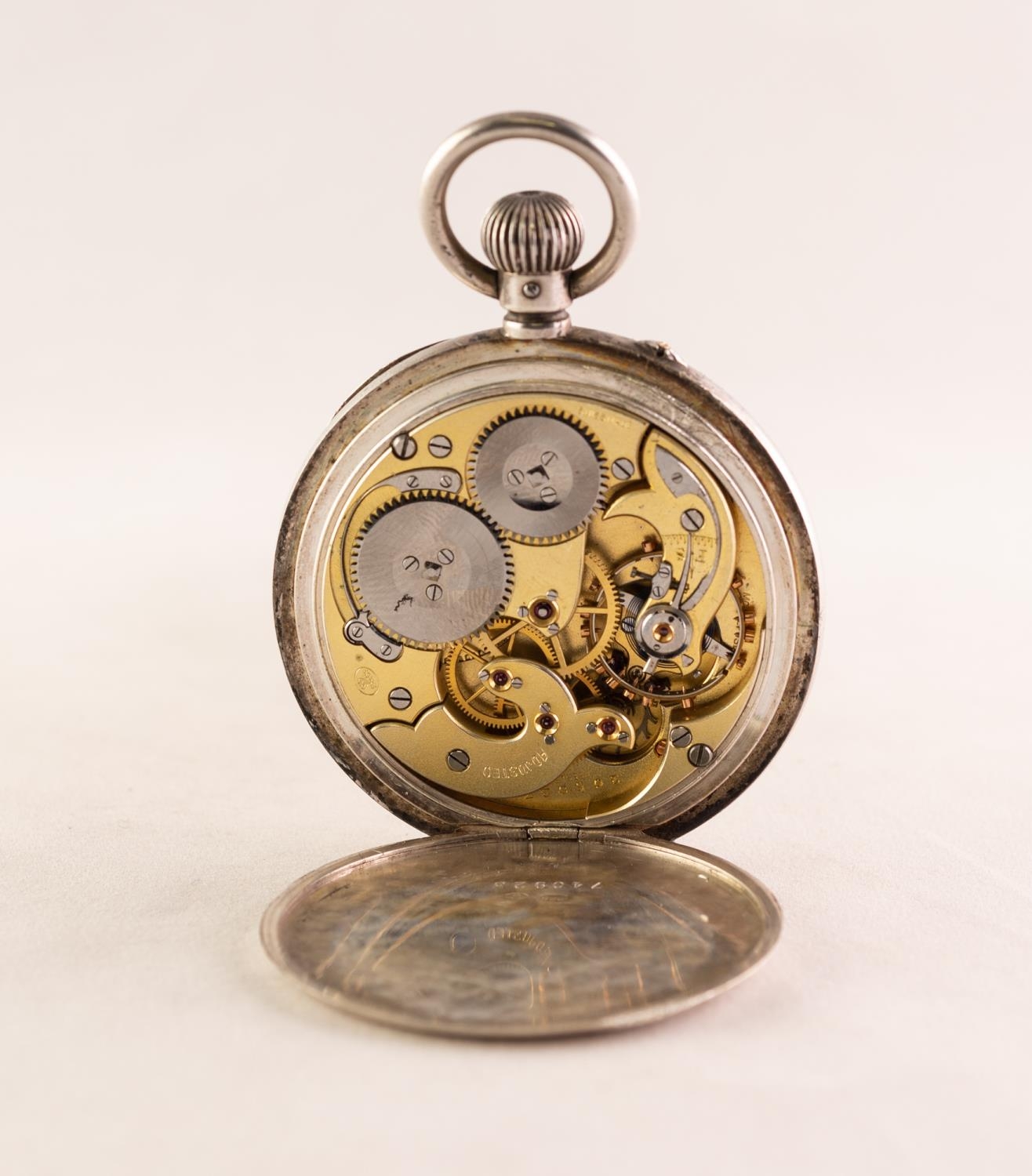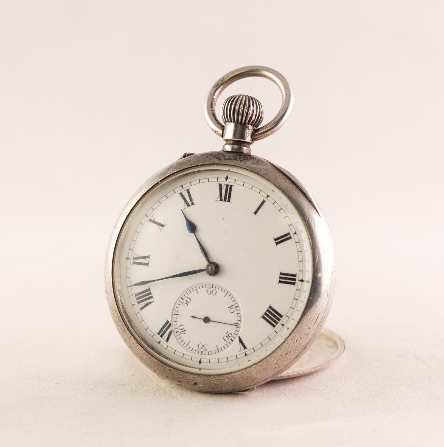 I.W.C. STAUFFER and CO 'PEERLESS' SWISS LEVER POCKET WATCH with keyless movement, No 305037, the white roman dial having subsidiary seconds dial, in silver case, London import mark 1918 and S&Co with crown (c/r working, hinge to back plate broken)