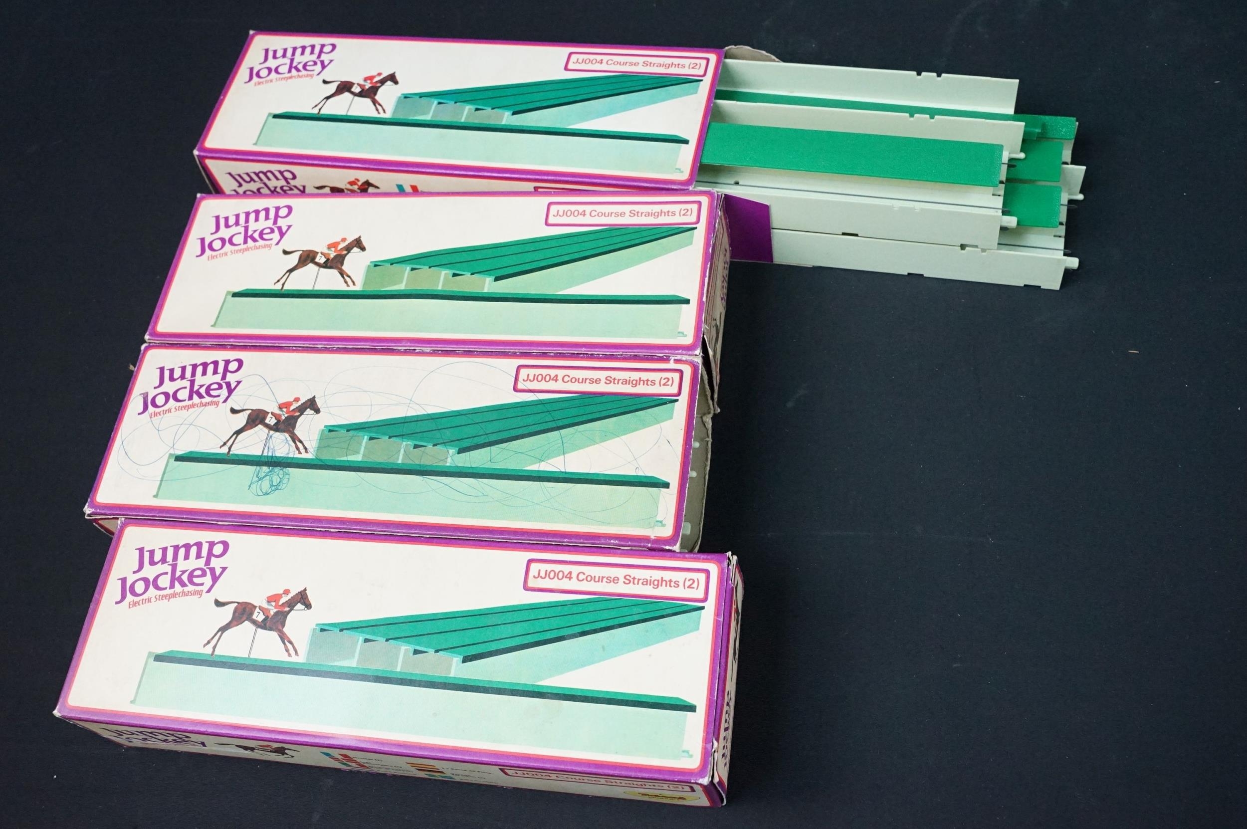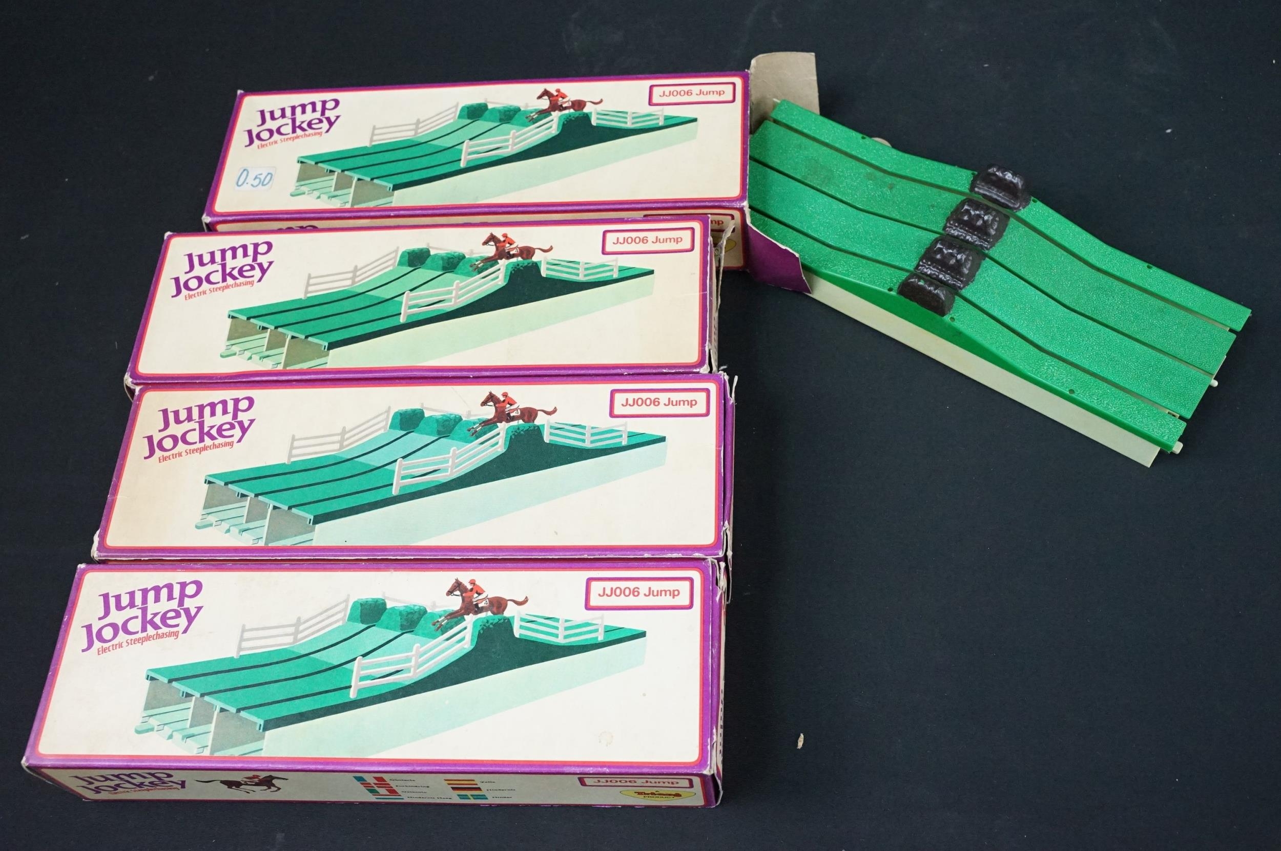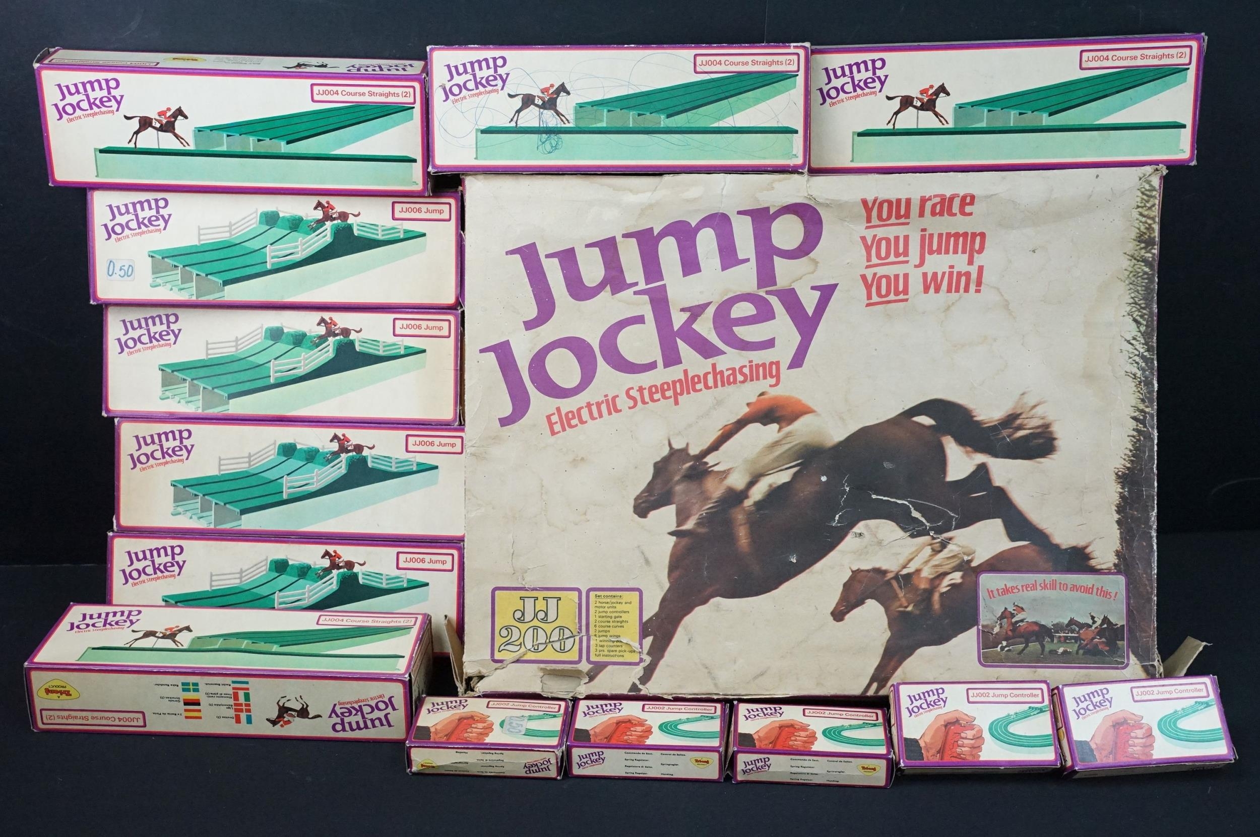 Collection of boxed Triang Jump Jockey Electric Steeplechasing to include JJ200 Set (missing 1 x horse and 2 x controllers), and 15 x accessories featuring 2 X JJ001 Horse, Jockey and Motor Unit, 5 x JJ002 Jump Controller, 4 x JJ006 Jump and 4 x JJ004 Course Straights