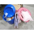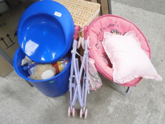 Lot inc kids seat, plastic bin, wicker laundry basket and toys