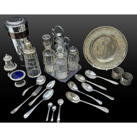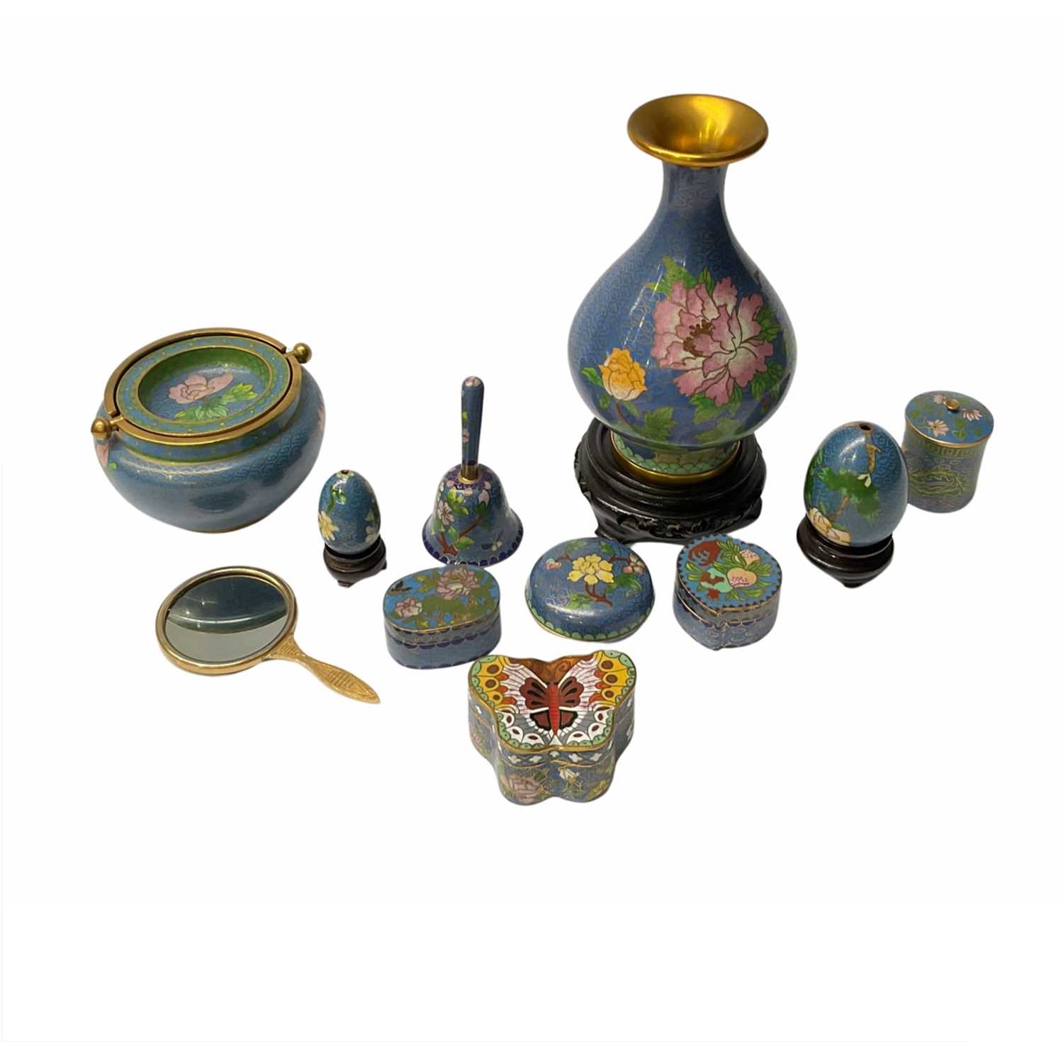 A collection of Cloisonne brass wire and enamel vessels, boxes and decorative items, decorated with floral motifs on a cloud repeat pattern and blue enamelled ground, and three wooden stands, tallest baluster form vase 16cm high (15)