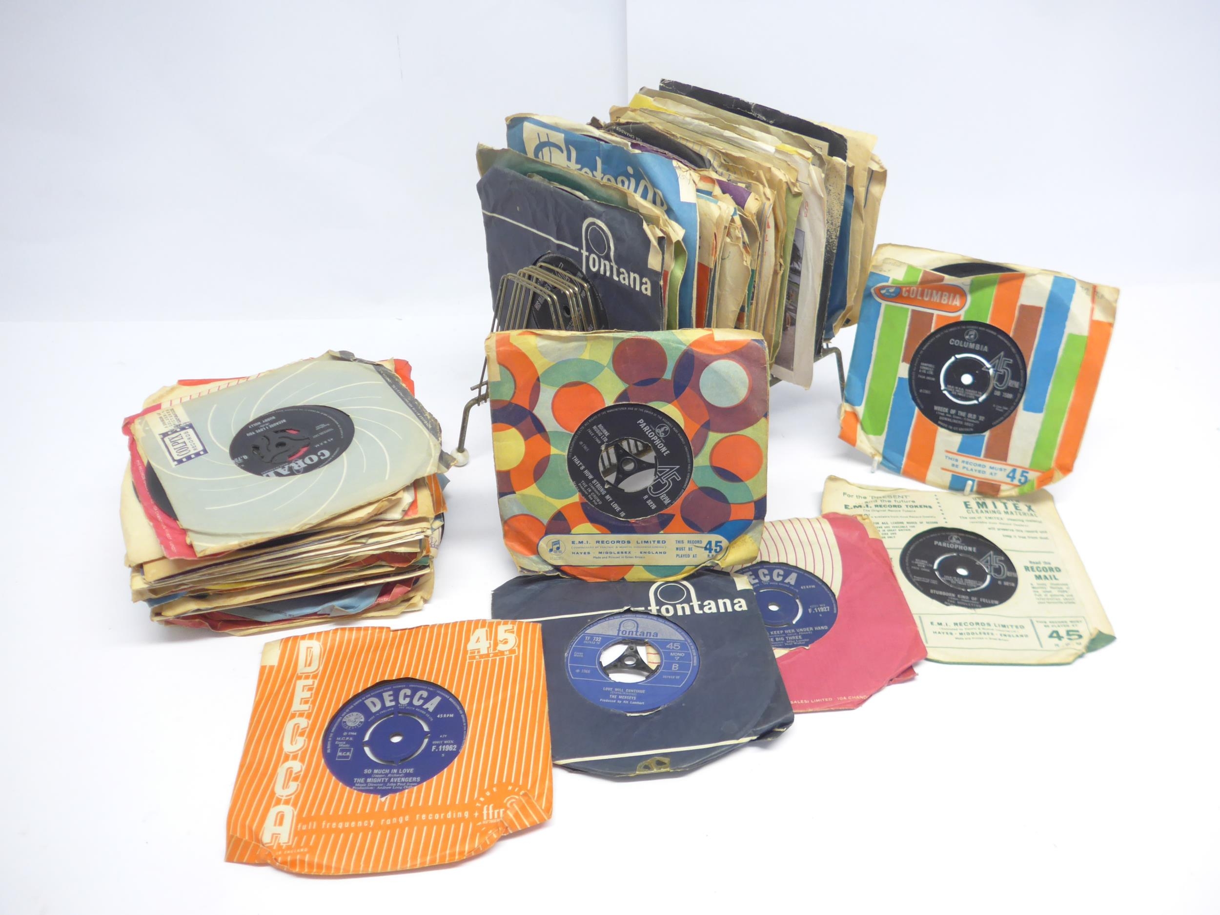 Rock / Pop / Beat - A collection of approximately seventy-five predominantly 1960s 7" singles including The Merseys, Downliners Sect, The Big Three, the In Crowd, The Mighty Avengers, The Roulettes, Manfred Mann, The Paramounts, The Swinging Blue Jeans, The Tornados, Donovan, Jan & Dean, Bob Dylan, Beau Brummell Esquire & His Noble Men, the Nashville Teens, Ronny & The Daytonas, Jerry Gilmer And The Fireballs, The Hollies, The Kinks, The Animals, The Yardbirds, The Quiet Five, The Poets, The Beatles, etc (approx. 75, condition varies but vinyl generally VG, would benefit from cleaning). Together with a wirework record rack