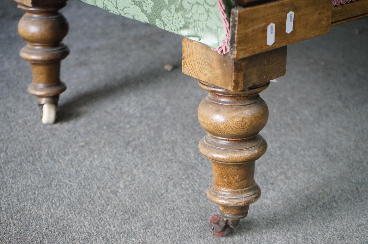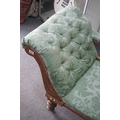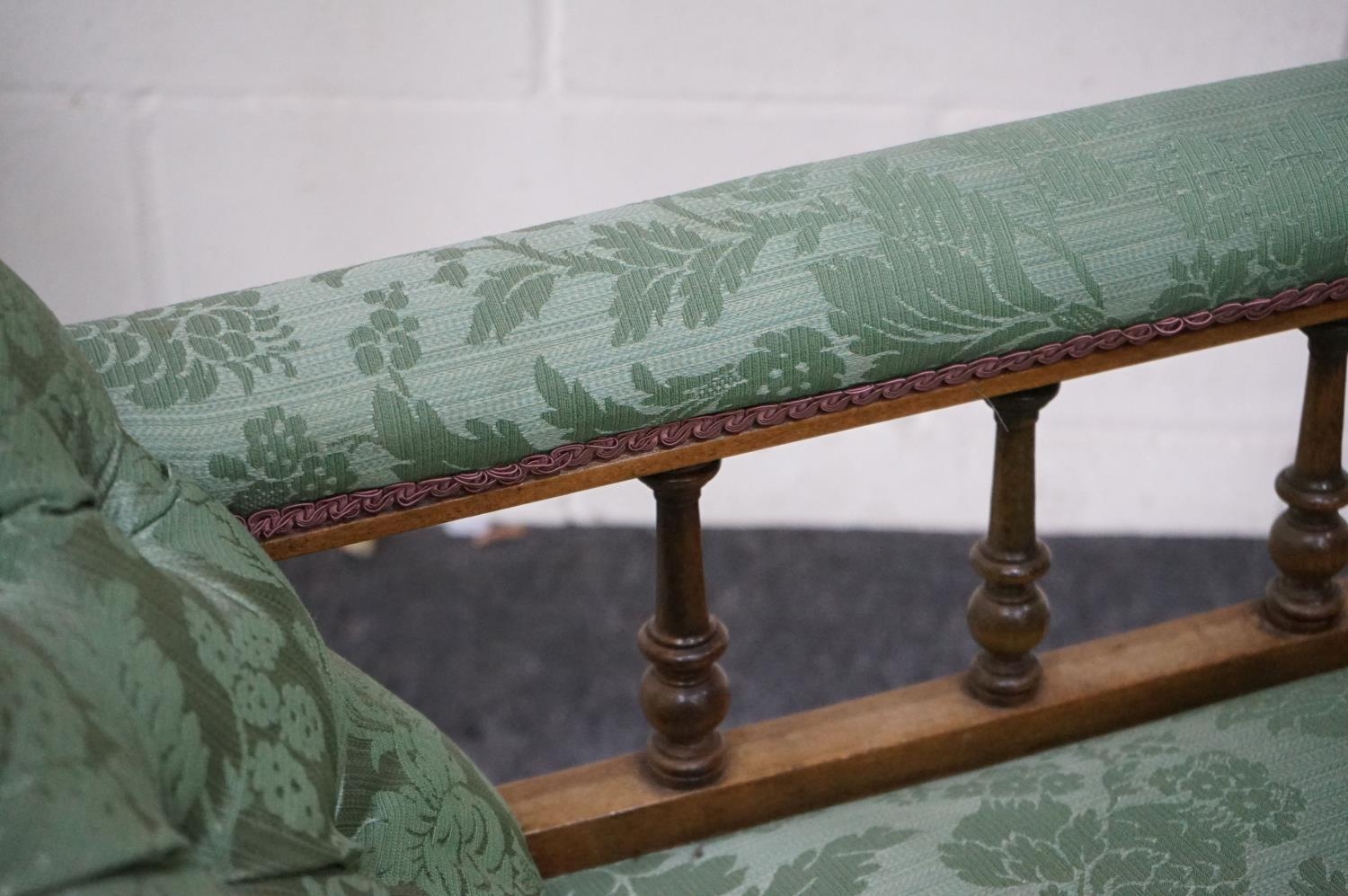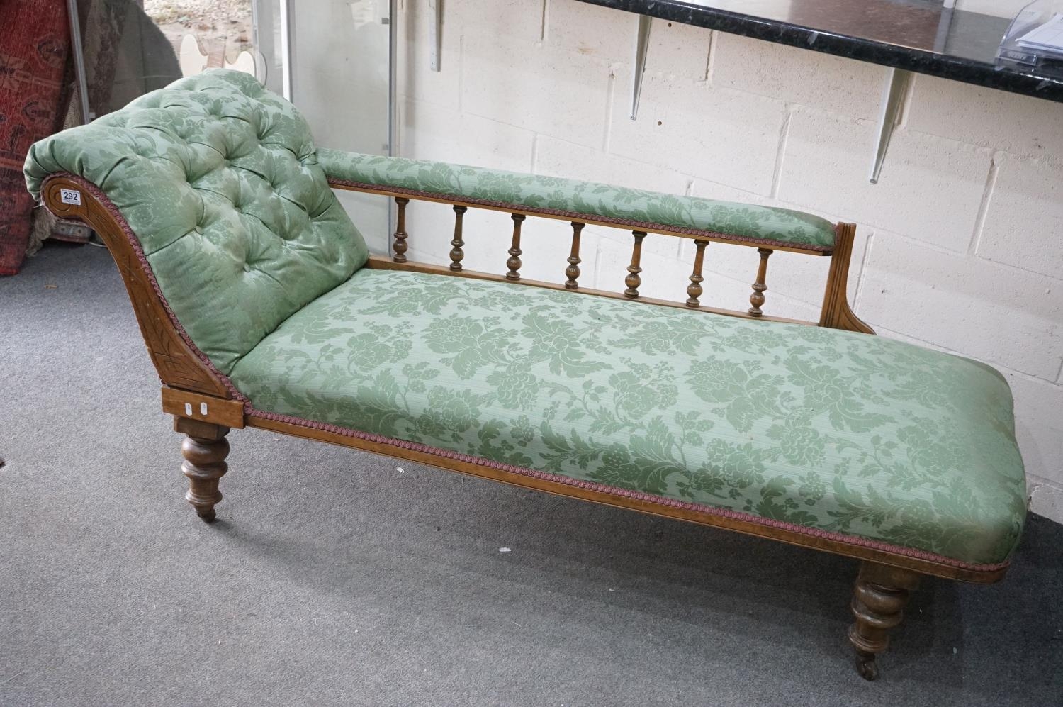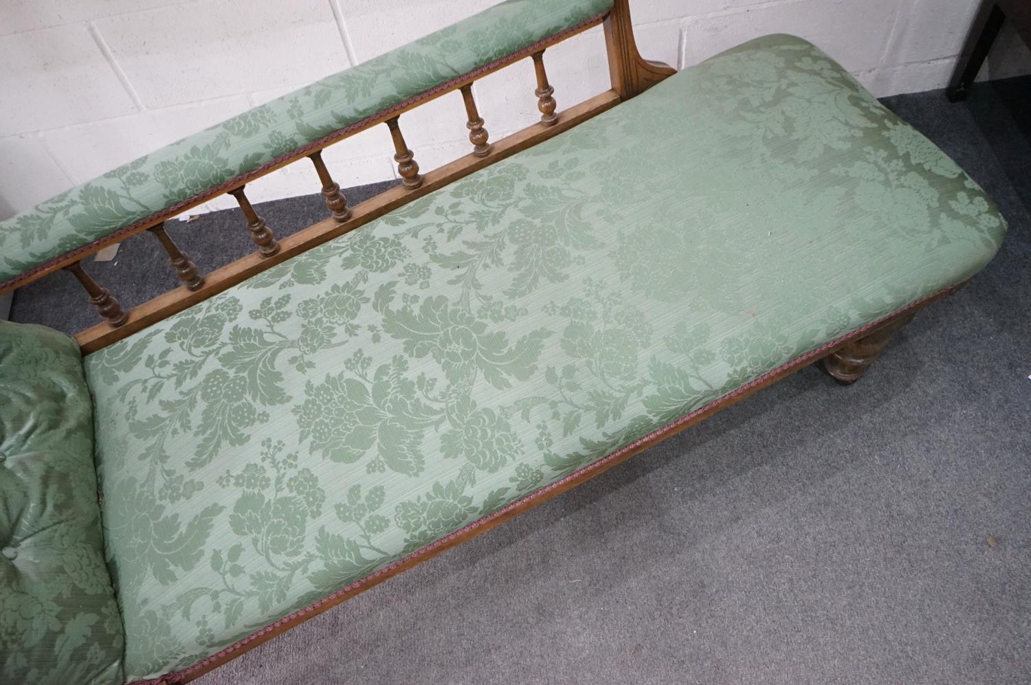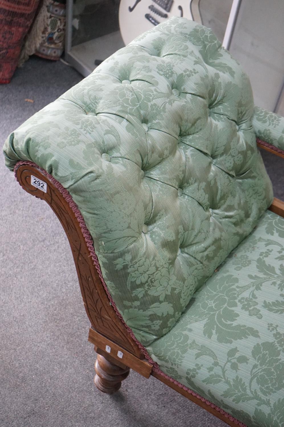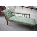 Victorian Walnut Framed Chaise-lounge with green button back upholstery, raised on turned legs with castors, 180cm long x 78cm high