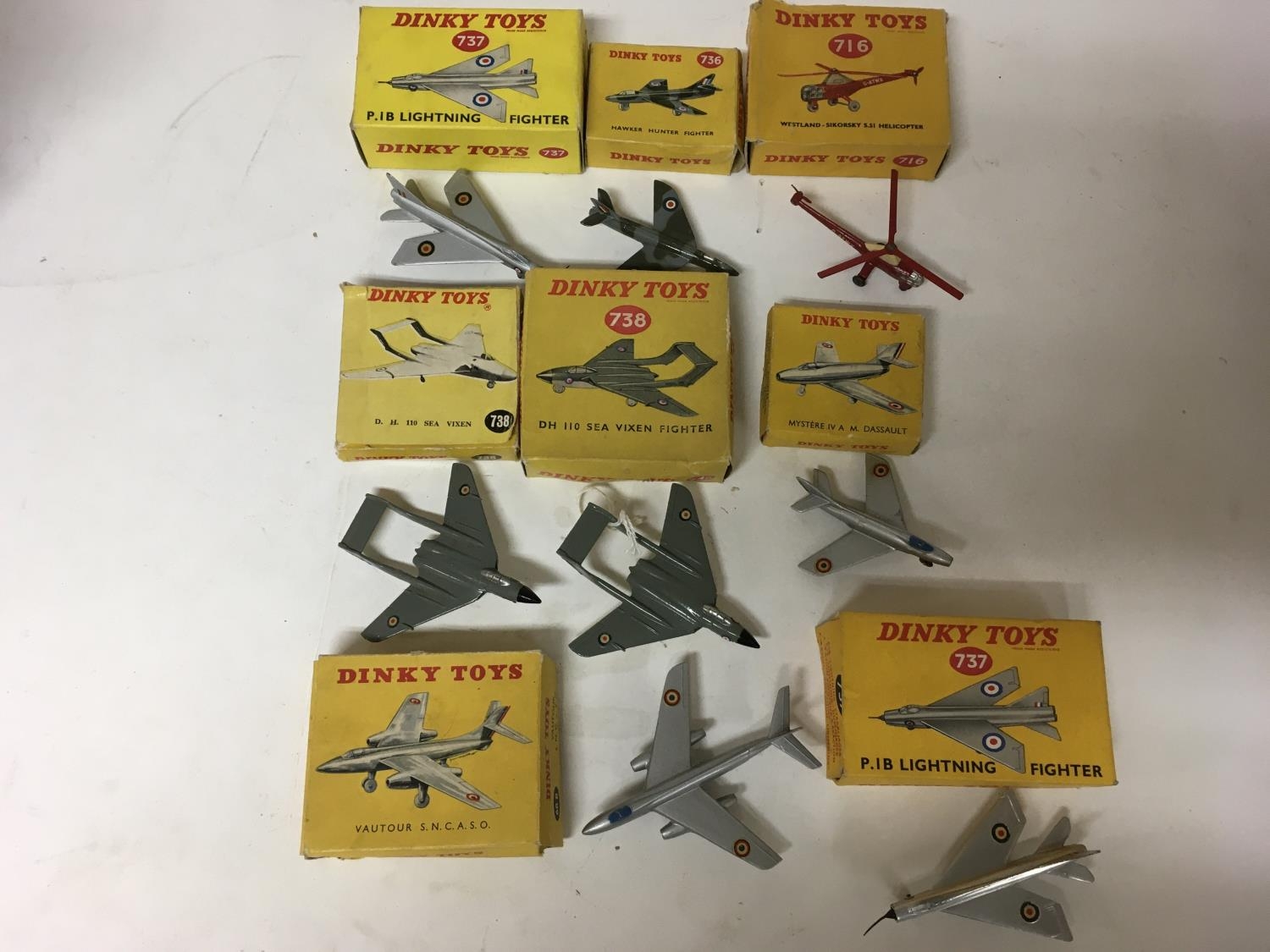 Dinky toys, a collection of boxed Diecast aircraft including #737 Lightning fighter x2, #736 Hawker Hunter fighter, #716 Westland helicopter, #738 Sea Vixen fighter x2, #60A fighter and #60B fighter, boxed