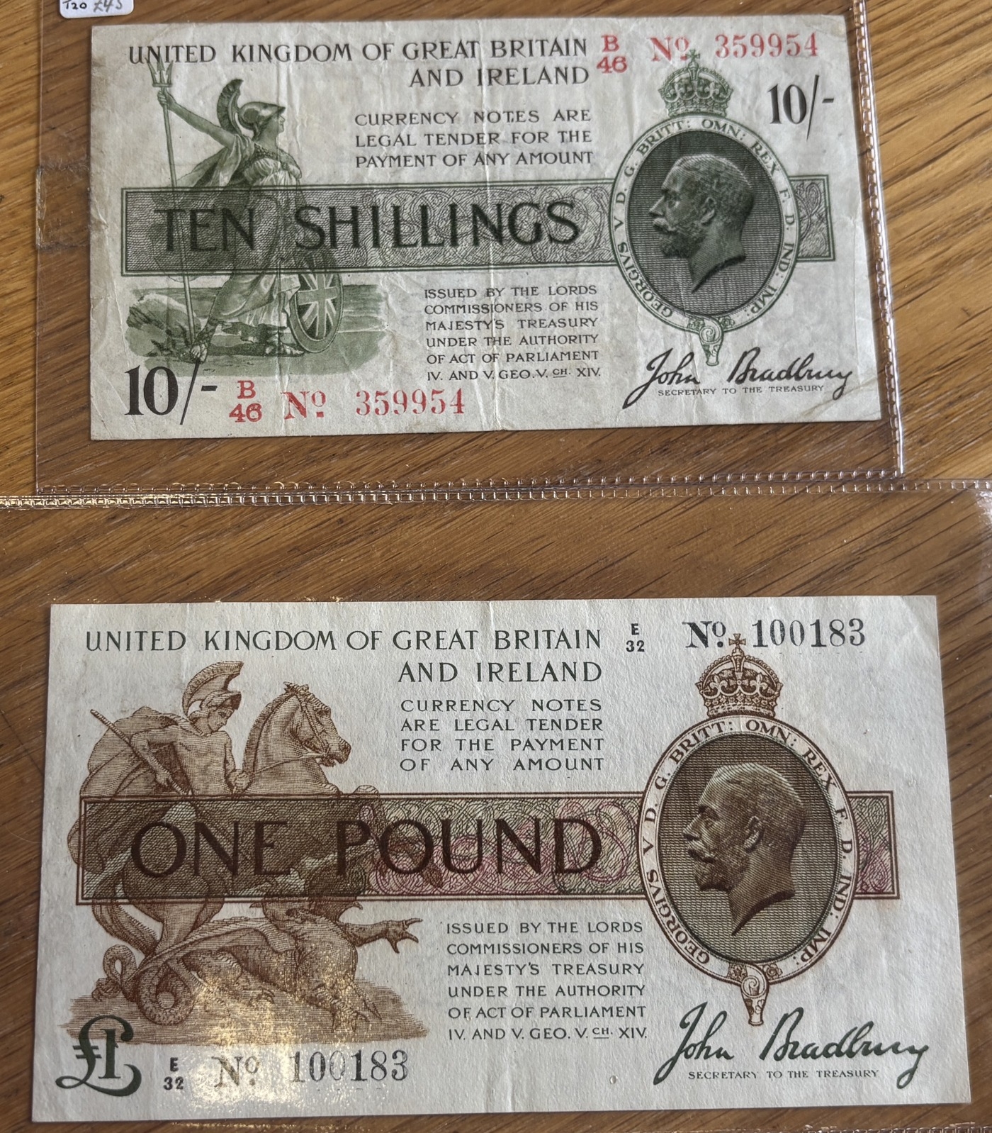 J.S. Bradbury. 3rd issue £1 E32 10013 and 10/- B46 359954. Very fine in plastic sheets. Qty 2. (Duggleby T16 and T20) (N)