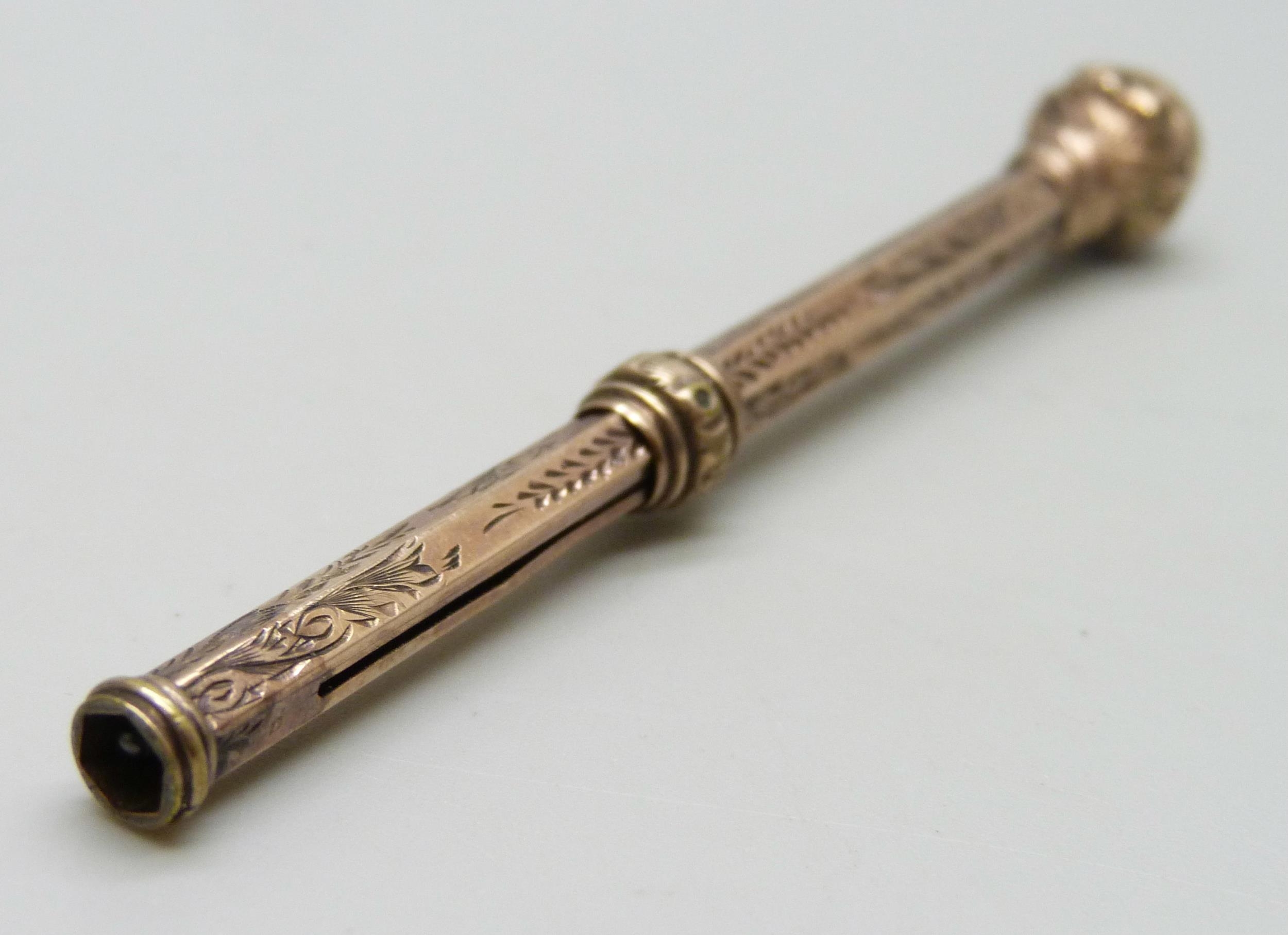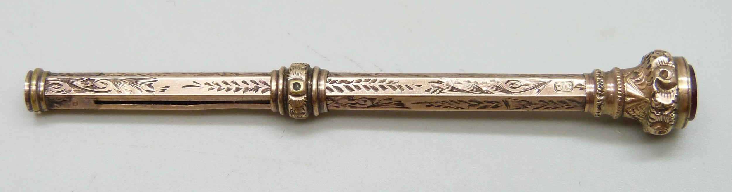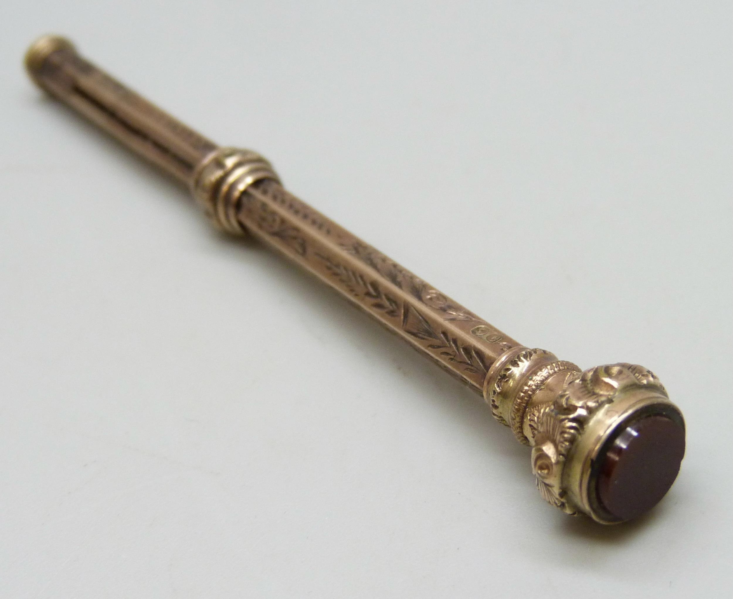 A Victorian 9ct gold propelling pencil with carnelian seal end, mechanism a/f, 8.4g total weight