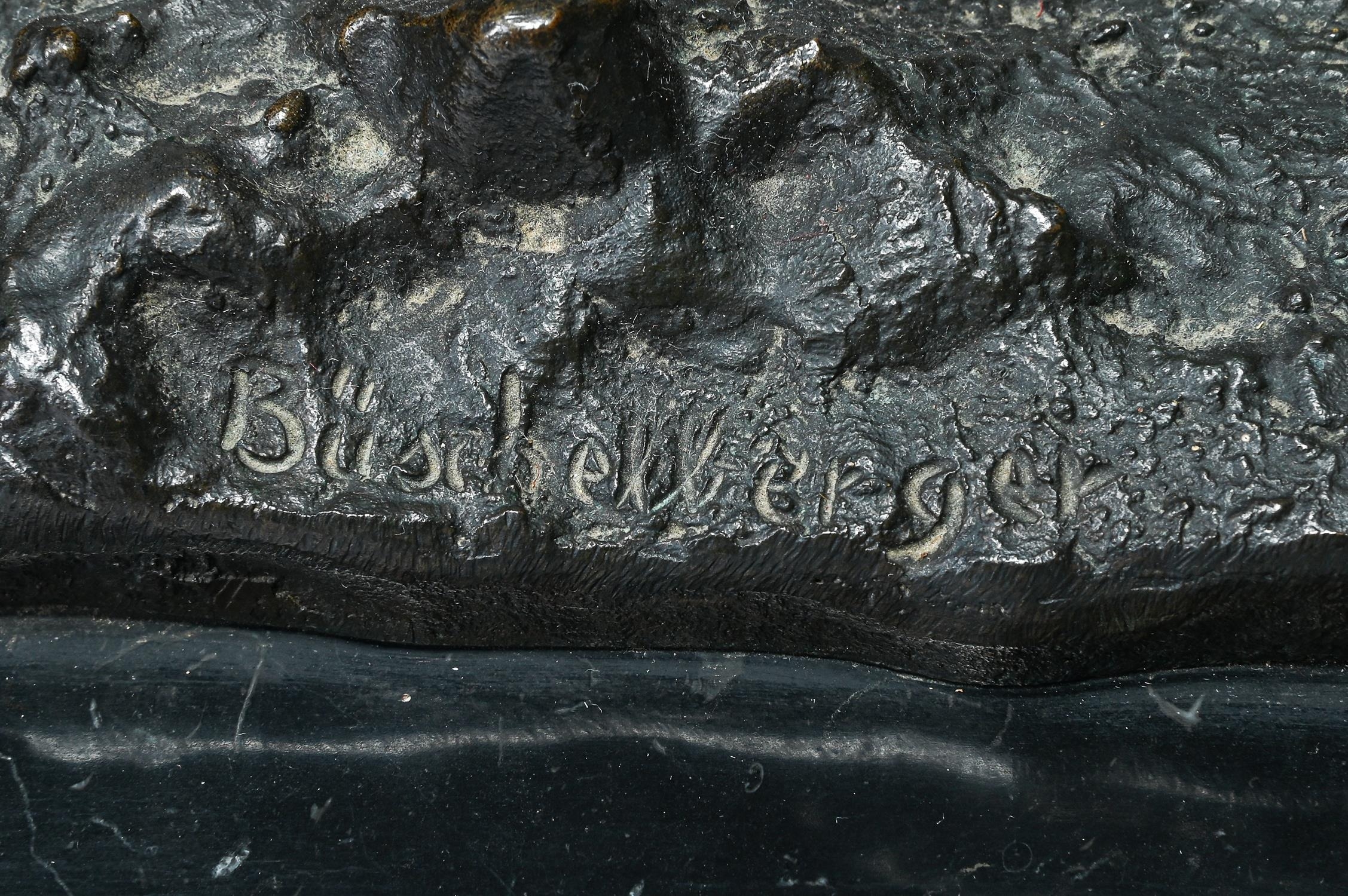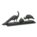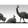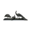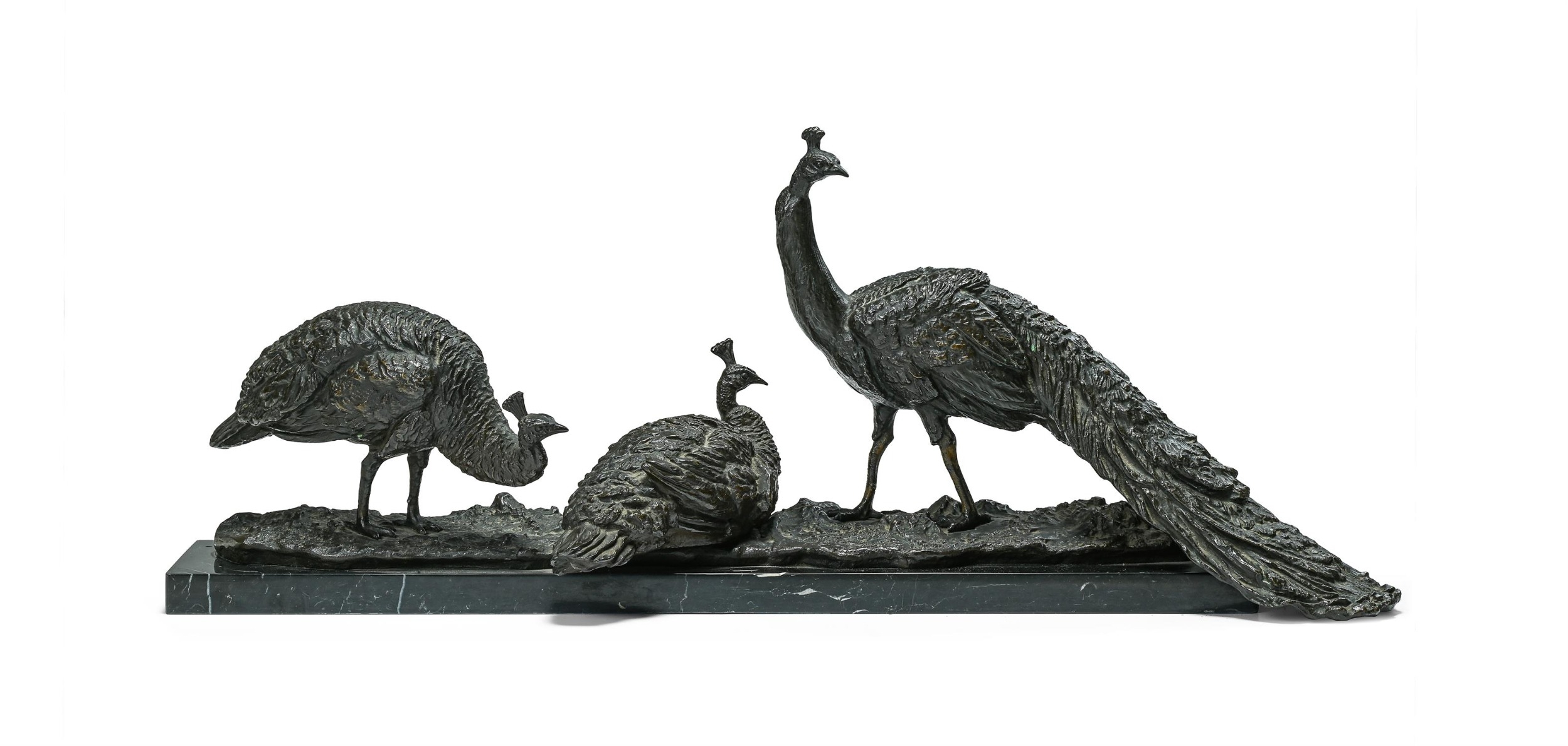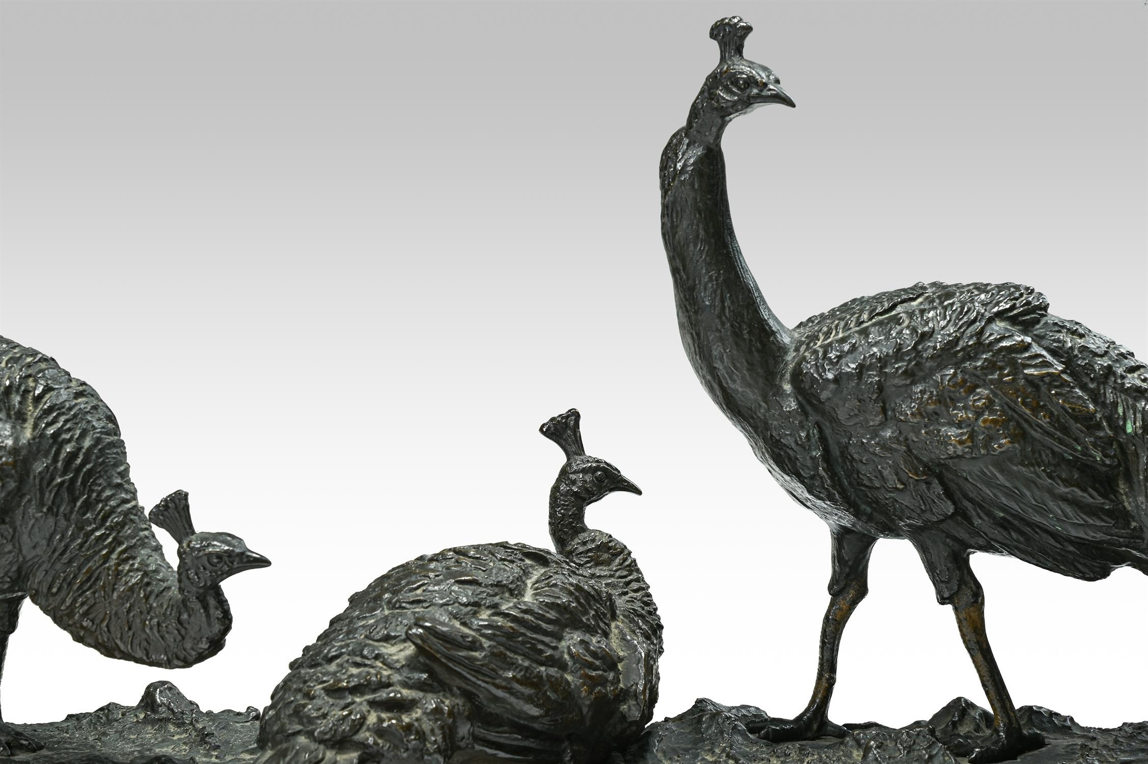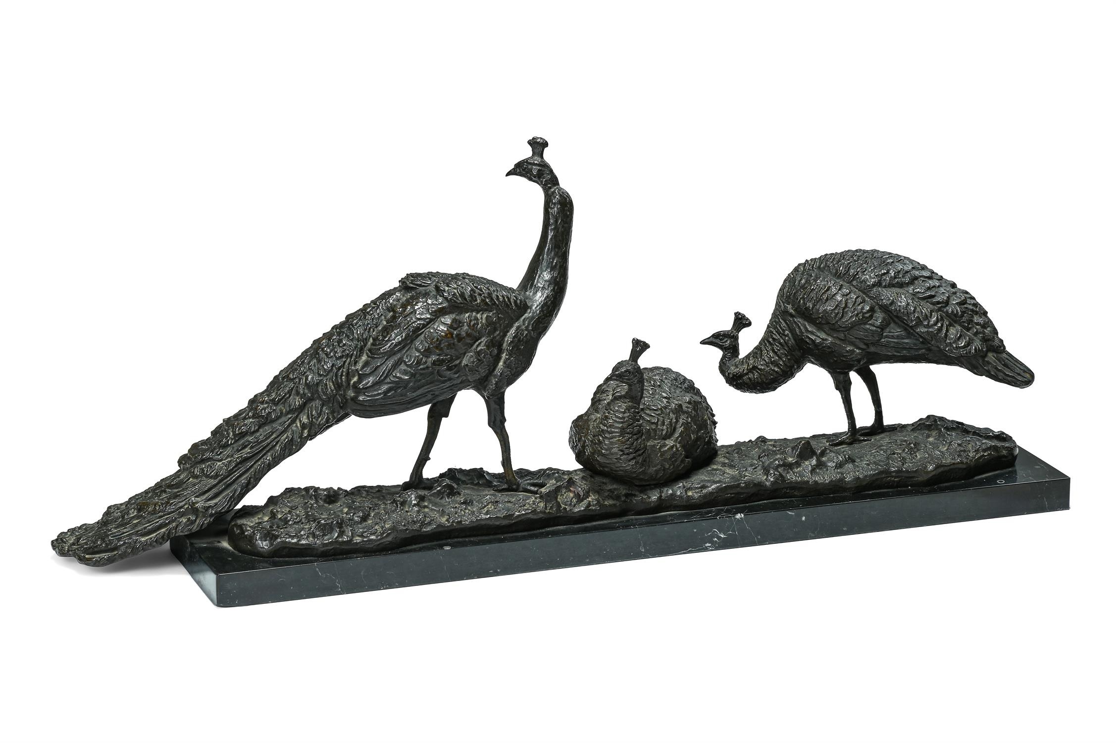 ANTON BUSCHELBERGER (1869-1934)- ANIMALIER BRONZE OF THREE PEACOCK FOWLS EARLY 20TH CENTURY Signed to cast, set on marble plinth 34cm high, 86cm long overall