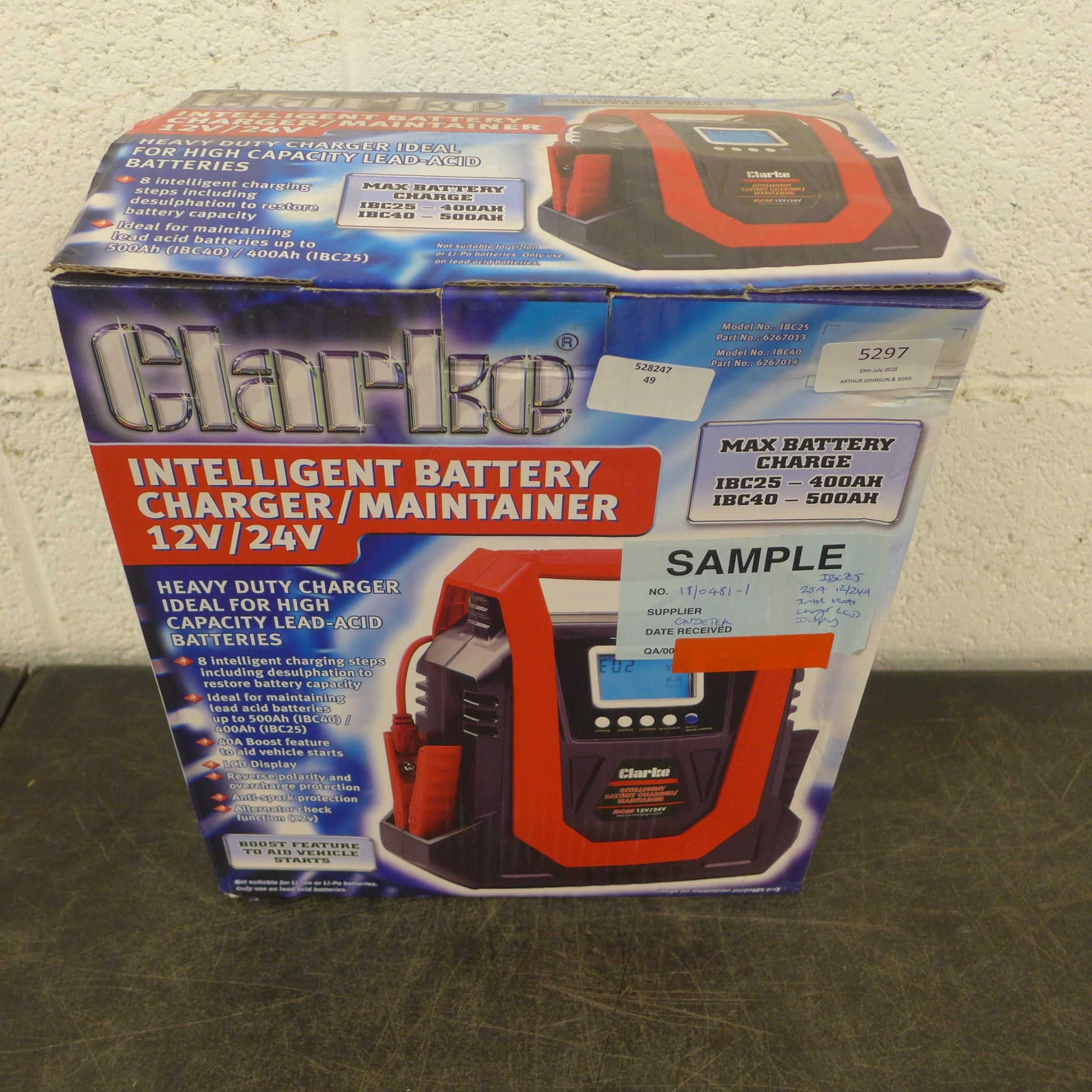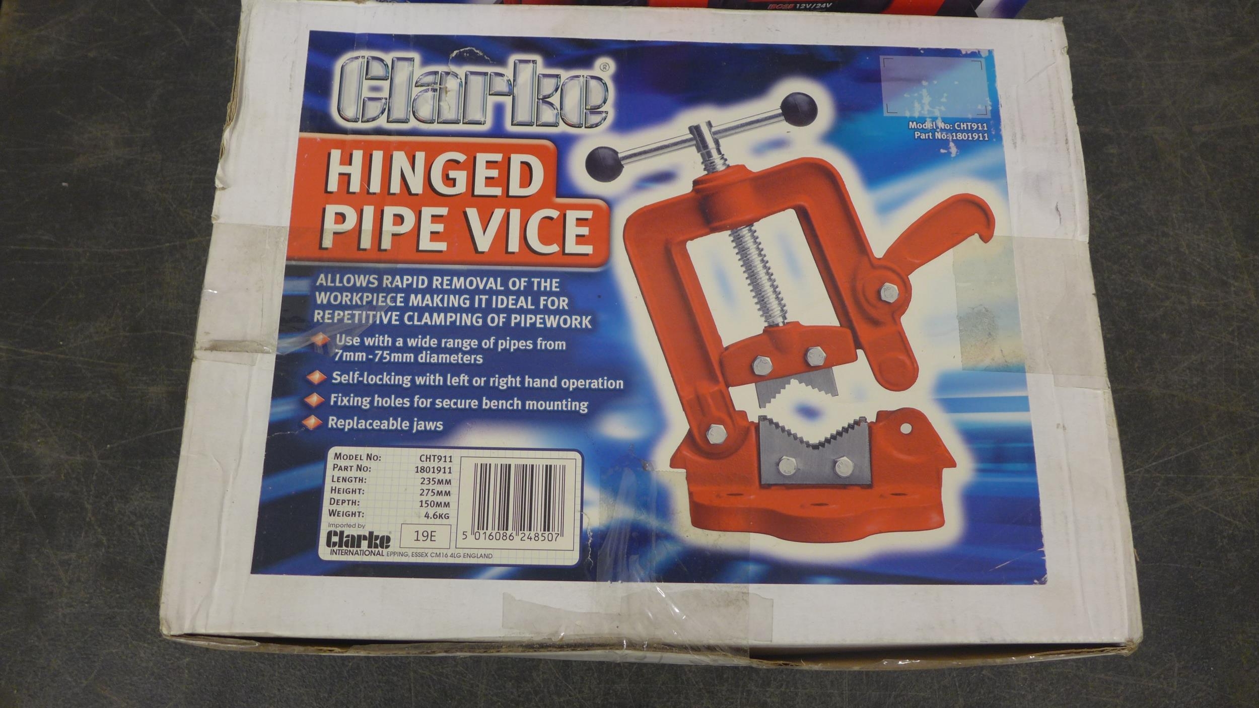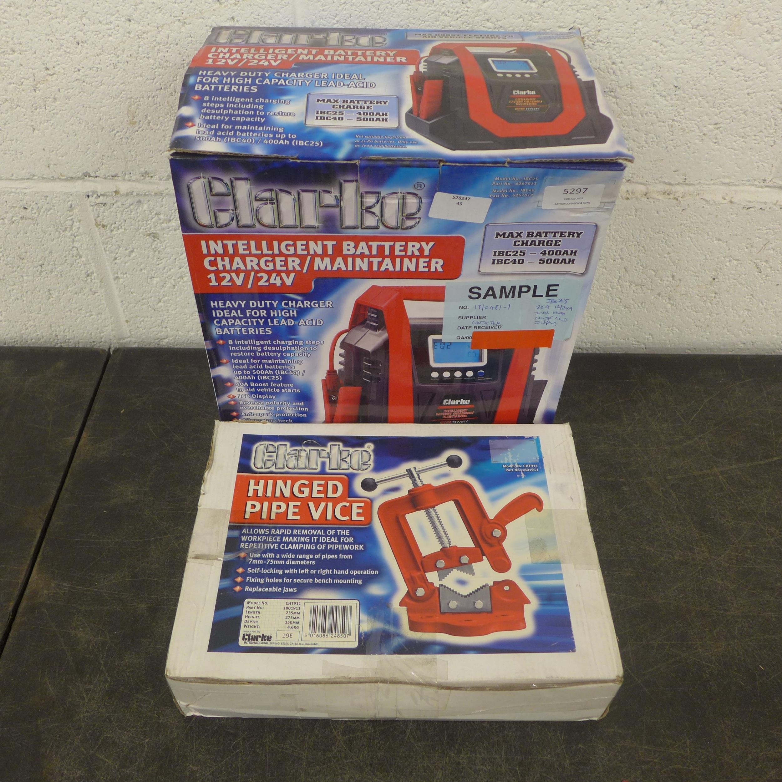 A boxed Clarke IBC25 Intelligent battery charger/maintainer 12v/24v and a boxed hinged pipe vice *This lot is subject to VAT
