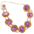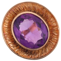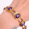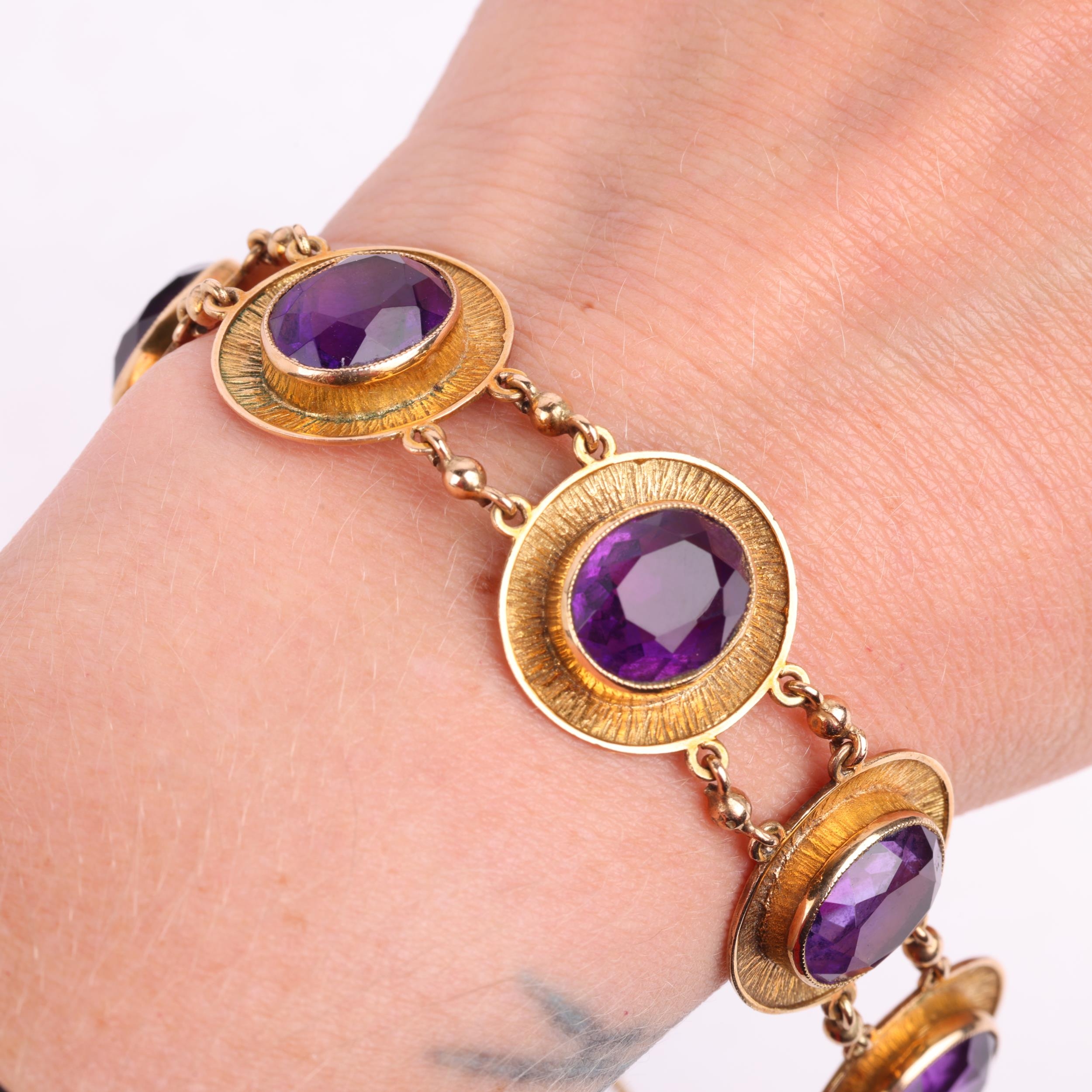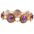 A 1970s 9ct gold amethyst panel bracelet, maker JR, Birmingham 1974, each oval panel rub-over set with oval mixed-cut amethyst within textured surround, panel length 19mm, 16cm, 26.7g