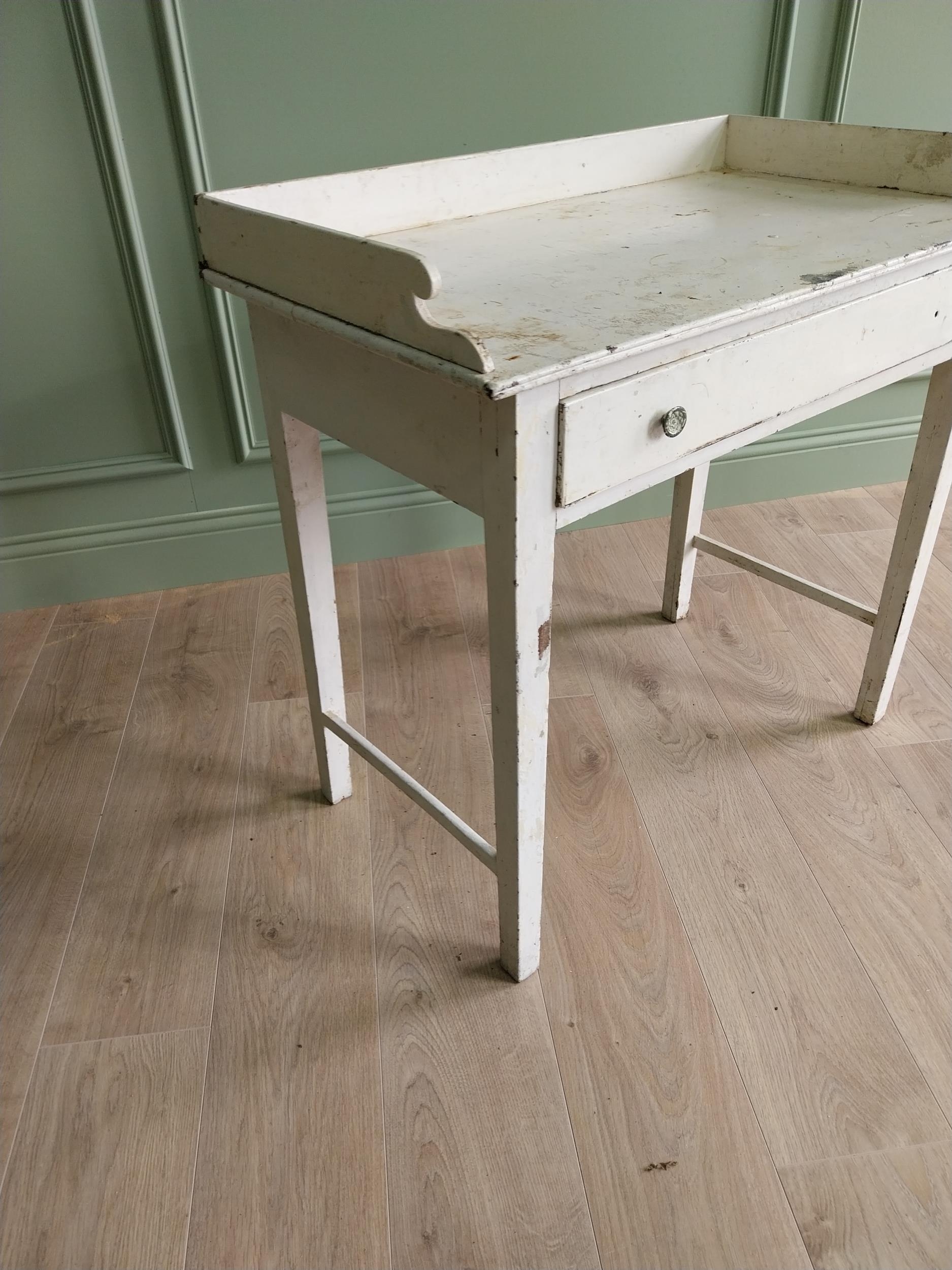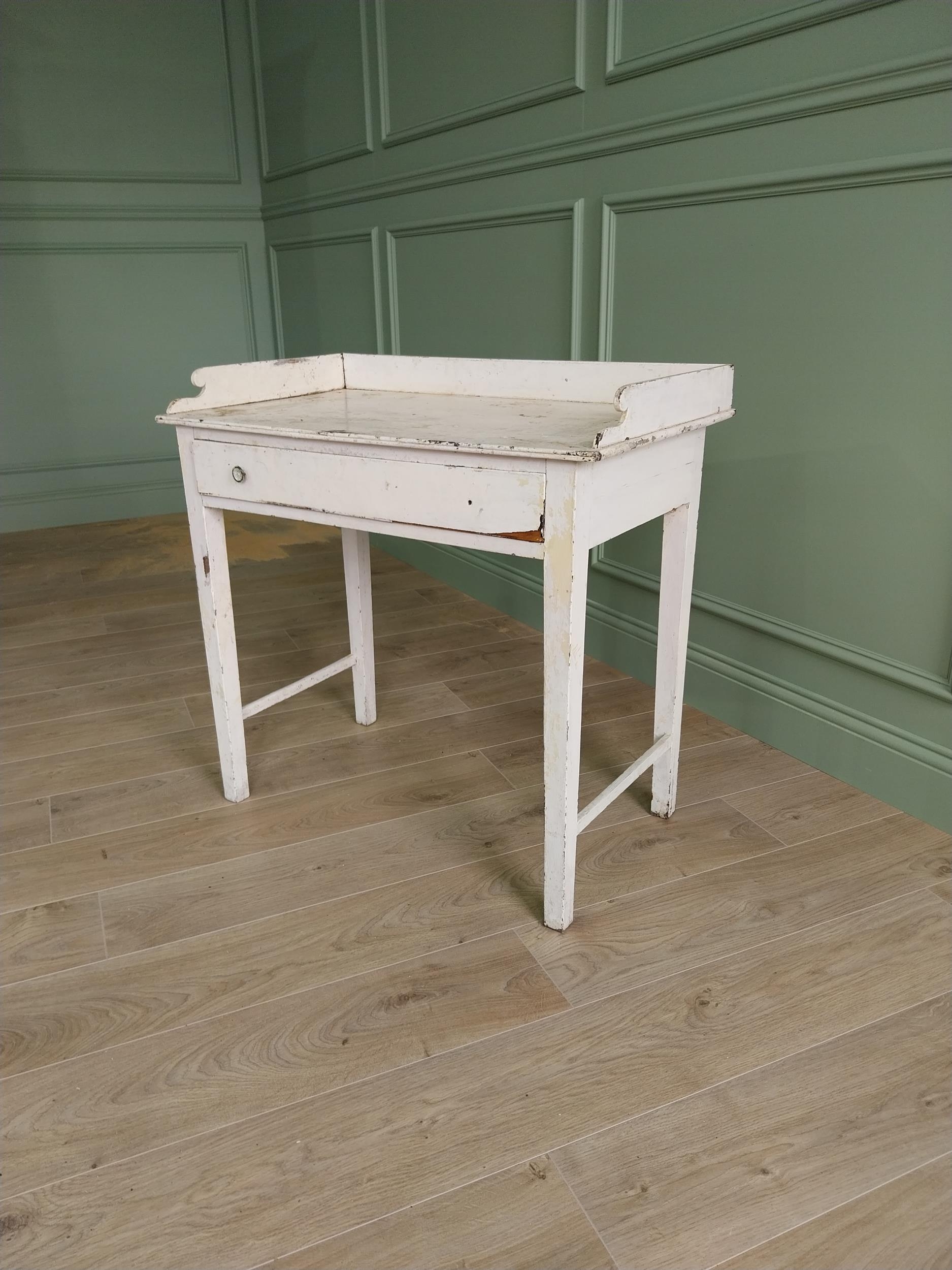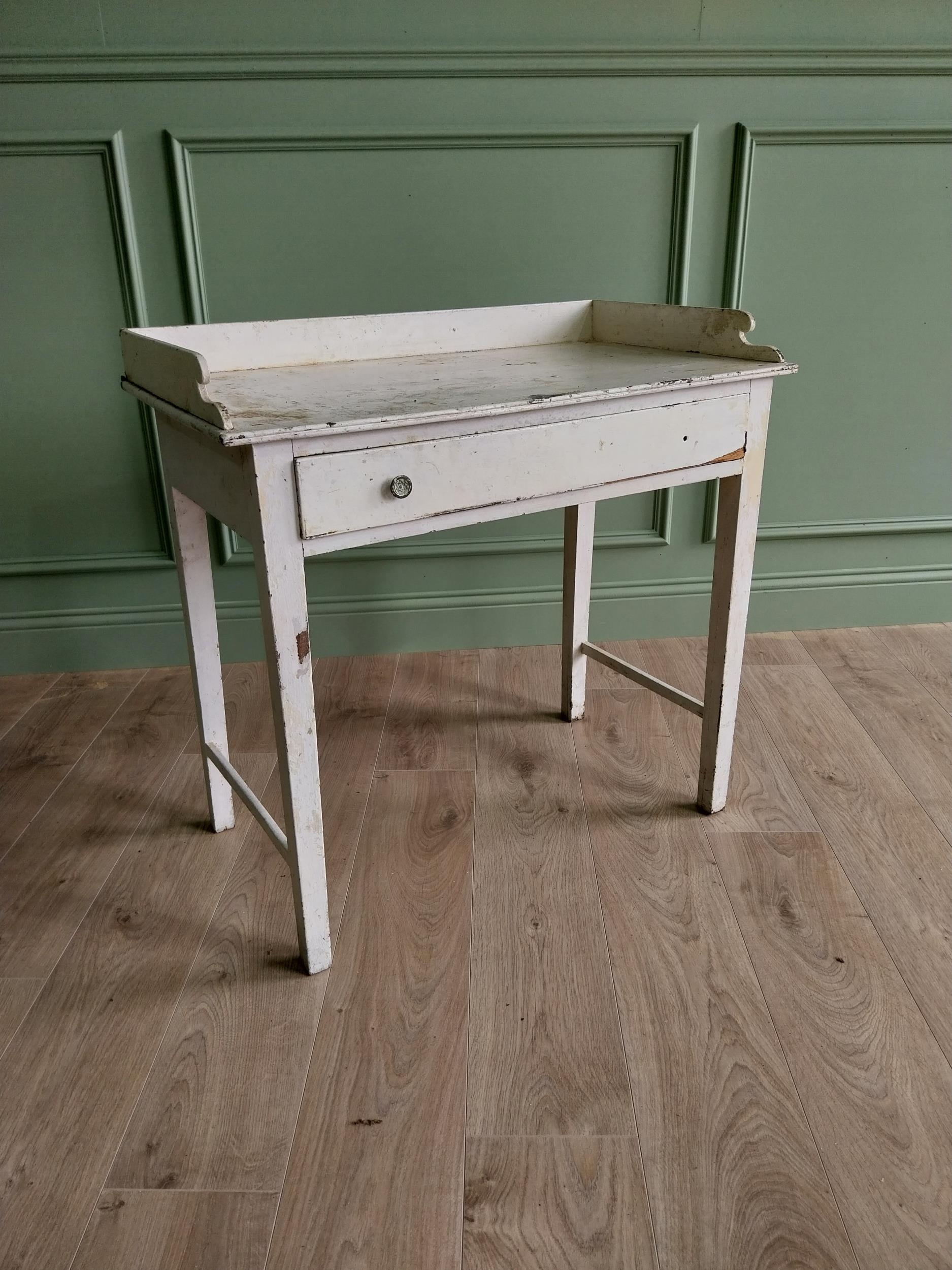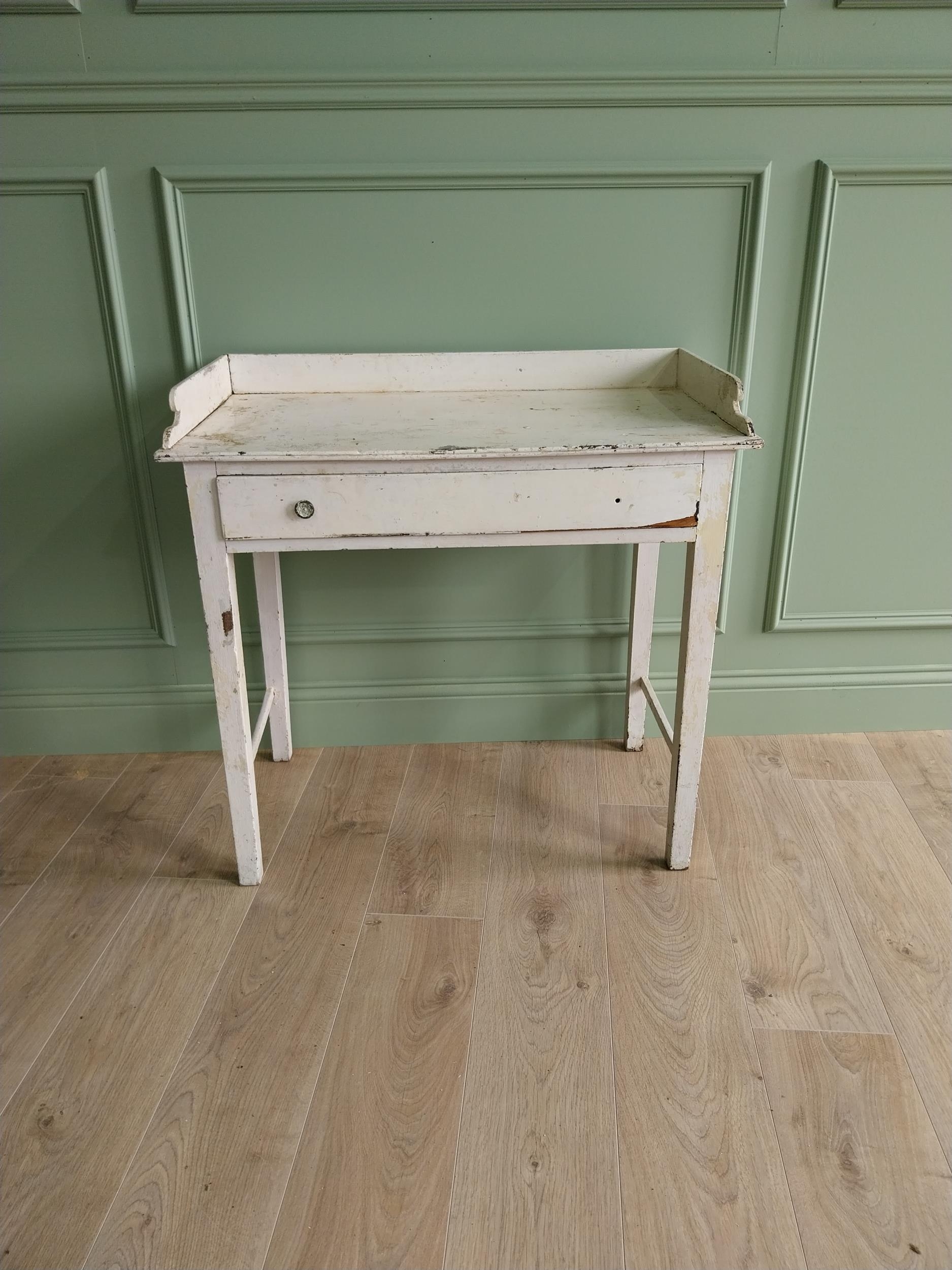 19th C. painted pine table with gallery and single drawer in the frieze raised on square tapered legs {80 cm H x 81 cm W x 46 cm D}. U