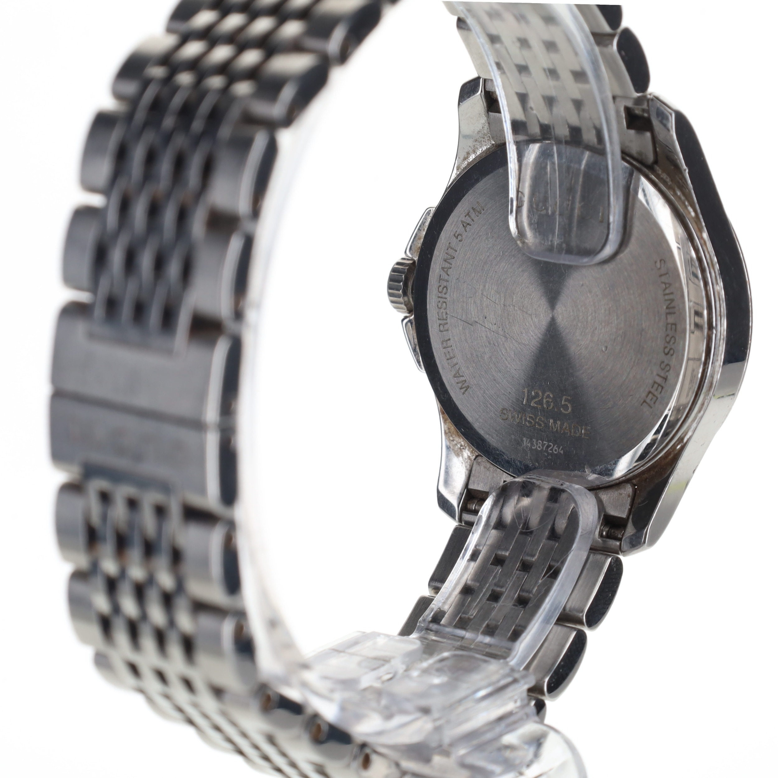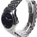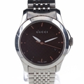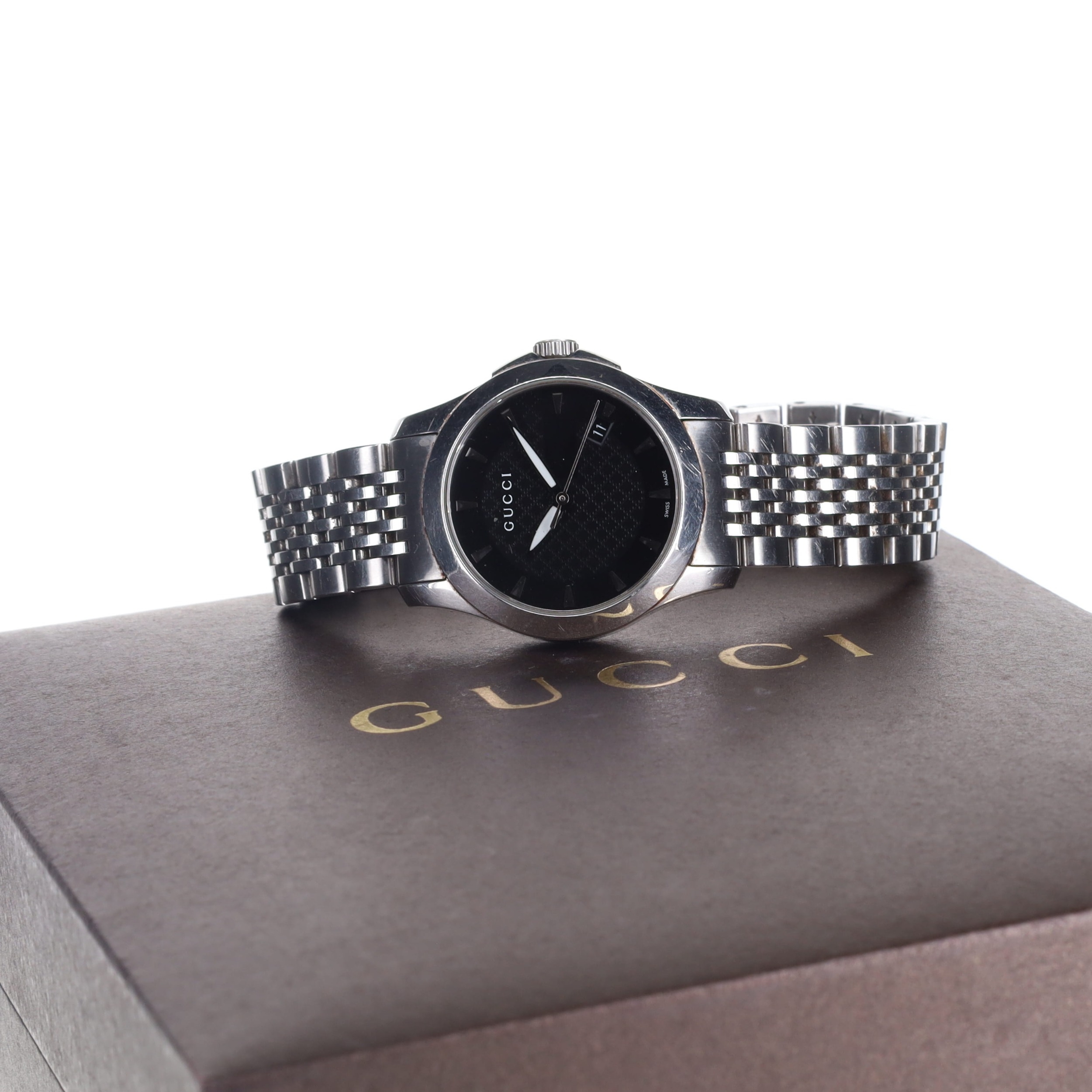 Gucci - G-Timeless Steel Quartz Watch. ETA 3 Jewel quartz movement. The case is made of stainless steel and the bracelet is also made of stainless steel. The watch has a mineral crystal. Black patterned dial with silver tone hour markers. Date window at 4 o'clock. The watch is working, with a new battery fitted. Watch comes with box and papers. 5ATM water resistance, not guaranteed. Ref. 126.5