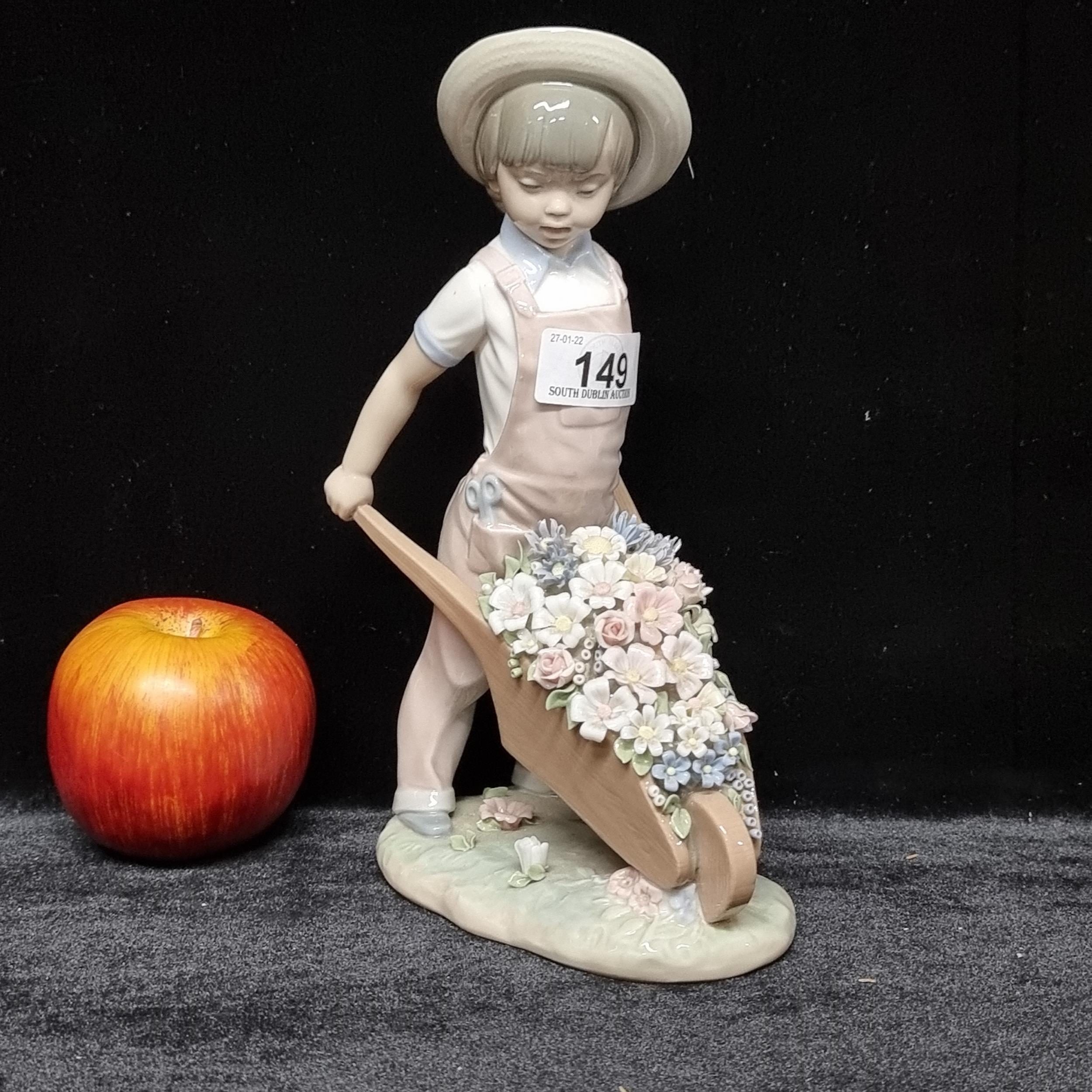 A Lladro handcrafted porcelain figure of a young boy carting a wheelbarrow filled with delicately rendered, colorful flowers. In great condition. H: 23 cm. From the fabulous antique house in Greystones.