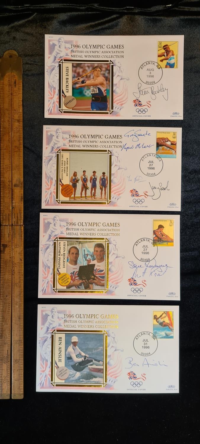 Four autographed 1996 cover of Olympic medal winners. Hand signed by Steve Backley, Rowing mens coxless fours, Steven Redgrave and Mathew Pinsent and Ben Ainslie