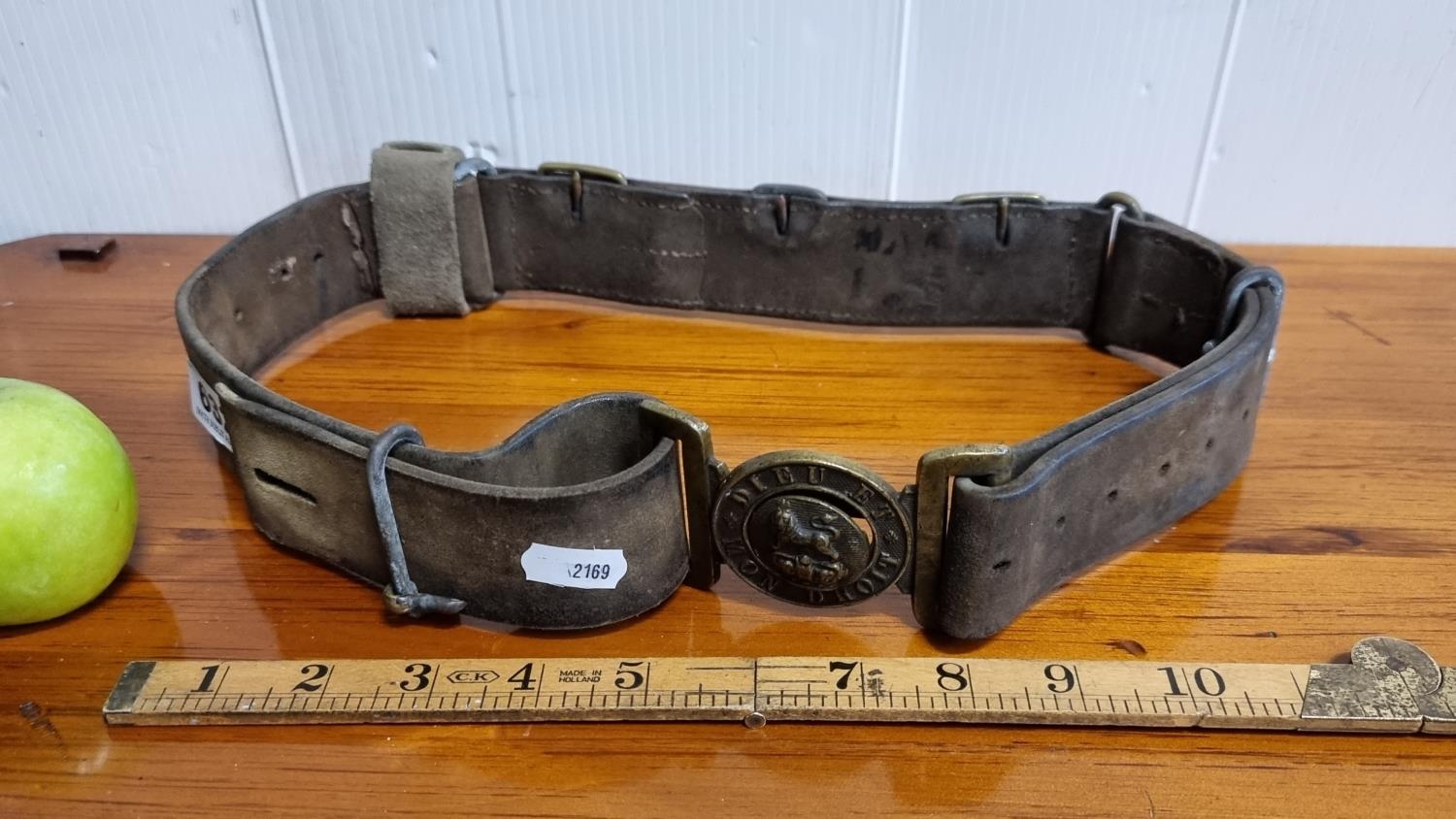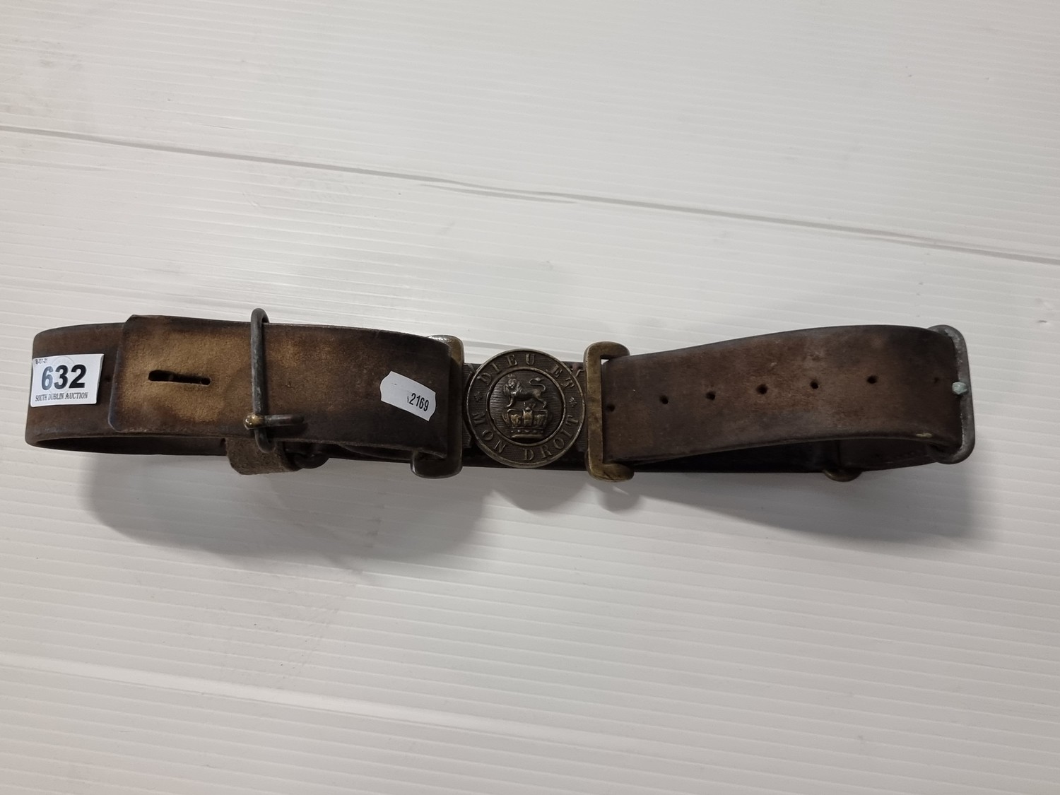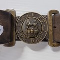 A Victorian British Army Uniform Leather Belt with a Buckle That Reads " Mon Dieu Et Droit" (God and My Right). Good original example, not messed with.