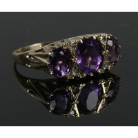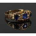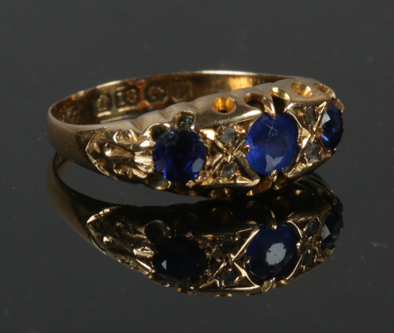 A 18ct gold blue stone & diamond ring in boat shaped setting, size N. 2.59g.